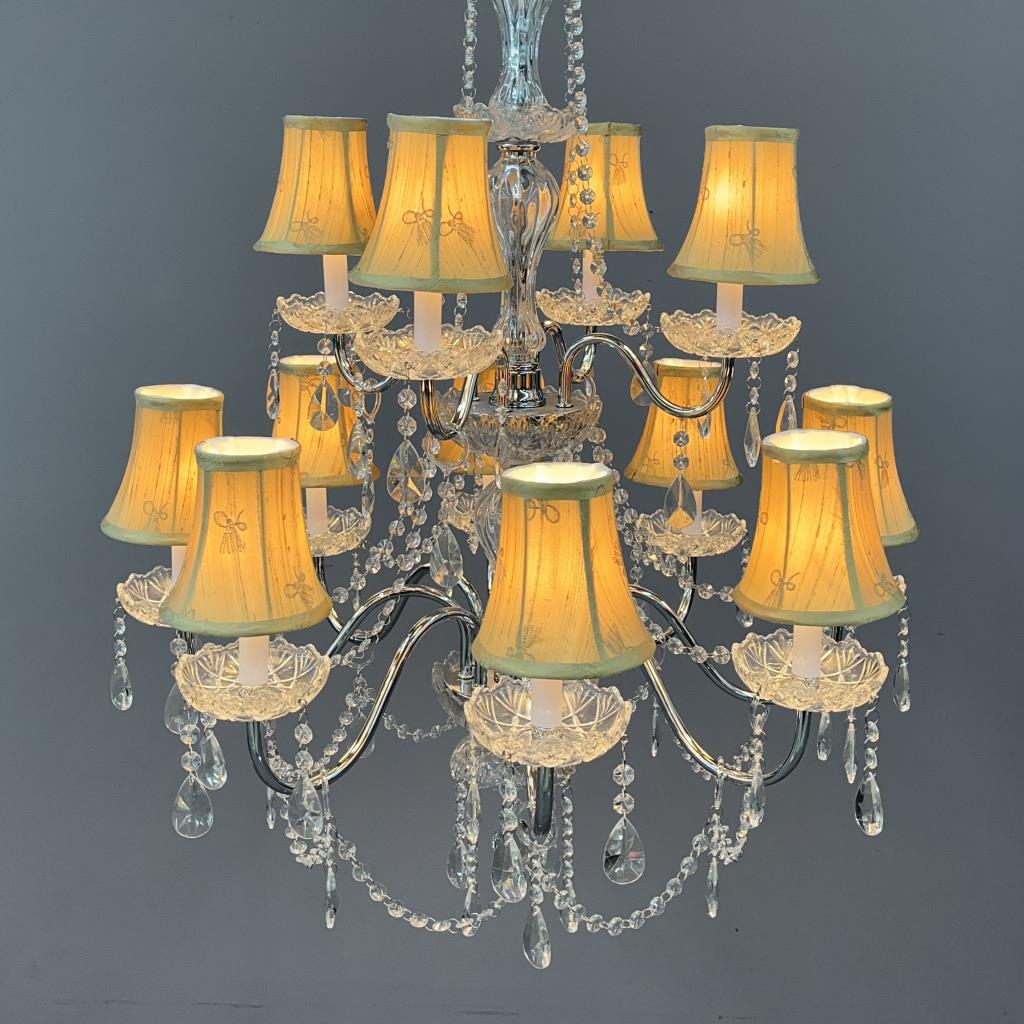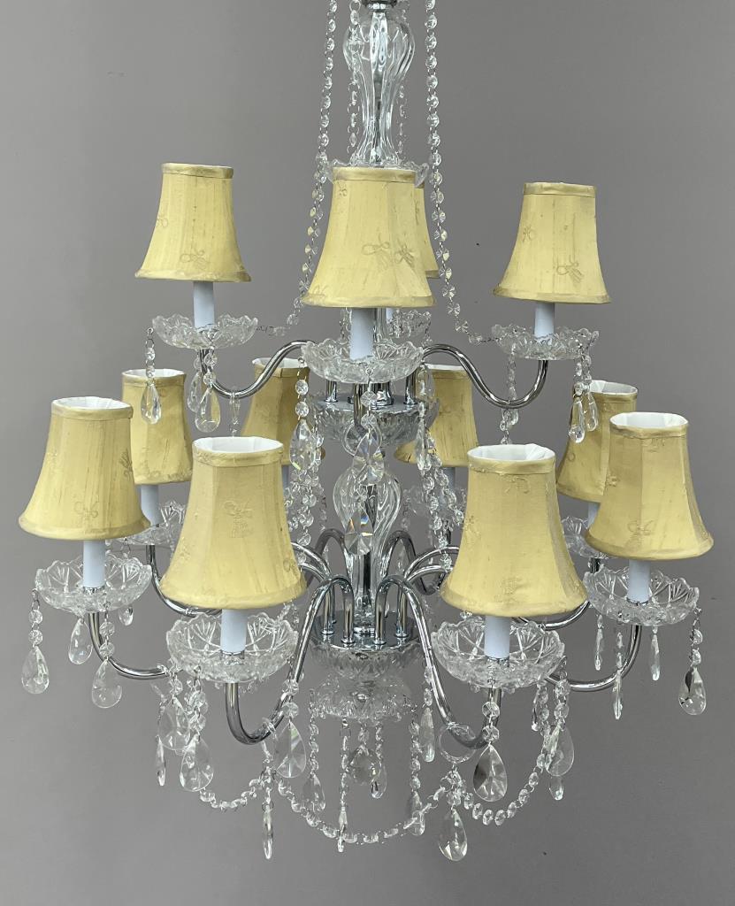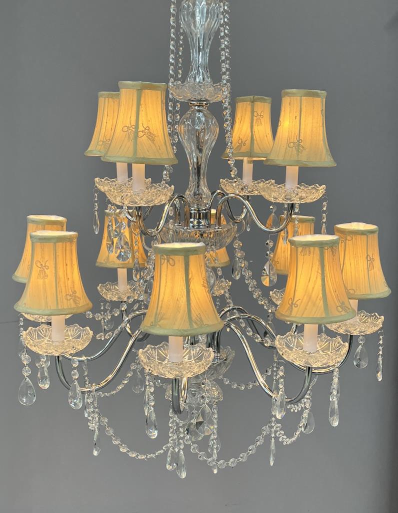 Double tier, 12 light chandelier, in the Luciana pattern, chrome plated steel and crystal, with individual taupe colored silk shades, approximately 37-3/4″ (H) x 29-1/4″ (W). CONDITION: Working at time of cataloguing. SHIPPING: Local pick-up or third party shipping only for this lot. Please see the Shipping Policy for information on suggested shippers. We recommend the Pak Mail Store of Battle Creek to assist you. Please contact the shipper of your choice for shipping estimates on this lot. Refer to the Shipping section in our full Terms and Conditions for all information on shipping.