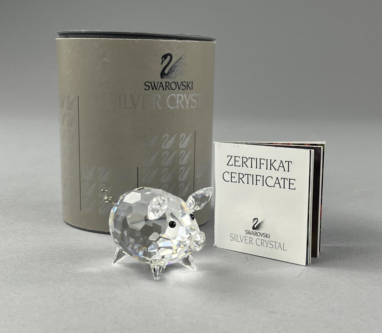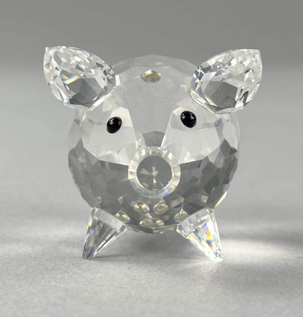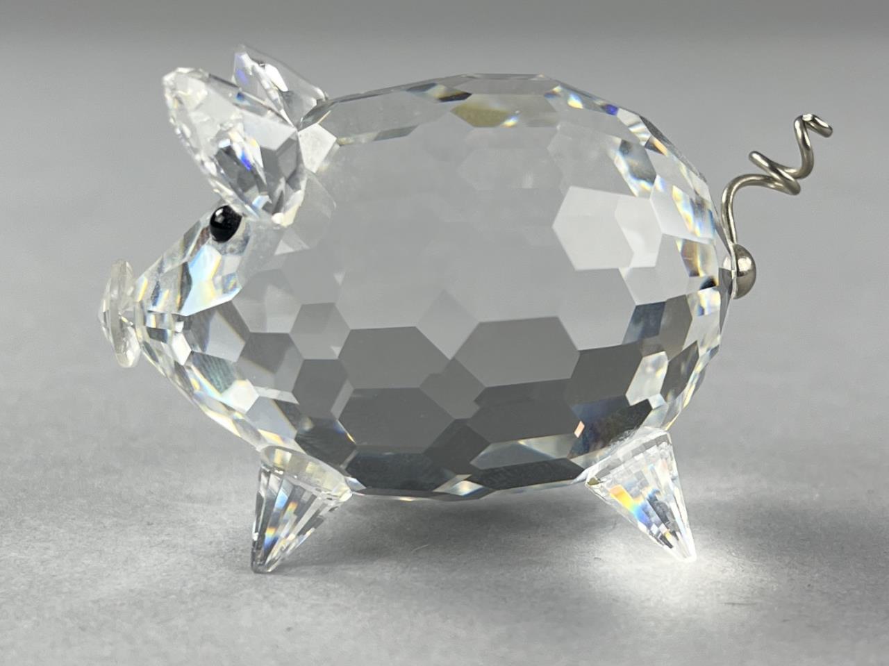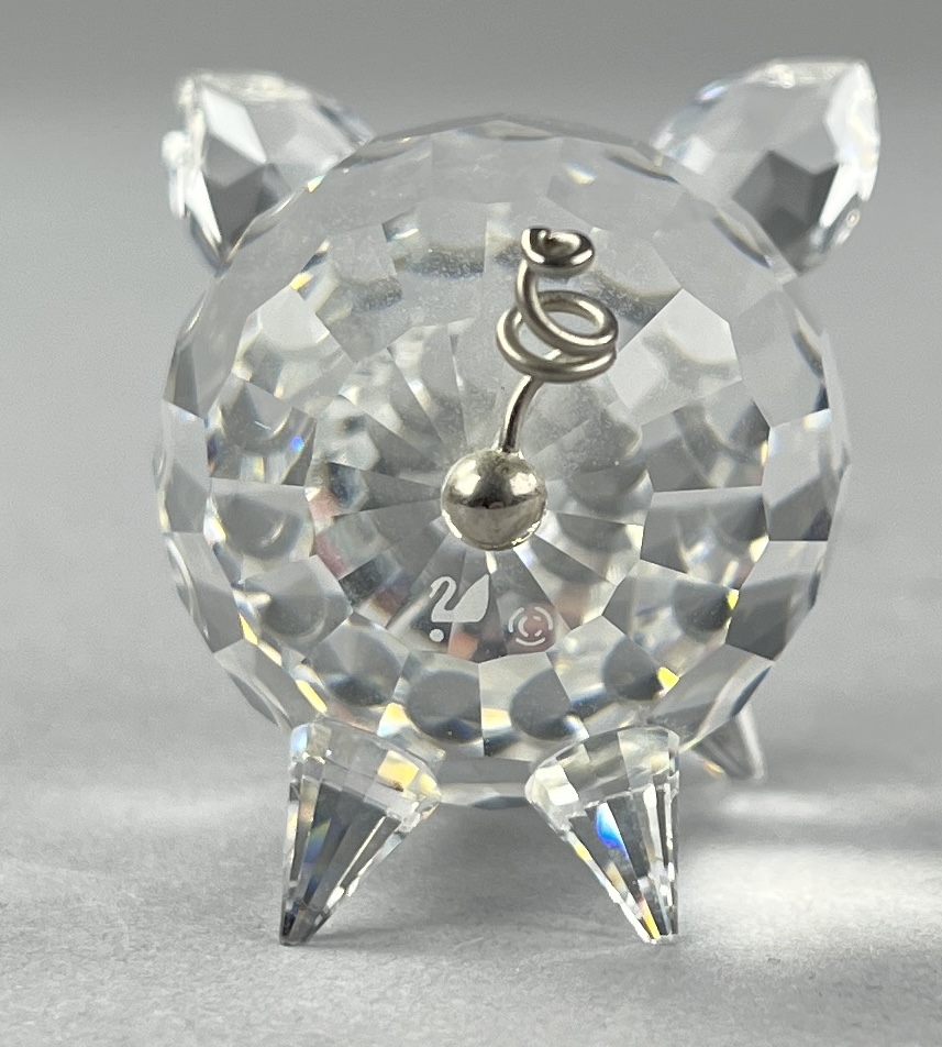 Swarovski crystal medium pig figure, Art. 7638 No. 050 000, with curly wire tail, introduced in 1982 as part of the Barnyard Friends Collection, made in Austria, etched Swarovski logo under tail, includes original box and certificate of authenticity, approximately 2″ x 1-1/2″ x 1-1/4″. CONDITION: SHIPPING: In-House Shipping Available. Please read our Shipping Policies and Terms and Conditions