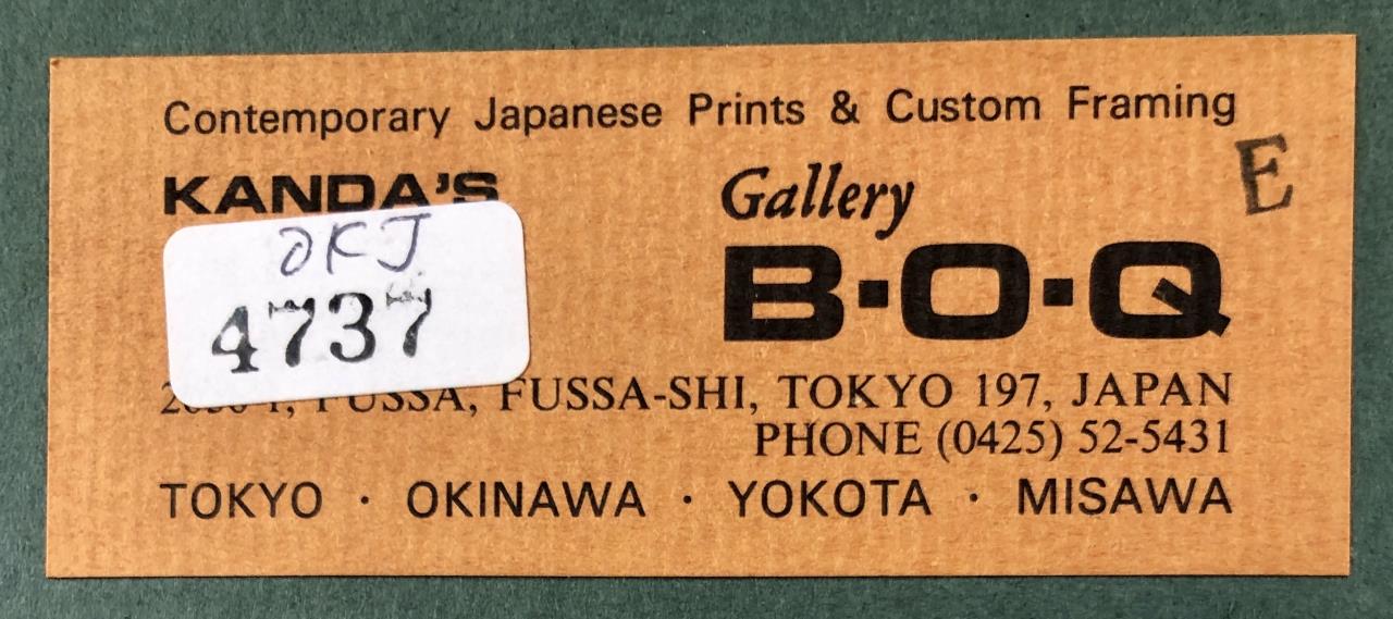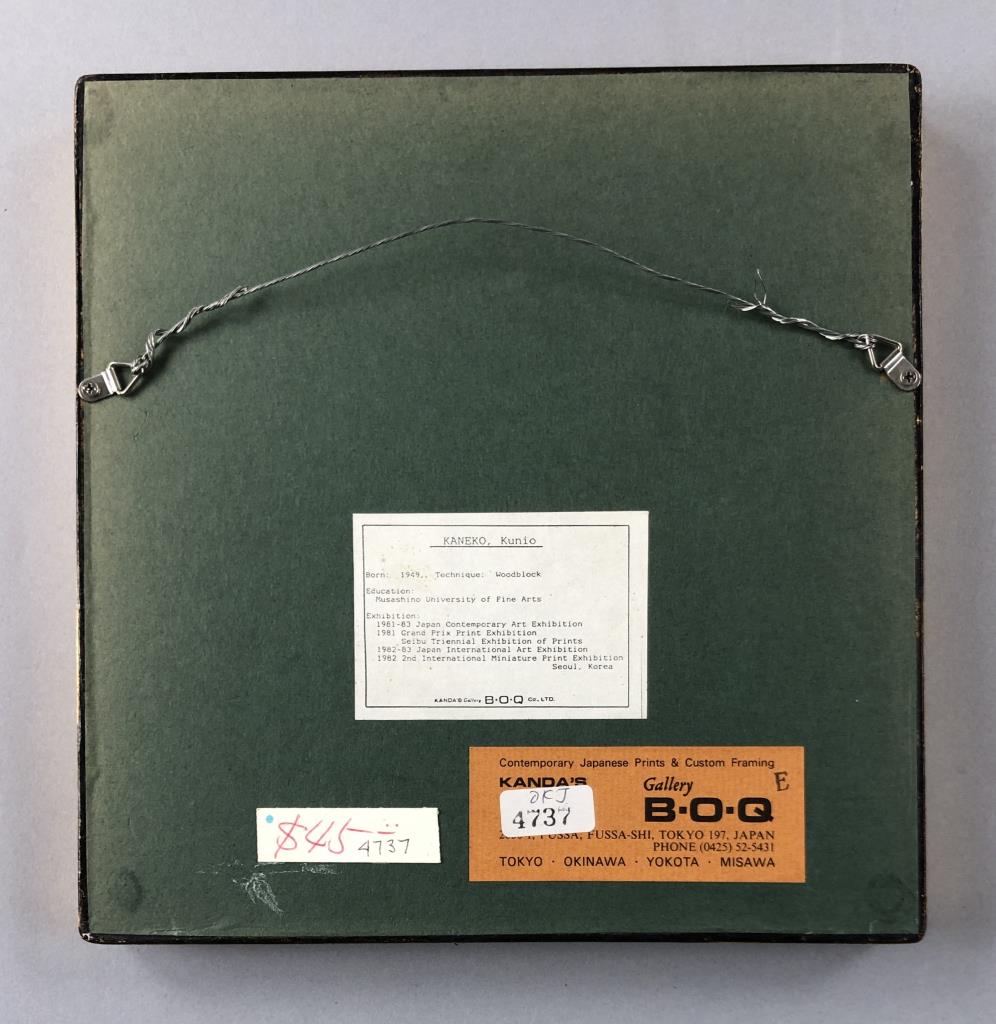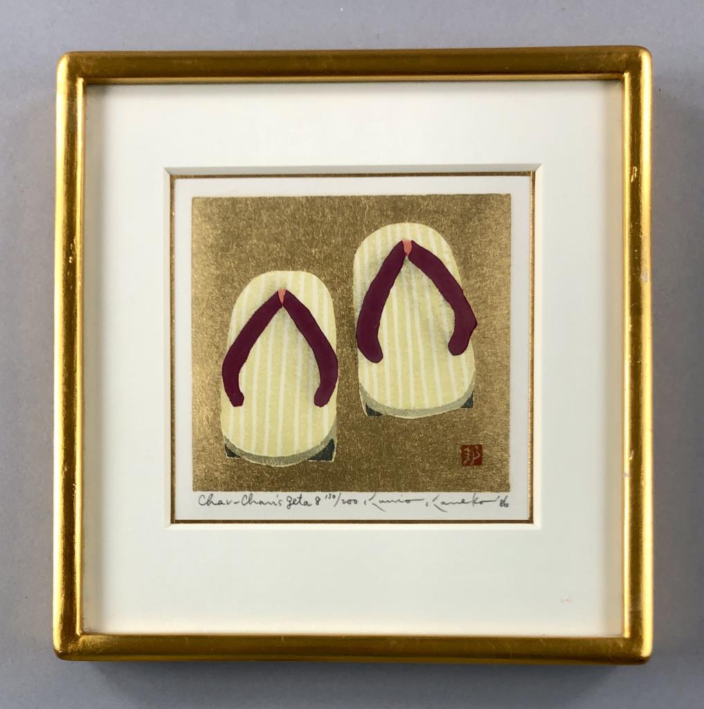 Pair of Kunio Kaneko (Japanese, B. 1949) limited edition woodblock prints of sandals, pencil signed, dated, and numbered on bottom edges, in matching gilt gesso and wood frames, both measuring approximately 8-3/4″ x 8-1/2″. Provenance: ex-private Saint Johns, Michigan, USA collection; Kanda’s Gallery BOQ, Tokyo, Japan, 6/1988. Original receipts, bills of sale, invoices, or other similar documents of purchase or ownership may not necessarily be included even when pictured and are only shown to help better establish the provenance of a piece. CONDITION: Not examined out of frames, some scratching and loss of gilt gesso to frames. SHIPPING: In-House Shipping Available. Please read our Shipping Policies and Terms and Conditions