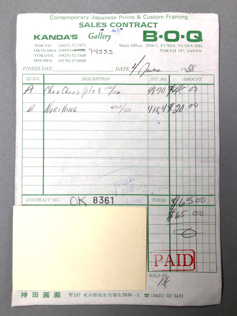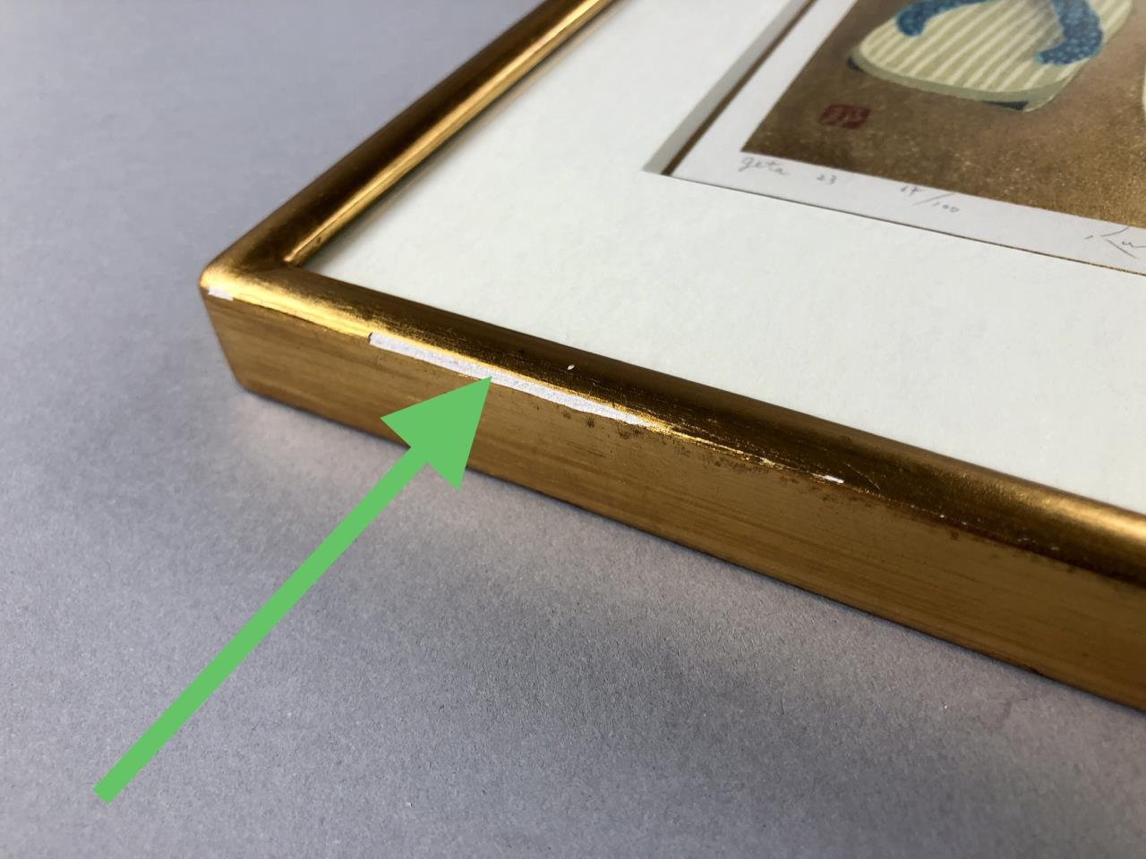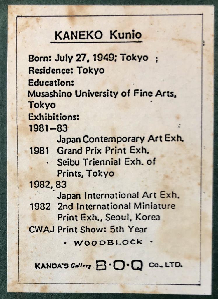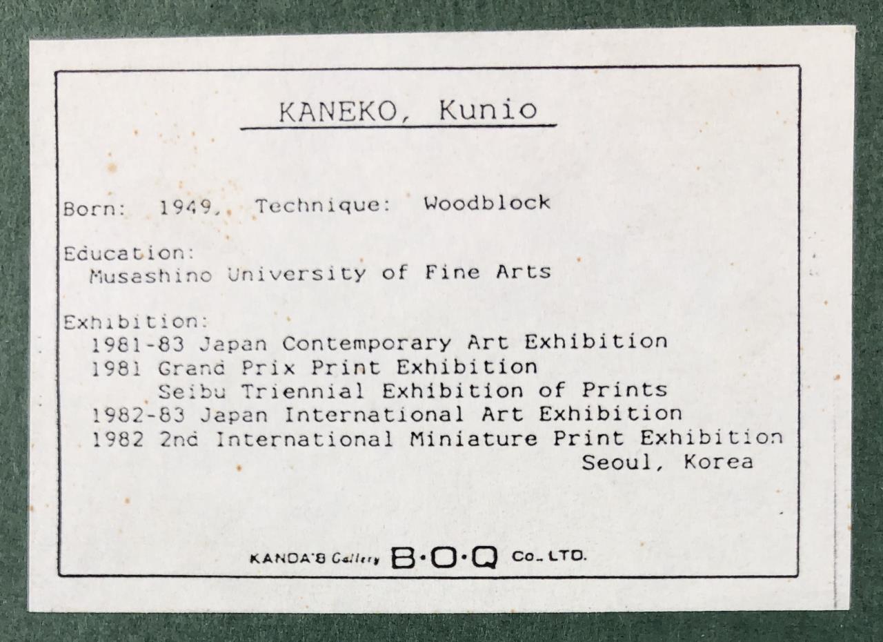 Pair of Kunio Kaneko (Japanese, B. 1949) limited edition woodblock prints of sandals, pencil signed, dated, and numbered on bottom edges, in matching gilt gesso and wood frames, both measuring approximately 8-3/4″ x 8-1/2″. Provenance: ex-private Saint Johns, Michigan, USA collection; Kanda’s Gallery BOQ, Tokyo, Japan, 6/1988. Original receipts, bills of sale, invoices, or other similar documents of purchase or ownership may not necessarily be included even when pictured and are only shown to help better establish the provenance of a piece. CONDITION: Not examined out of frames, some scratching and loss of gilt gesso to frames. SHIPPING: In-House Shipping Available. Please read our Shipping Policies and Terms and Conditions