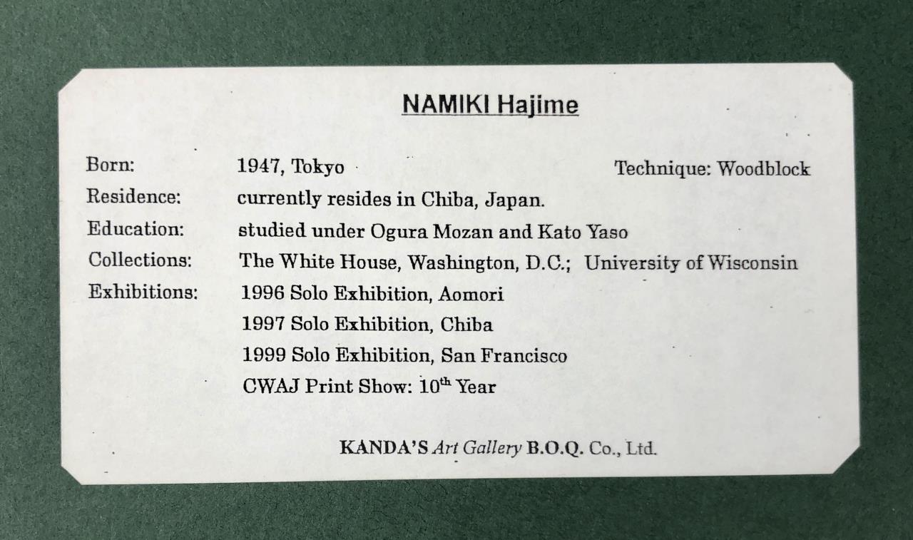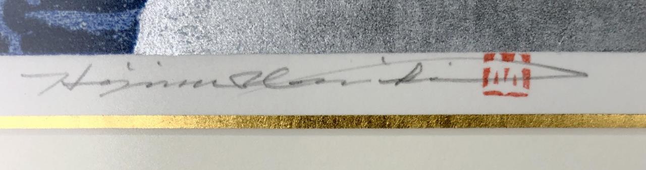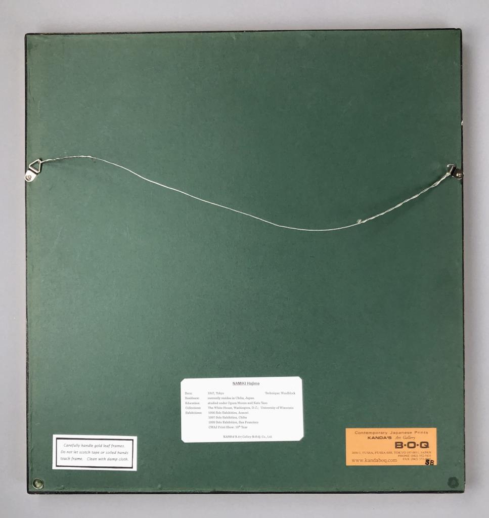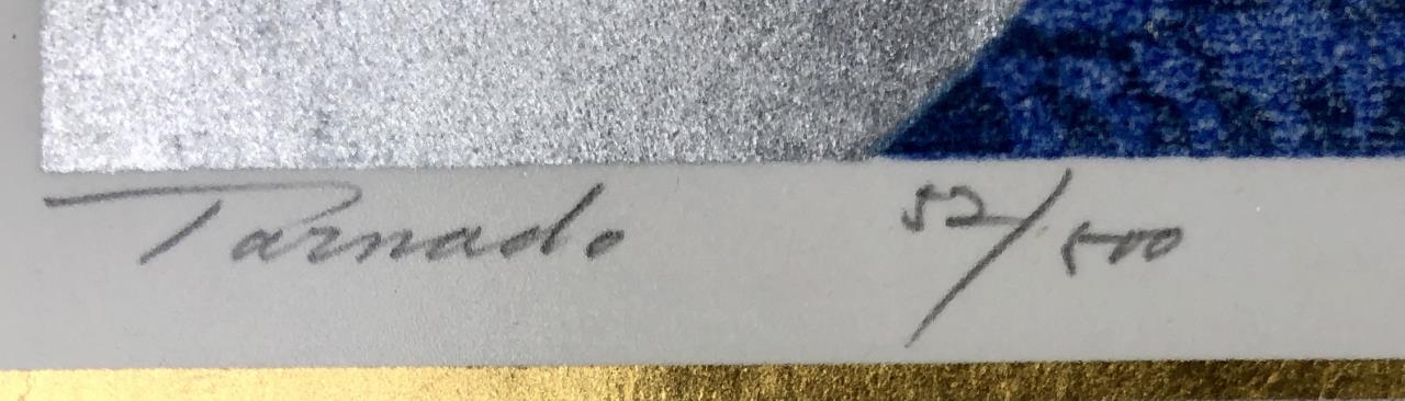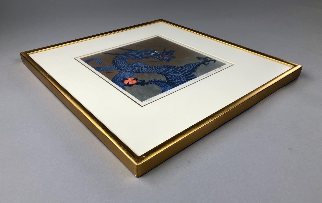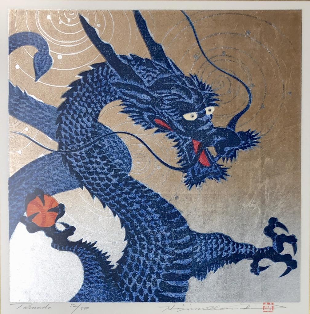 Japanese limited edition woodblock print by Hajime Namiki (Japanese, B. 1947), titled “Tornado,” depicting a dragon about to throw a baseball, pencil titled, signed, and numbered 52/500 on lower edge, circa 2005, in a gilt and gesso frame measuring approximately, 17-1/4″ x 16-5/8″. CONDITION: Not examined out of frame. SHIPPING: In-House Shipping Available. Please read our Shipping Policies and Terms and Conditions