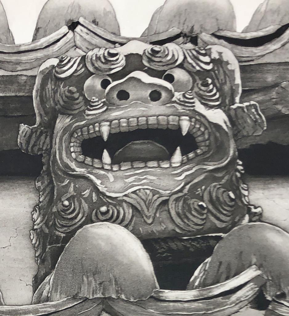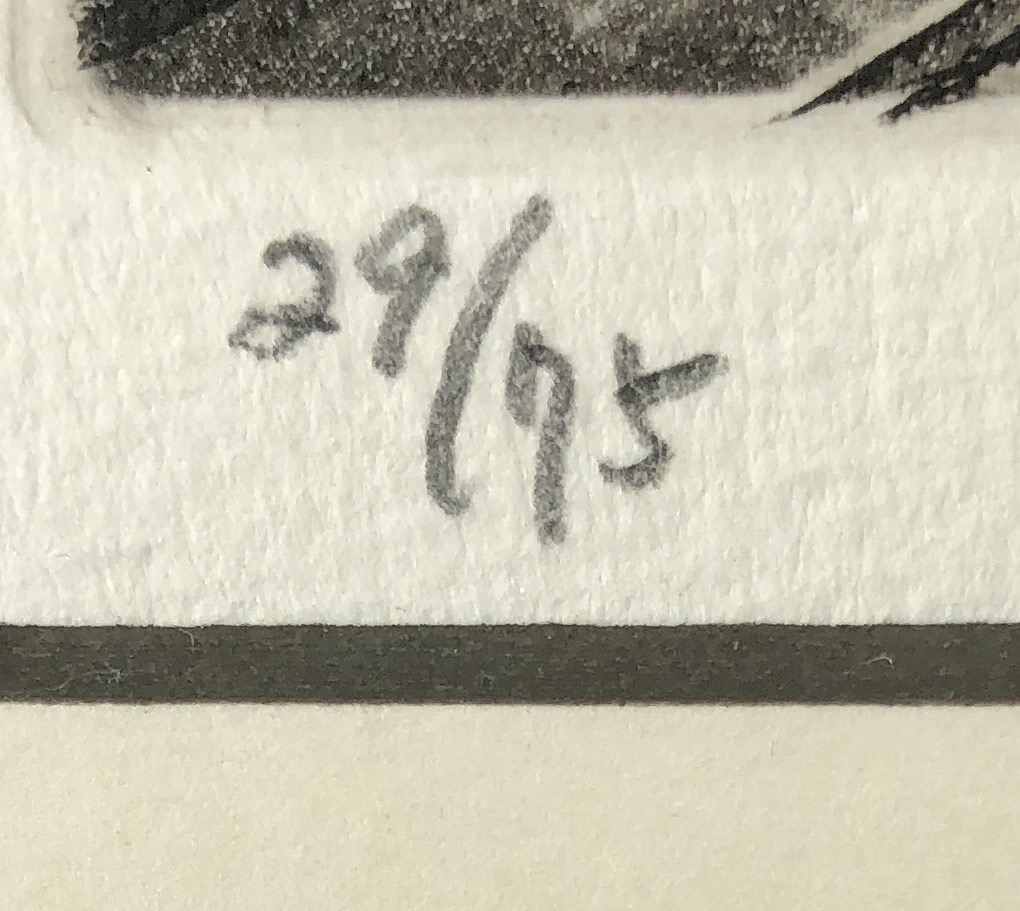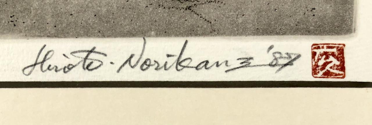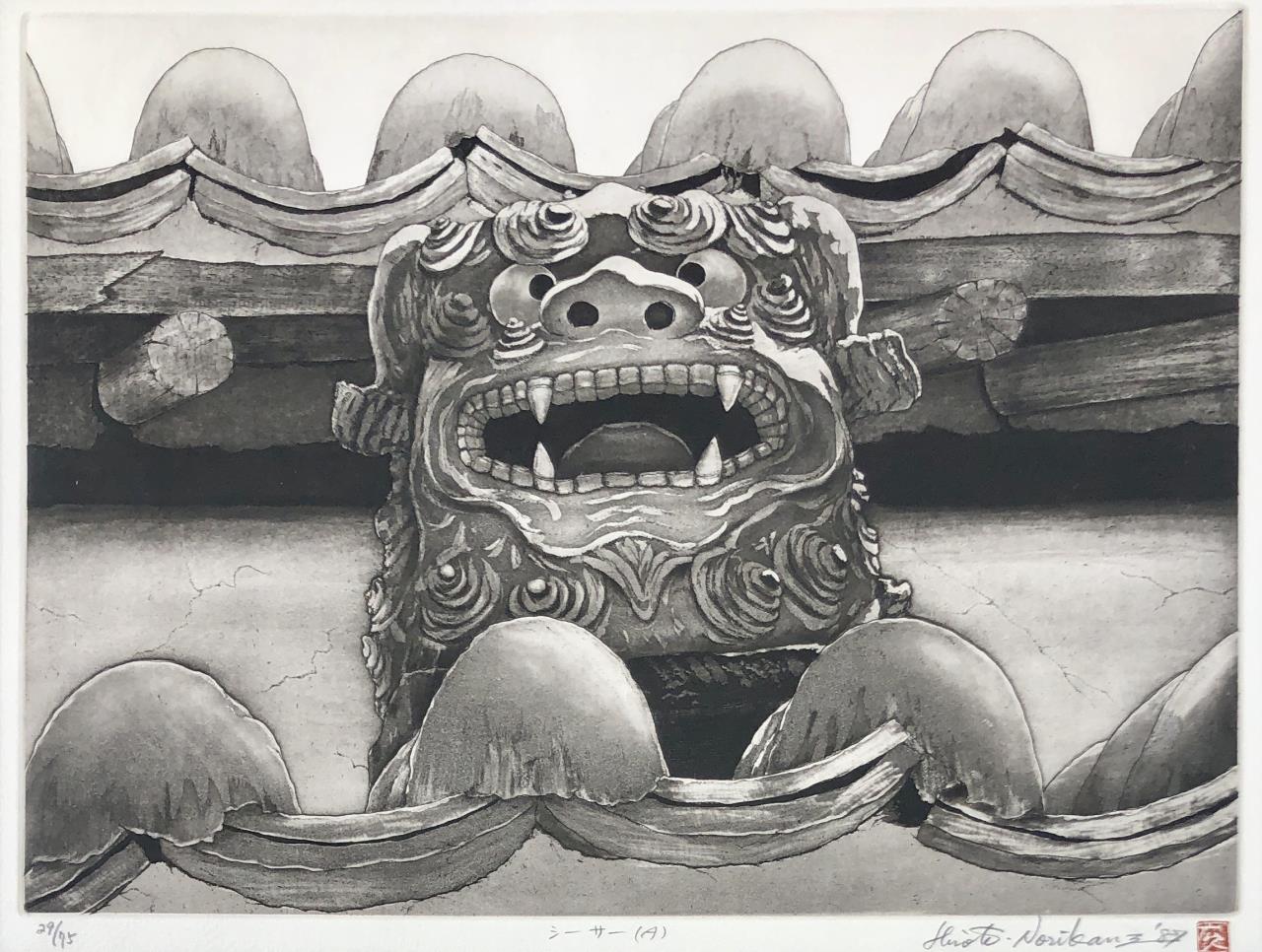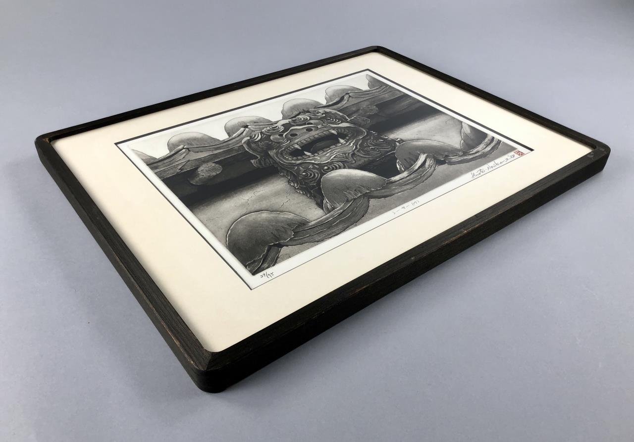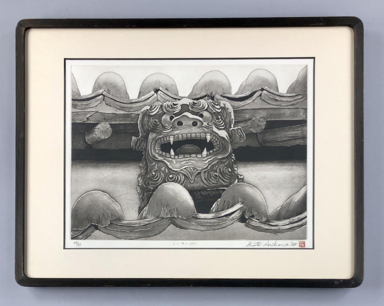 Framed limited edition etching of an Okinawa Shisa figure by Hiroto Norikane (Japanese, B. 1949), pencil signed, titled, and numbered (29/75) on lower edge, in a traditional Japanese dark wood frame, measuring approximately 18-1/4″ x 23-5/8″. Provenance: ex-private Saint Johns, Michigan, USA collection; Kanda’s Gallery BOQ, Tokyo, Japan, 4/1982. Original receipts, bills of sale, invoices, or other similar documents of purchase or ownership may not necessarily be included even when pictured and are only shown to help better establish the provenance of a piece. CONDITION: Not examined out of frame. SHIPPING: In-House Shipping Available. Please read our Shipping Policies and Terms and Conditions