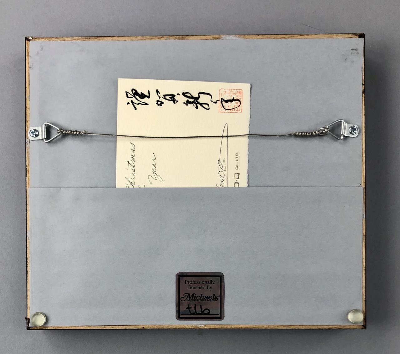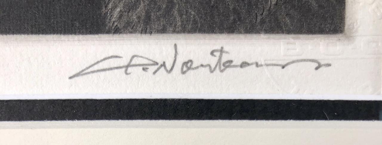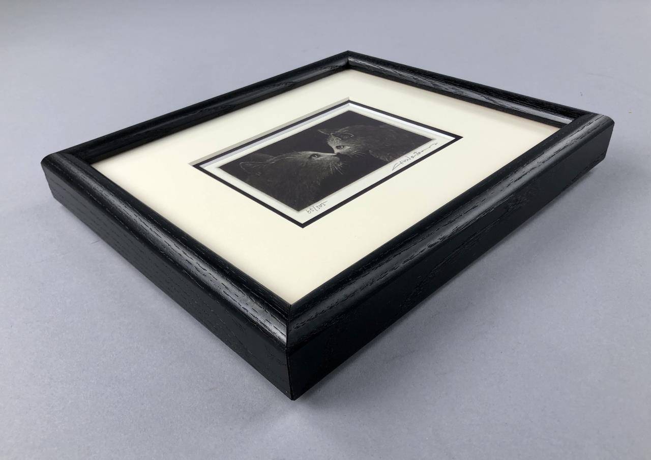Framed limited edition etching of two cats, by Hiroto Norikane (Japanese, B. 1949), impressed gallery seal lower right, pencil signed lower right, and numbered (65/505) lower left, in a black stained wood frame, measuring approximately 9-1/16″ x 10-7/16″. Provenance: ex-private Saint Johns, Michigan, USA collection; Kanda’s Gallery BOQ, Tokyo, Japan. CONDITION: Not examined out of frame, some scratching to frame. SHIPPING: In-House Shipping Available. Please read our Shipping Policies and Terms and Conditions