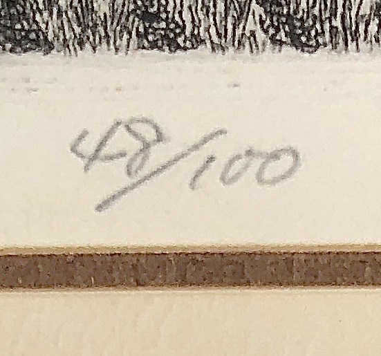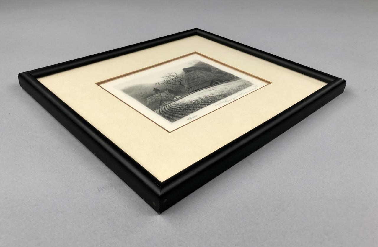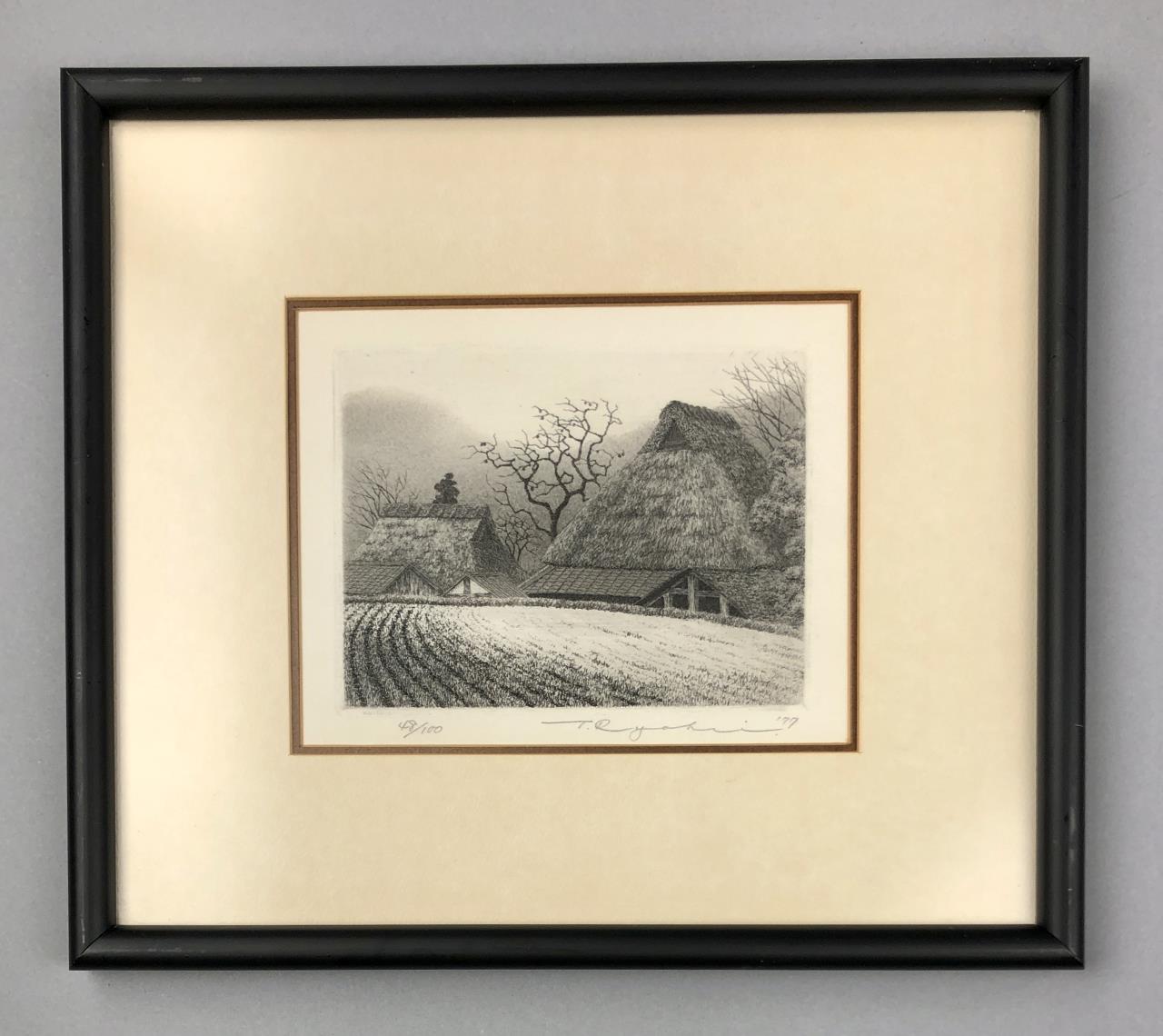 Framed artist signed limited edition etching of a traditional Japanese thatched-roof farmhouse in misty mountainous landscape, by Ryohei Tanaka (Japanese, 1933 – 2019), pencil signed by the artist and dated (1977) lower right, and numbered (48/100) lower left, possibly titled “Ohara in Autumn”, in a simple black painted wood frame, measuring approximately 9-5/16″ x 10-5/8″. Provenance: ex-private Saint Johns, Michigan, USA collection; Kanda’s Gallery BOQ, Tokyo, Japan, 1/1977. Original receipts, bills of sale, invoices, or other similar documents of purchase or ownership may not necessarily be included even when pictured and are only shown to help better establish the provenance of a piece. CONDITION: Not examined out of frame. SHIPPING: In-House Shipping Available. Please read our Shipping Policies and Terms and Conditions
