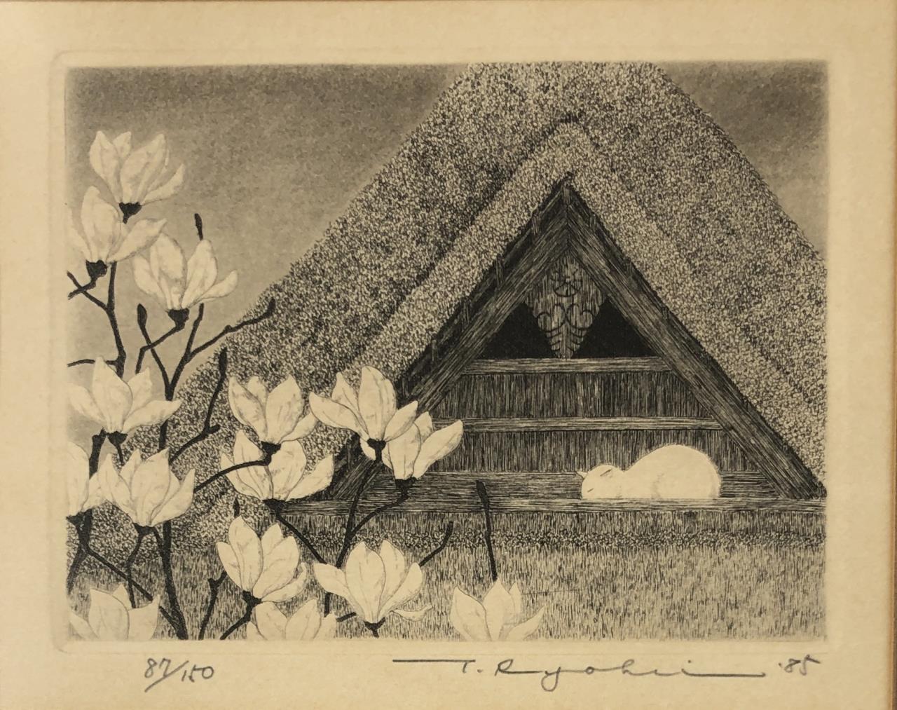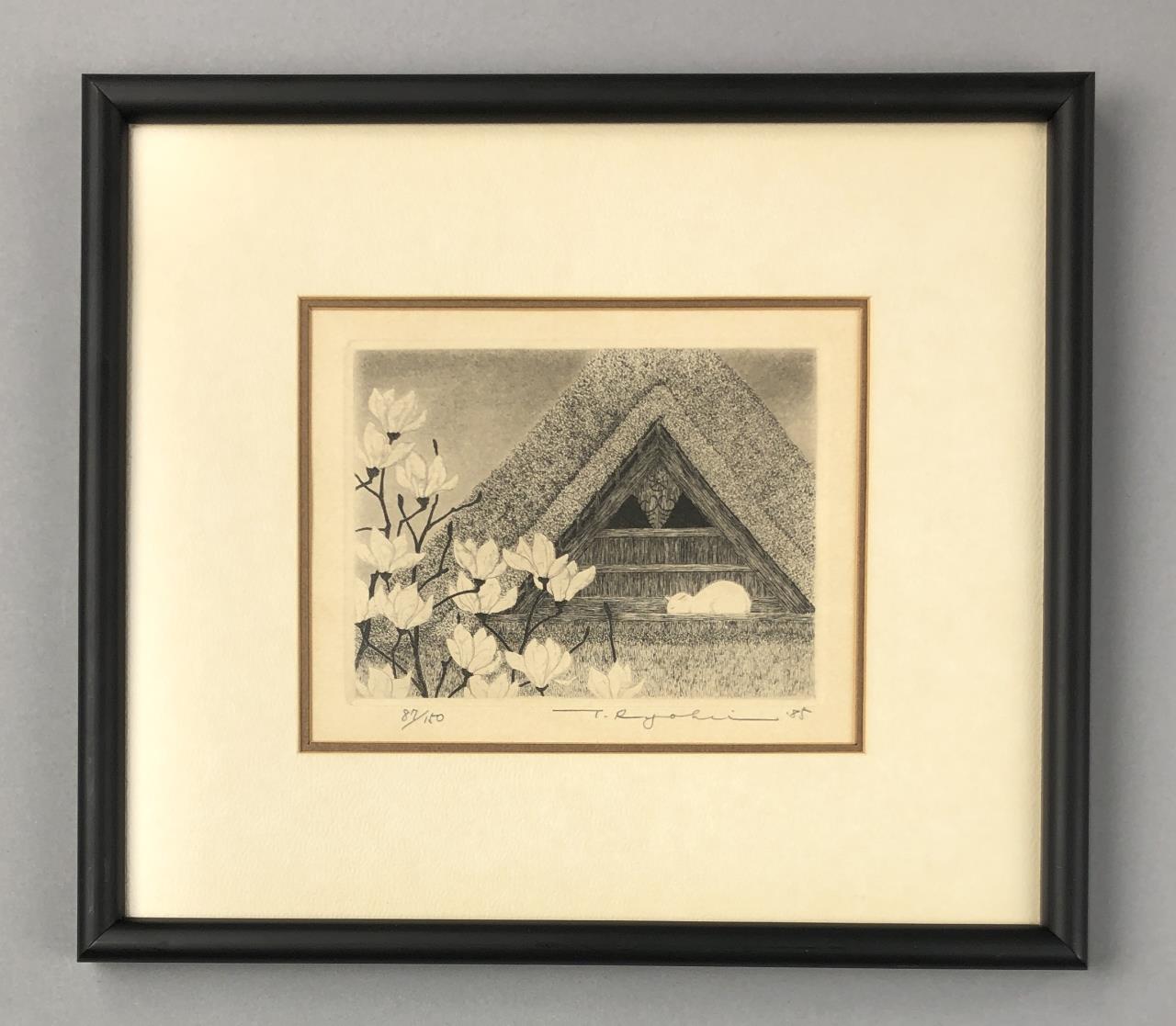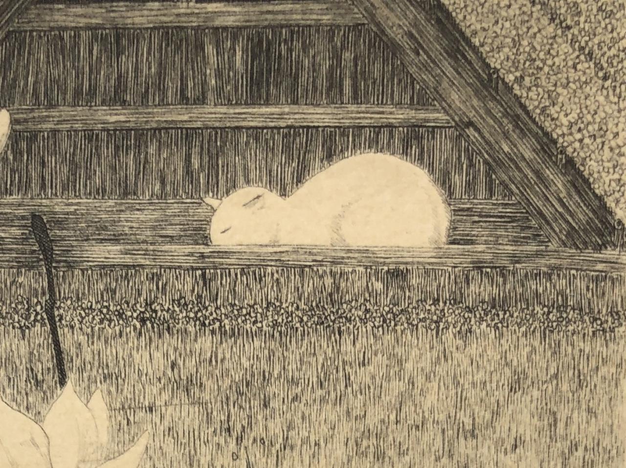 Framed artist signed limited edition etching of a white cat in the attic rafters of traditional Japanese thatched-roof building, by Ryohei Tanaka (Japanese, 1933 – 2019), pencil signed by the artist and dated (1985) lower right, and numbered (87/150) lower left, in a simple black painted wood frame, measuring approximately 9-5/16″ x 10-5/8″. Provenance: ex-private Saint Johns, Michigan, USA collection; Kanda’s Gallery BOQ, Tokyo, Japan, 10/1986. Original receipts, bills of sale, invoices, or other similar documents of purchase or ownership may not necessarily be included even when pictured and are only shown to help better establish the provenance of a piece. CONDITION: Not examined out of frame. SHIPPING: In-House Shipping Available. Please read our Shipping Policies and Terms and Conditions