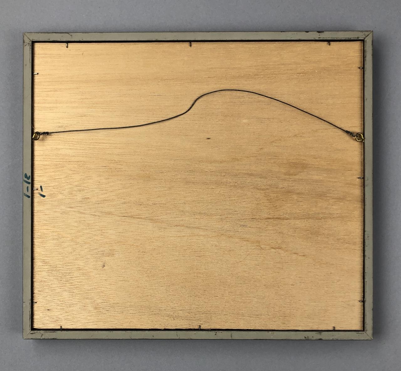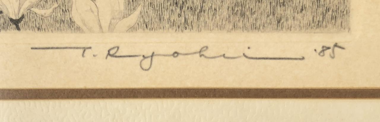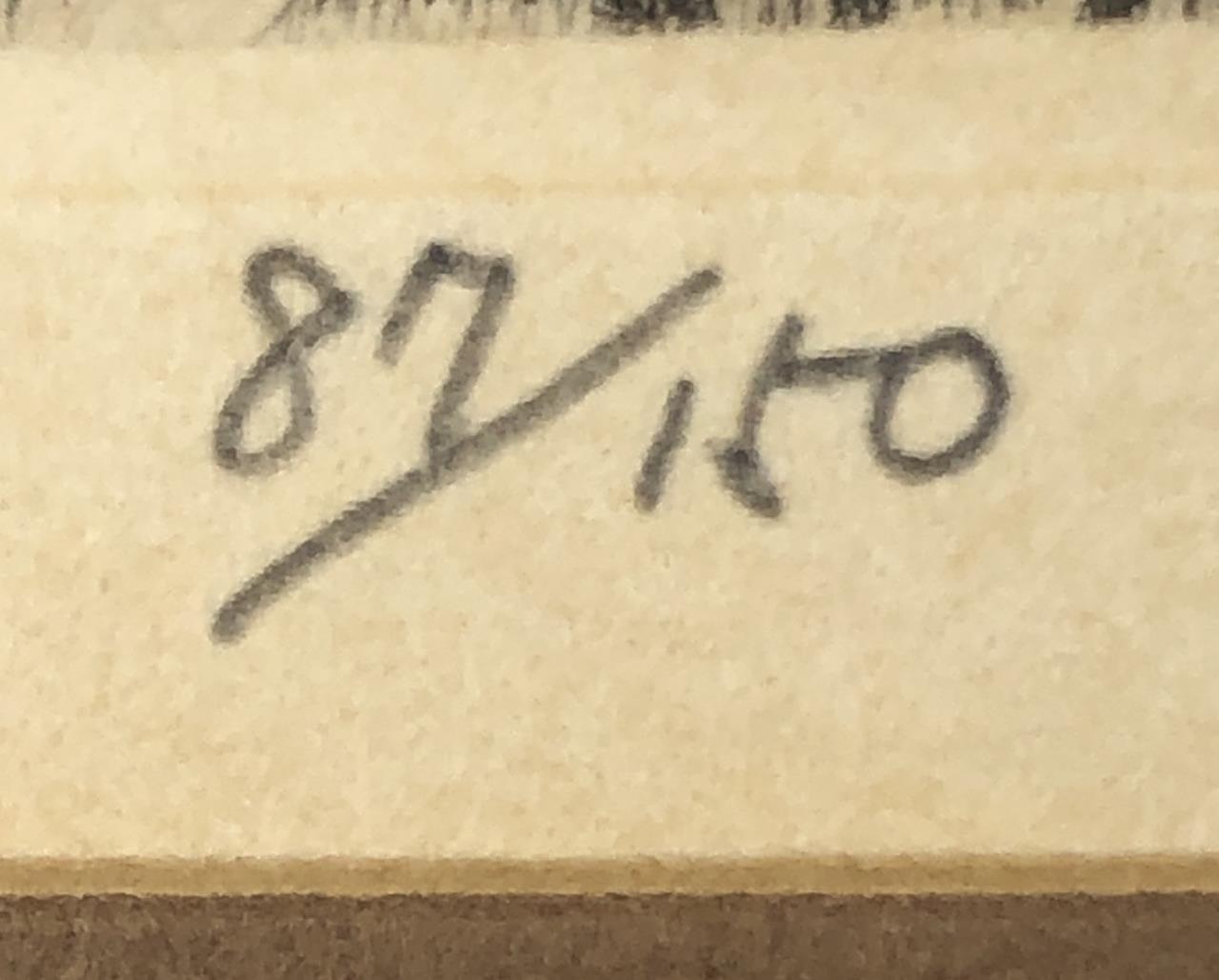 Framed artist signed limited edition etching of a white cat in the attic rafters of traditional Japanese thatched-roof building, by Ryohei Tanaka (Japanese, 1933 – 2019), pencil signed by the artist and dated (1985) lower right, and numbered (87/150) lower left, in a simple black painted wood frame, measuring approximately 9-5/16″ x 10-5/8″. Provenance: ex-private Saint Johns, Michigan, USA collection; Kanda’s Gallery BOQ, Tokyo, Japan, 10/1986. Original receipts, bills of sale, invoices, or other similar documents of purchase or ownership may not necessarily be included even when pictured and are only shown to help better establish the provenance of a piece. CONDITION: Not examined out of frame. SHIPPING: In-House Shipping Available. Please read our Shipping Policies and Terms and Conditions