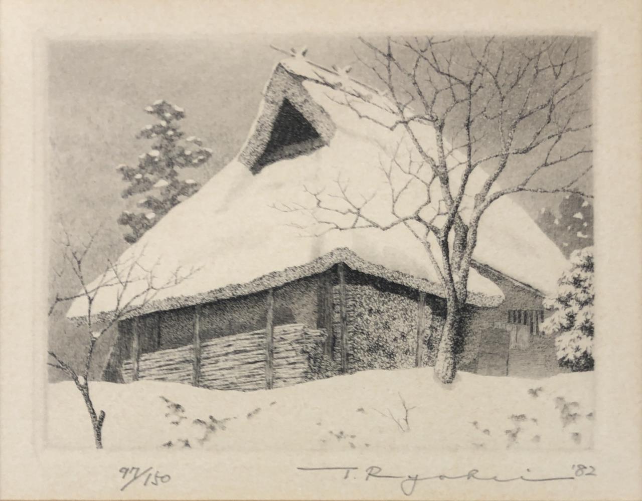 Ryohei Tanaka Etching Snow on Thatched Roof 1982