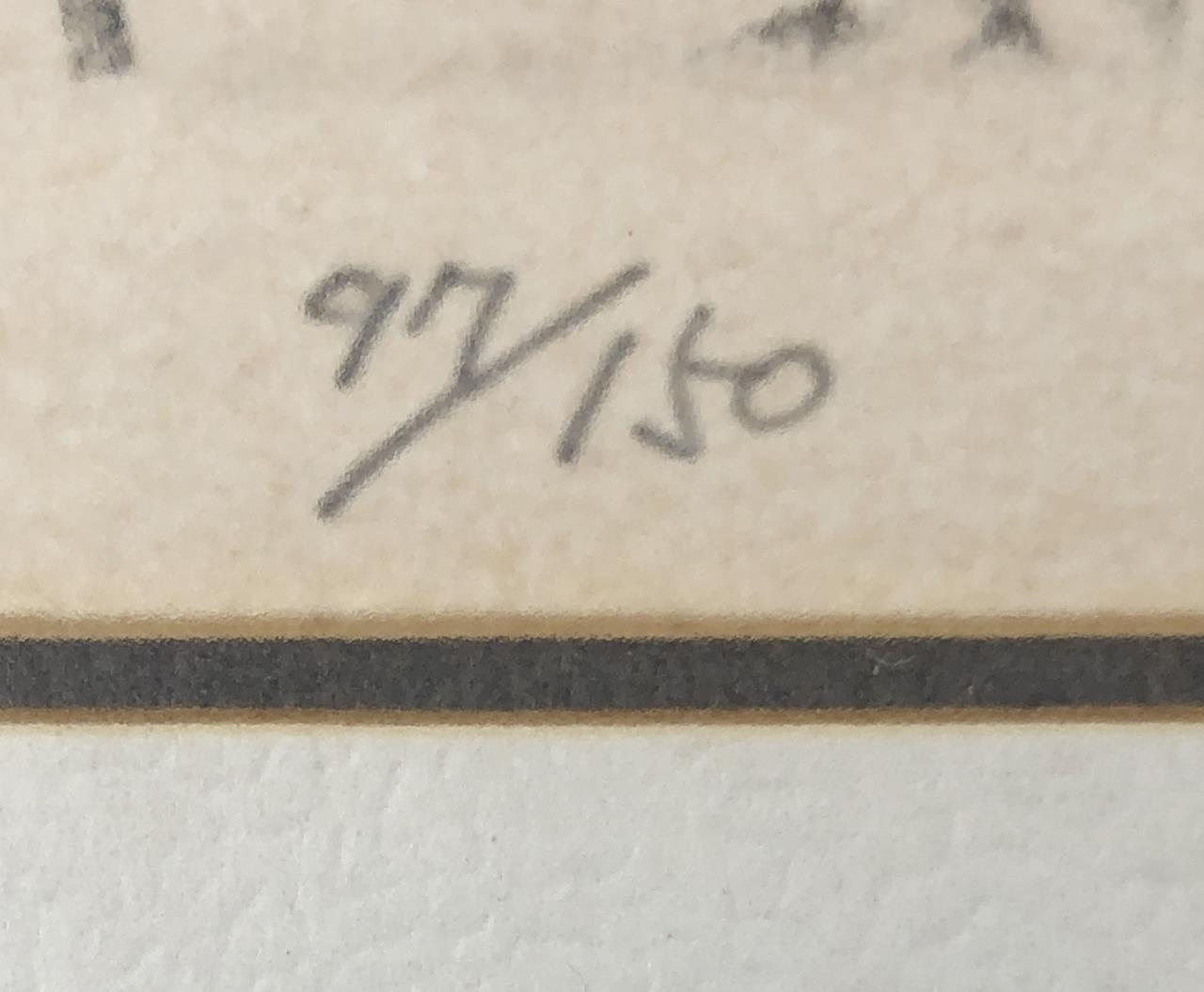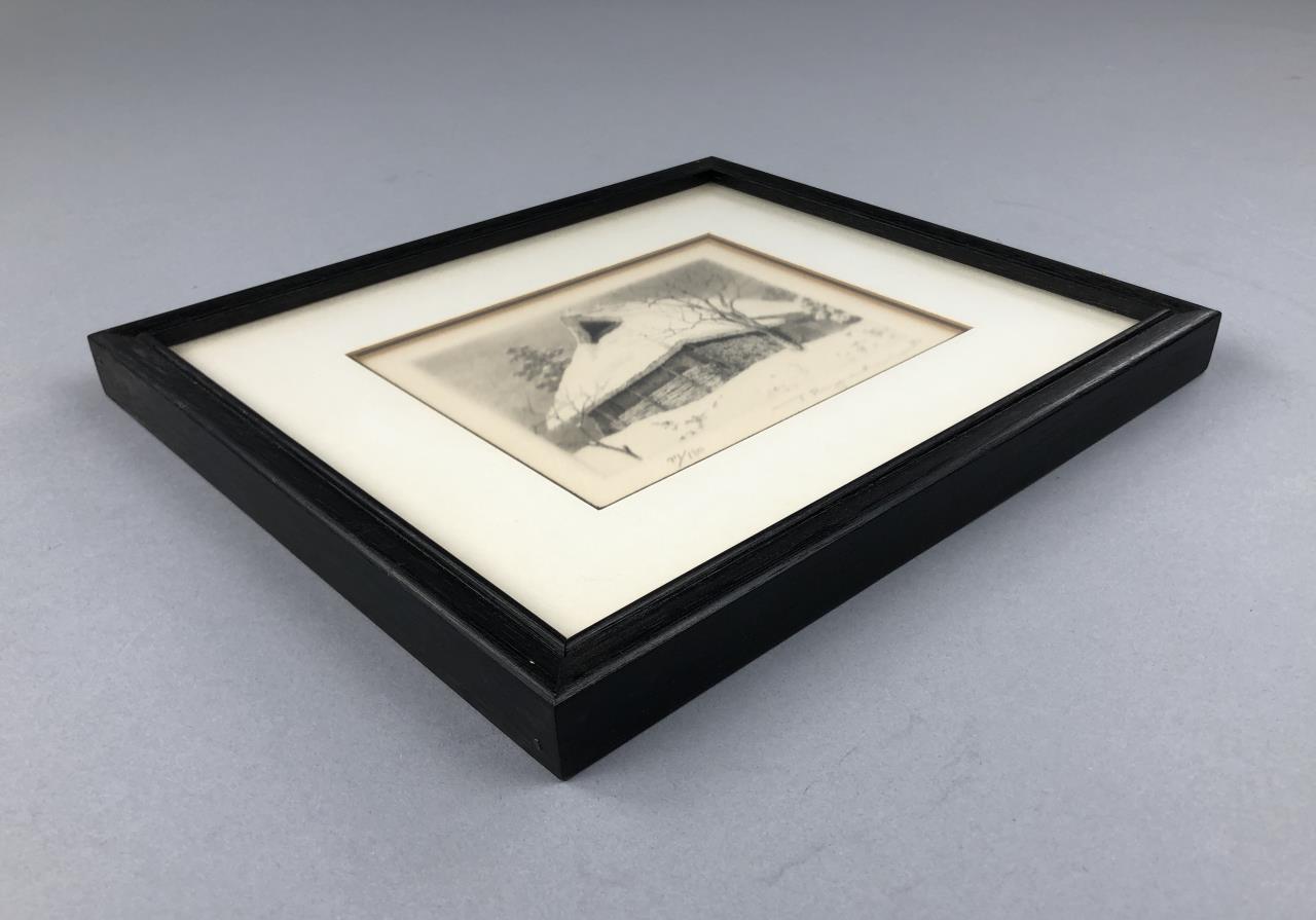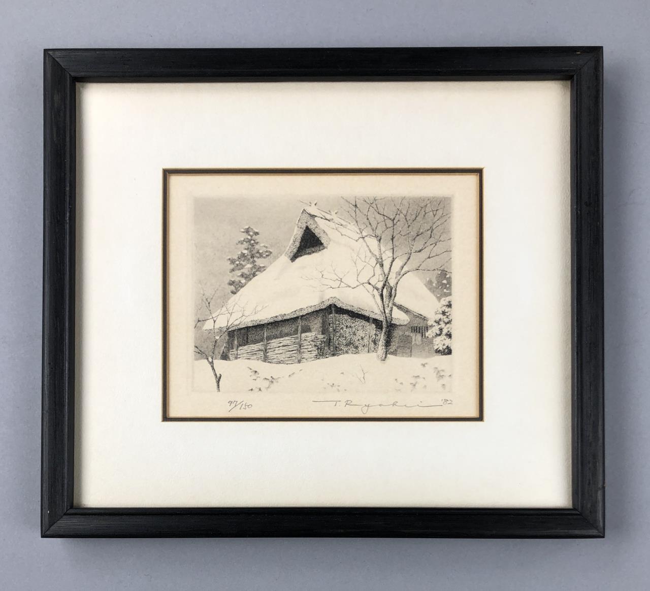 Framed artist signed limited edition etching, titled “Snow on Thatched Roof,” depicting a traditional rural Japanese thatched-roof house in winter, by Ryohei Tanaka (Japanese, 1933 – 2019), pencil signed by the artist and dated (1982) lower right, and numbered (79/150) lower left, in a simple black painted wood frame, measuring approximately 9″ x 10-5/16″. Provenance: ex-private Saint Johns, Michigan, USA collection; Kanda’s Gallery BOQ, Tokyo, Japan, 2/1982. Original receipts, bills of sale, invoices, or other similar documents of purchase or ownership may not necessarily be included even when pictured and are only shown to help better establish the provenance of a piece. CONDITION: SHIPPING: In-House Shipping Available. Please read our Shipping Policies and Terms and Conditions