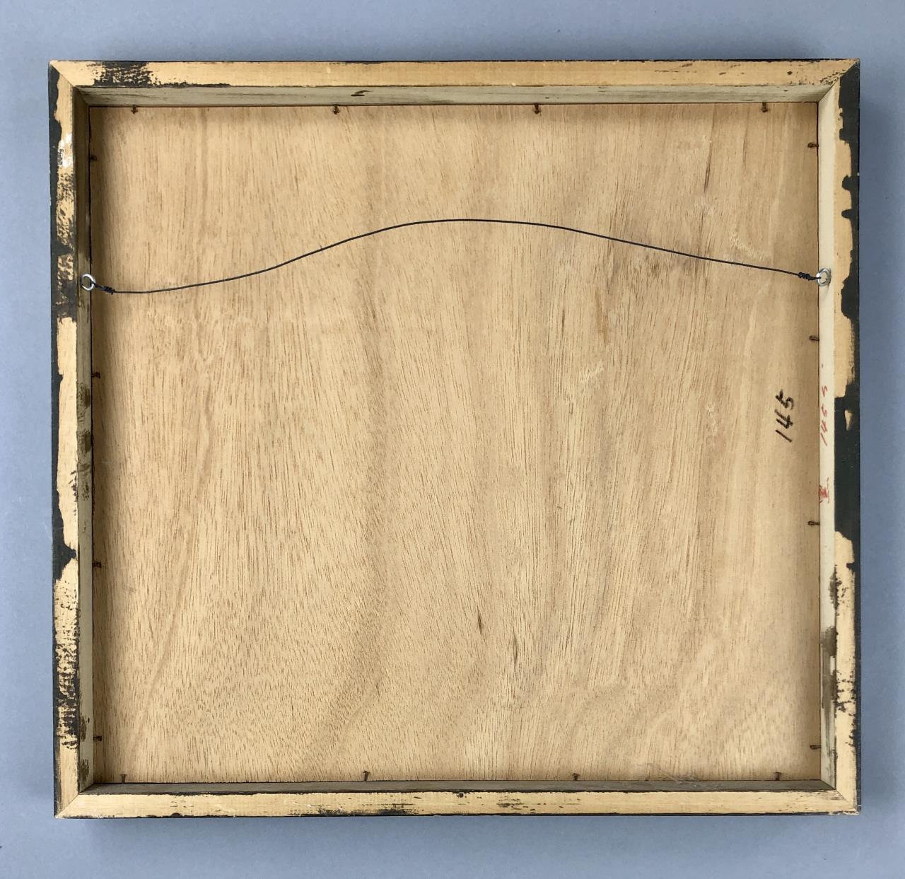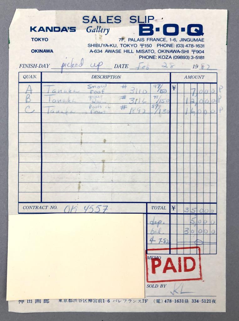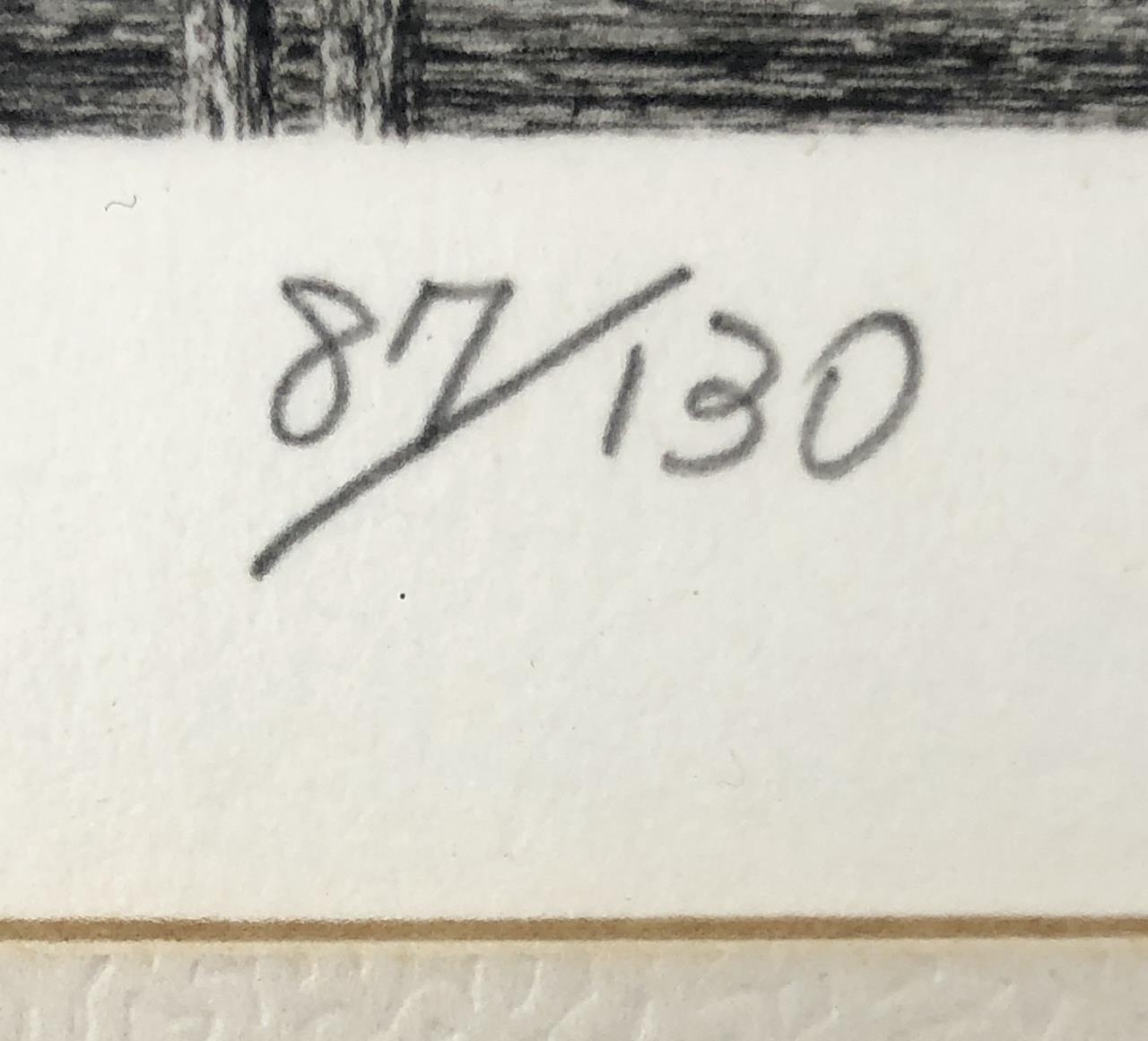 Framed artist signed limited edition etching, possibly titled “Roofs in Forest,” depicting three traditional rural Japanese thatched-roof houses against a mountainous backdrop, by Ryohei Tanaka (Japanese, 1933 – 2019), pencil signed by the artist and dated (1981) lower right, and numbered (87/130) lower left, in a traditional Japanese black painted wood frame, measuring approximately 14-13/16″ x 15-13/16″. Provenance: ex-private Saint Johns, Michigan, USA collection; Kanda’s Gallery BOQ, Tokyo, Japan, 2/1982. Original receipts, bills of sale, invoices, or other similar documents of purchase or ownership may not necessarily be included even when pictured and are only shown to help better establish the provenance of a piece. CONDITION: Not examined out of frame. Scratching, gouging, and denting to frame, please see last two photos. SHIPPING: In-House Shipping Available. Please read our Shipping Policies and Terms and Conditions