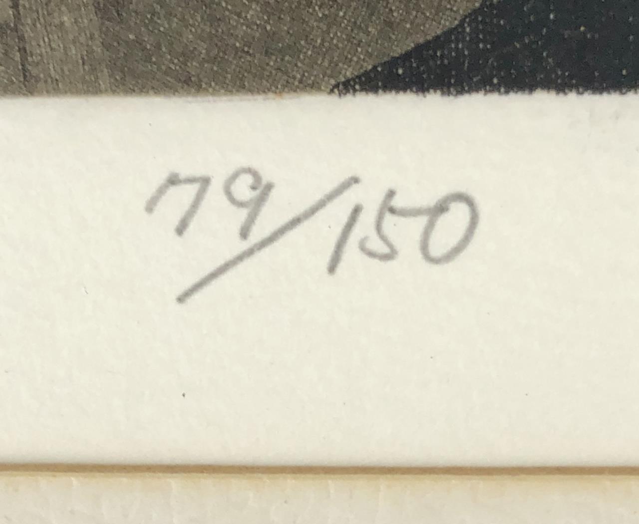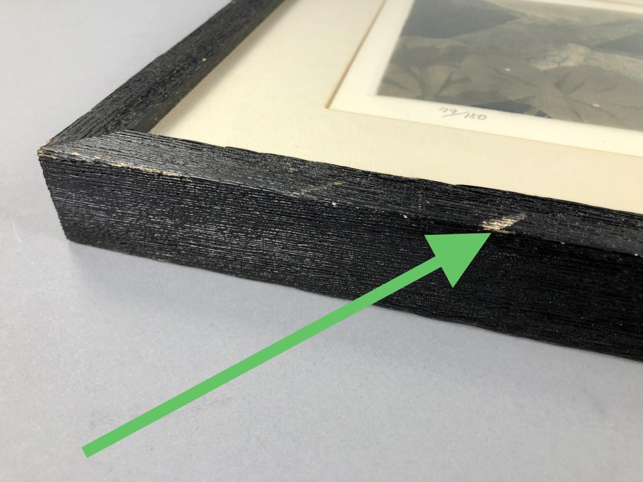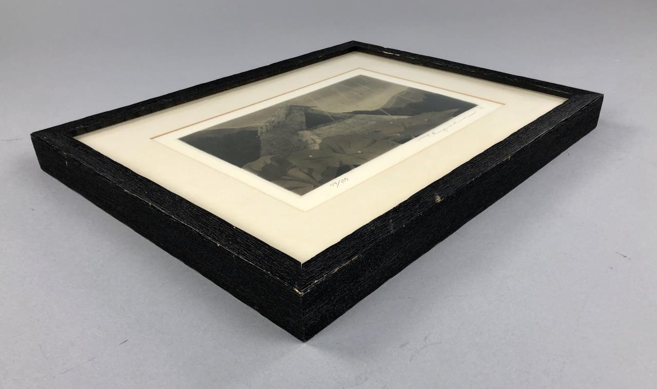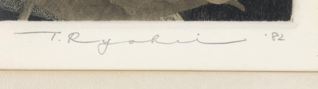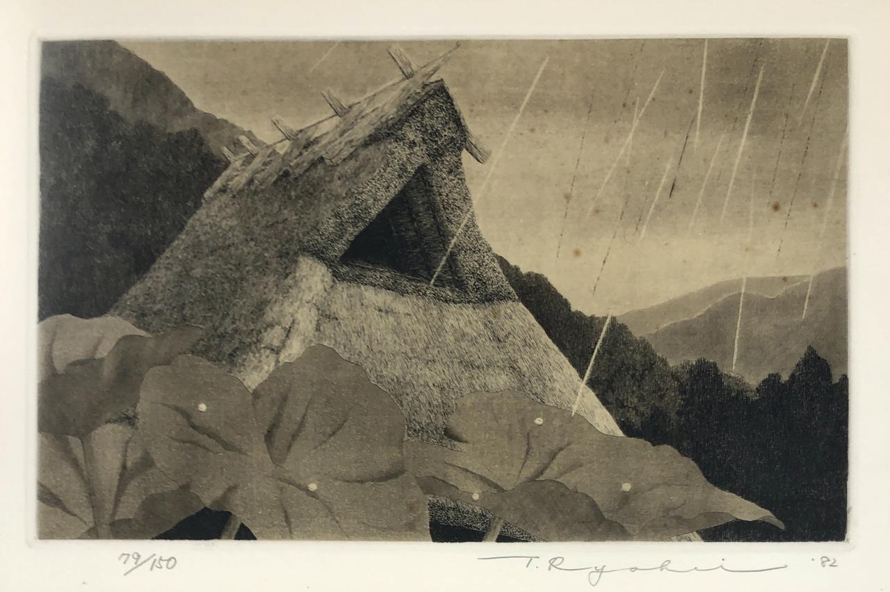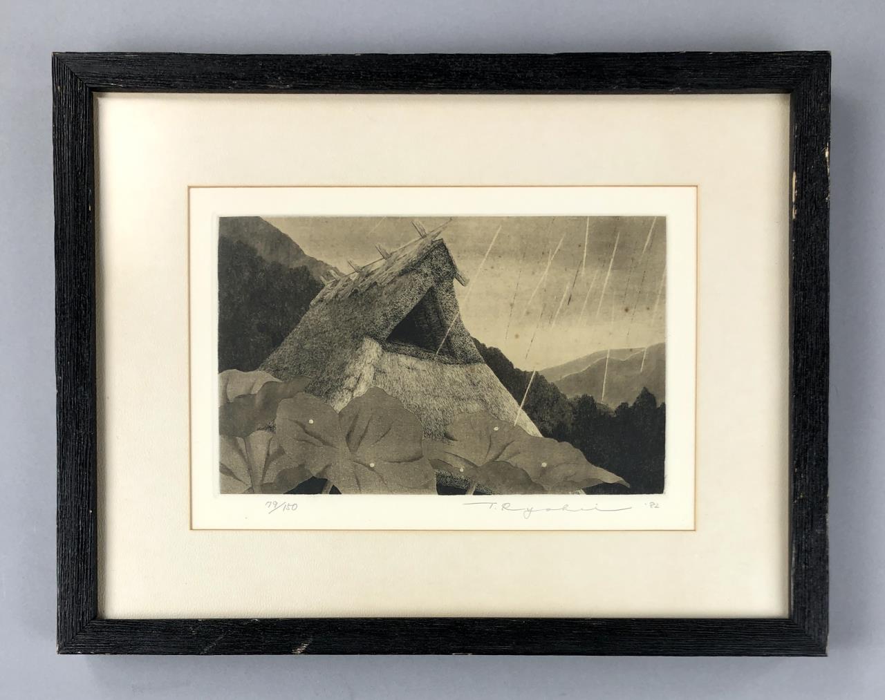 Framed artist signed limited edition etching, titled “Shower Over Roof,” depicting a rain shower against the thatched-roof of a traditional rural Japanese house with mountains in the distance, by Ryohei Tanaka (Japanese, 1933 – 2019), pencil signed by the artist and dated (1982) lower right, and numbered (79/150) lower left, in a traditional Japanese black painted wood frame, measuring approximately 12-1/8″ x 15-1/2″. Provenance: ex-private Saint Johns, Michigan, USA collection; Kanda’s Gallery BOQ, Tokyo, Japan, 2/1982. Original receipts, bills of sale, invoices, or other similar documents of purchase or ownership may not necessarily be included even when pictured and are only shown to help better establish the provenance of a piece. CONDITION: Not examined out of frame. Some areas of foxing within the image. Minor scratching to frame. SHIPPING: In-House Shipping Available. Please read our Shipping Policies and Terms and Conditions