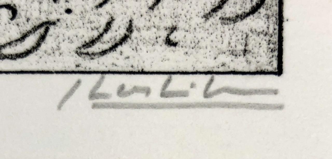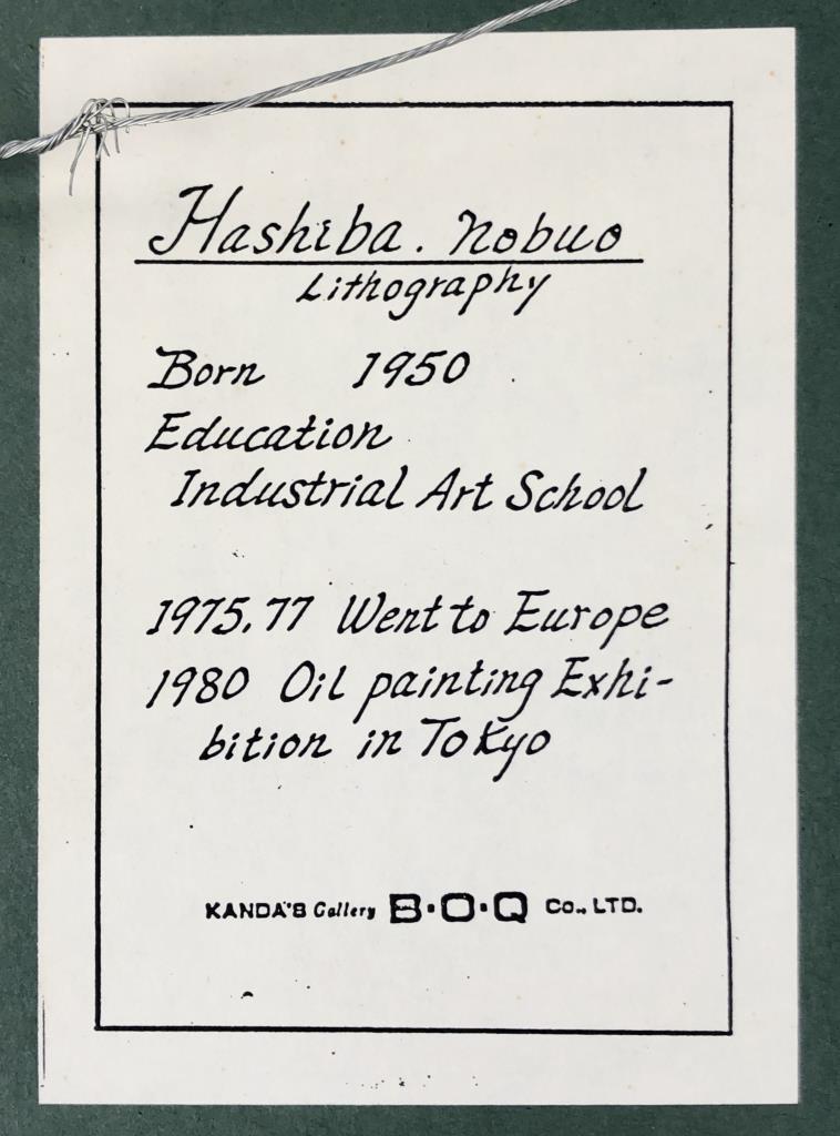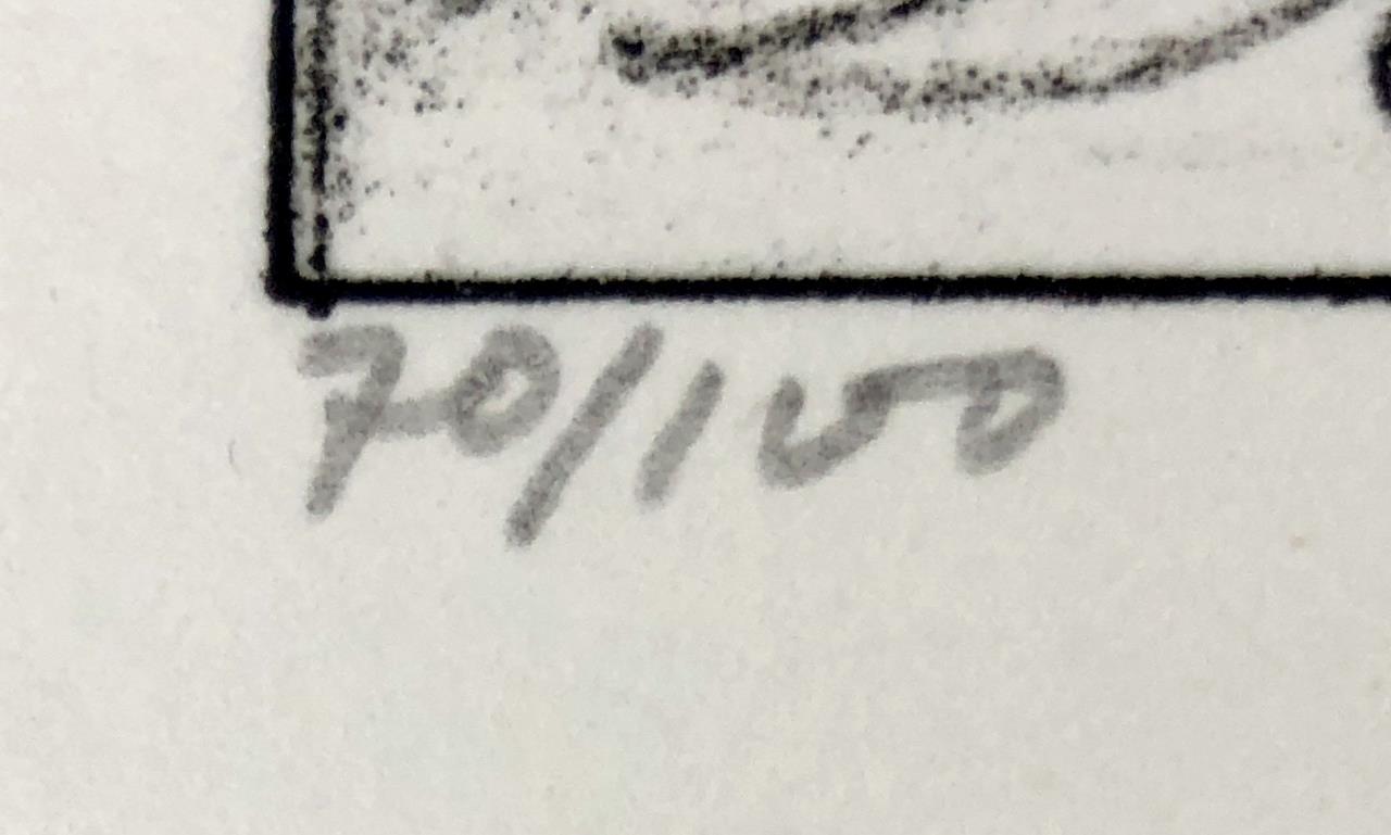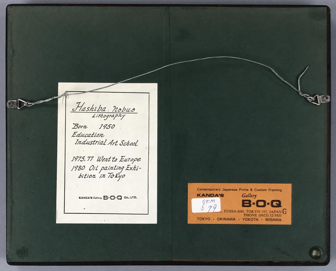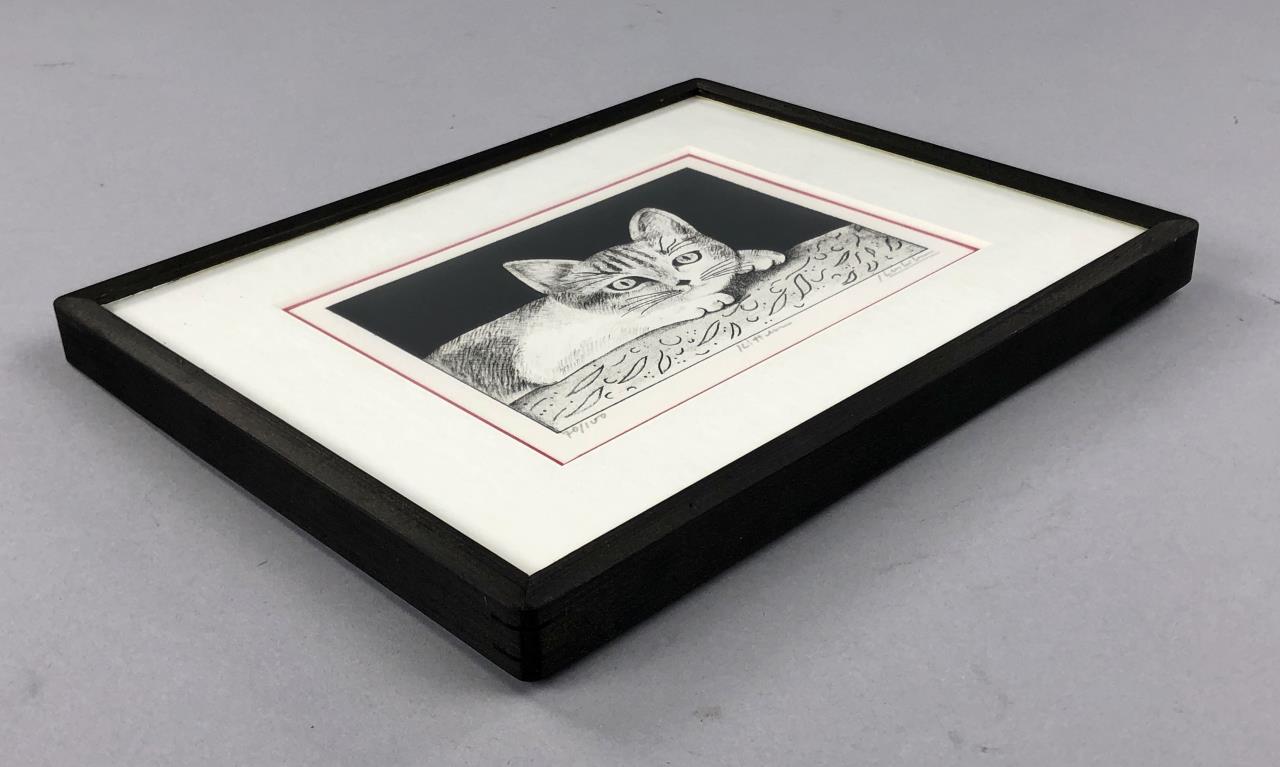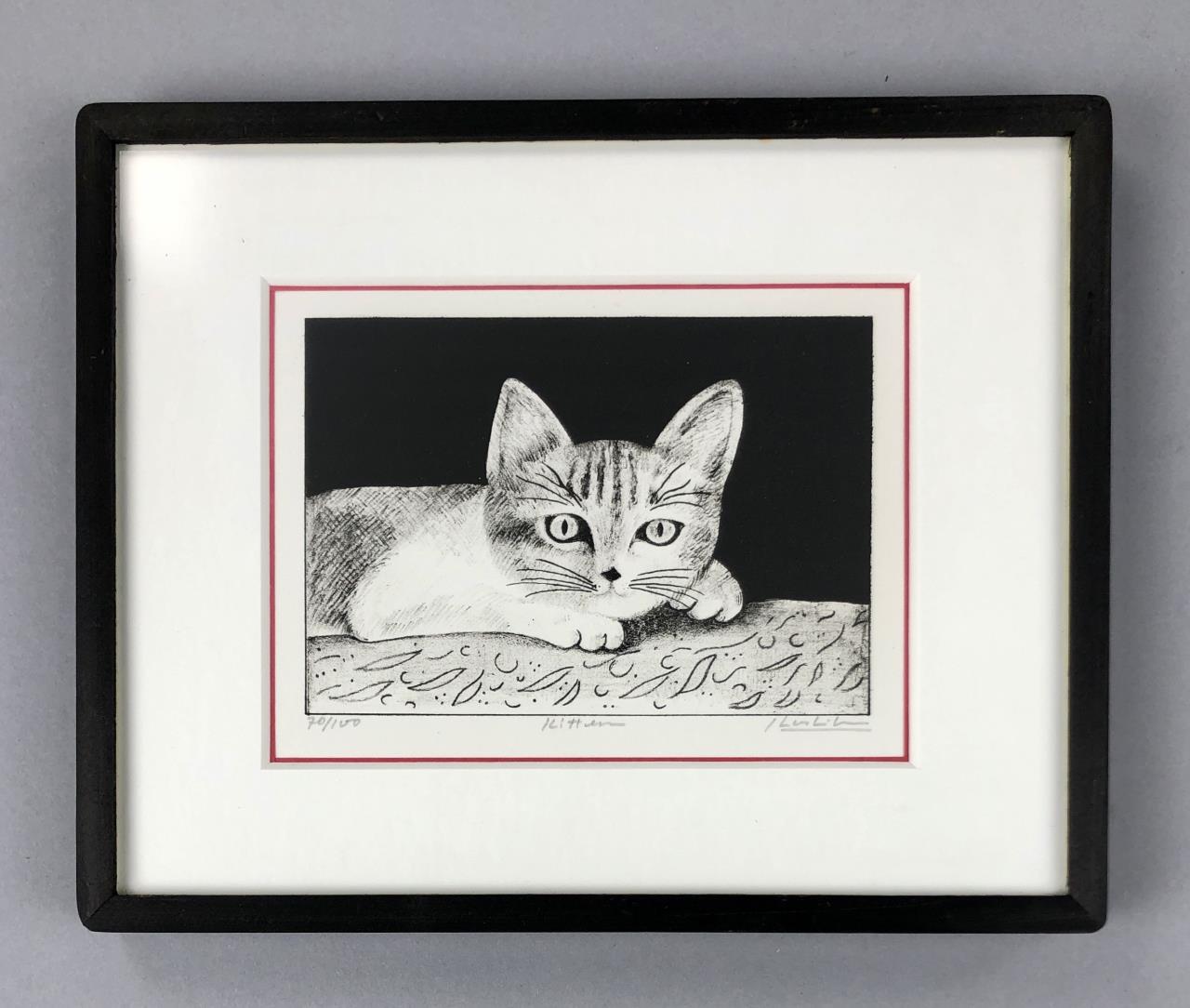 Framed artist signed limited edition lithograph, titled “Kitten,” by Hashiba Nobuo (Japanese, B. 1950), pencil signed by the artist lower right, title lower center, and numbered (70/100) lower left, in a traditional Japanese black painted wood frame, measuring approximately 8-1/2″ x 10-9/16″. Provenance: ex-private Saint Johns, Michigan, USA collection; Kanda’s Gallery BOQ, Tokyo, Japan. CONDITION: Not examined out of frame. SHIPPING: In-House Shipping Available. Please read our Shipping Policies and Terms and Conditions