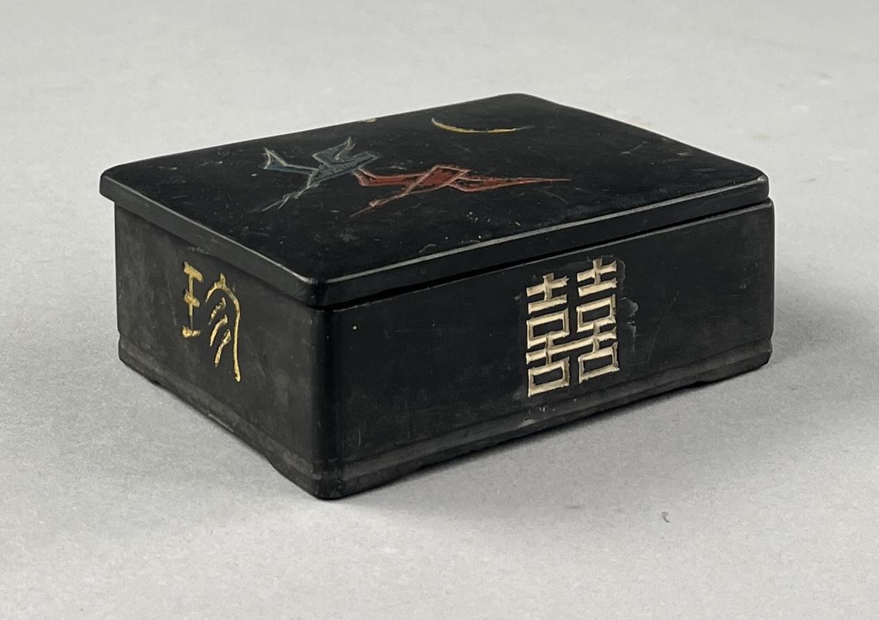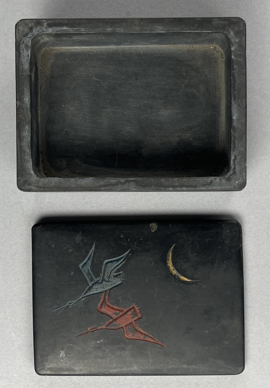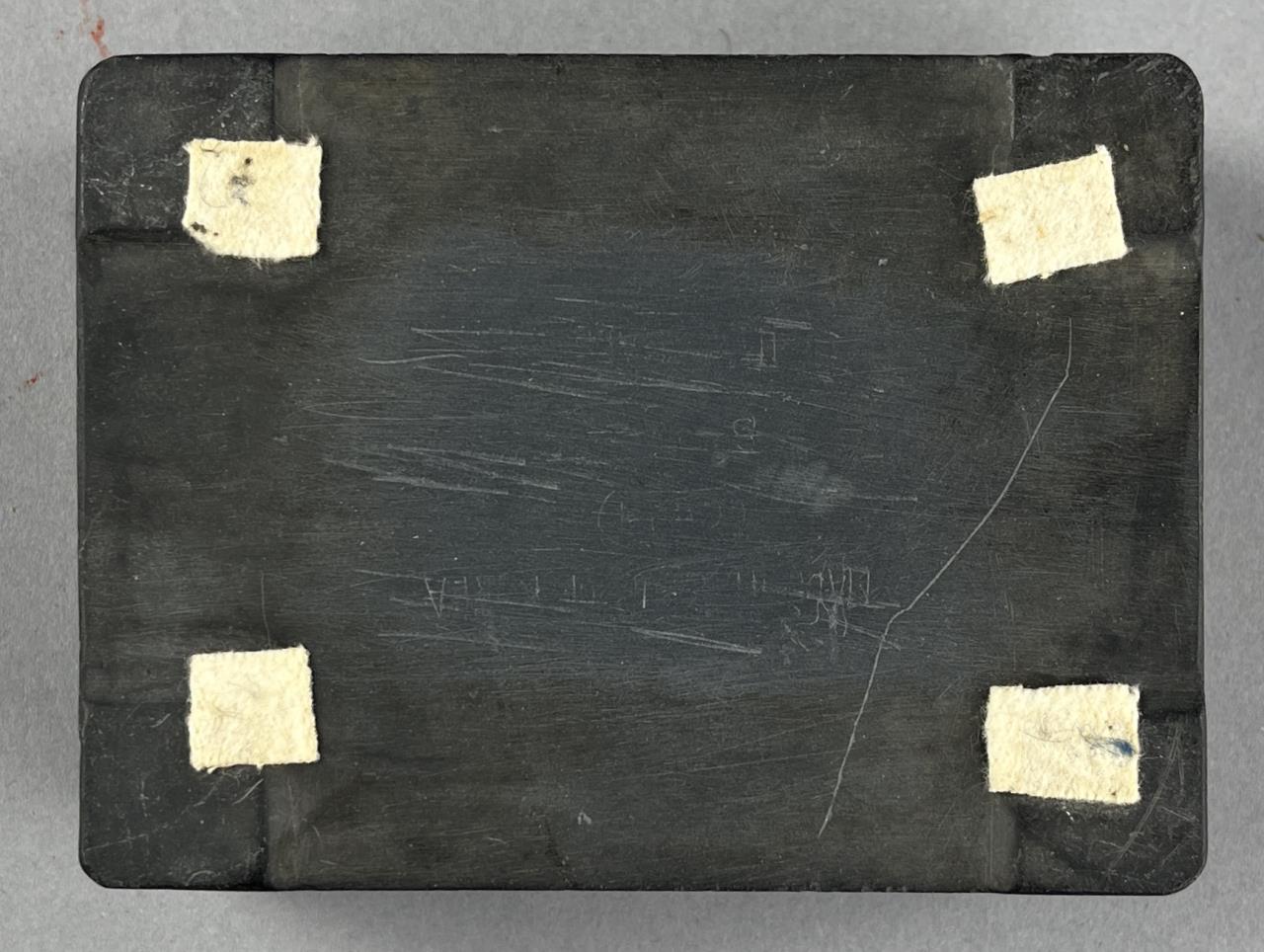 Antique Japanese carved slate cigarette box, measures approximately 4-1/8″ x 3-1/16″ x 1-1/2″. Provenance: ex-private Saint Johns, Michigan, USA collection; Seko’s House of Jade & Teak, Okinawa, Japan, 10/1979. Original receipts, bills of sale, invoices, or other similar documents of purchase or ownership may not necessarily be included even when pictured and are only shown to help better establish the provenance of a piece. CONDITION: SHIPPING: In-House Shipping Available. Please read our Shipping Policies and Terms and Conditions