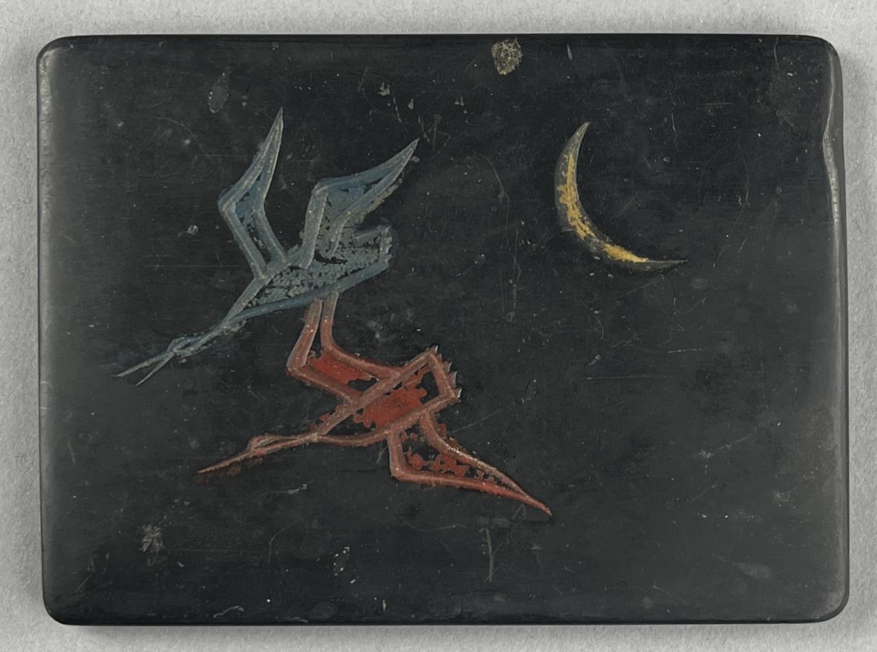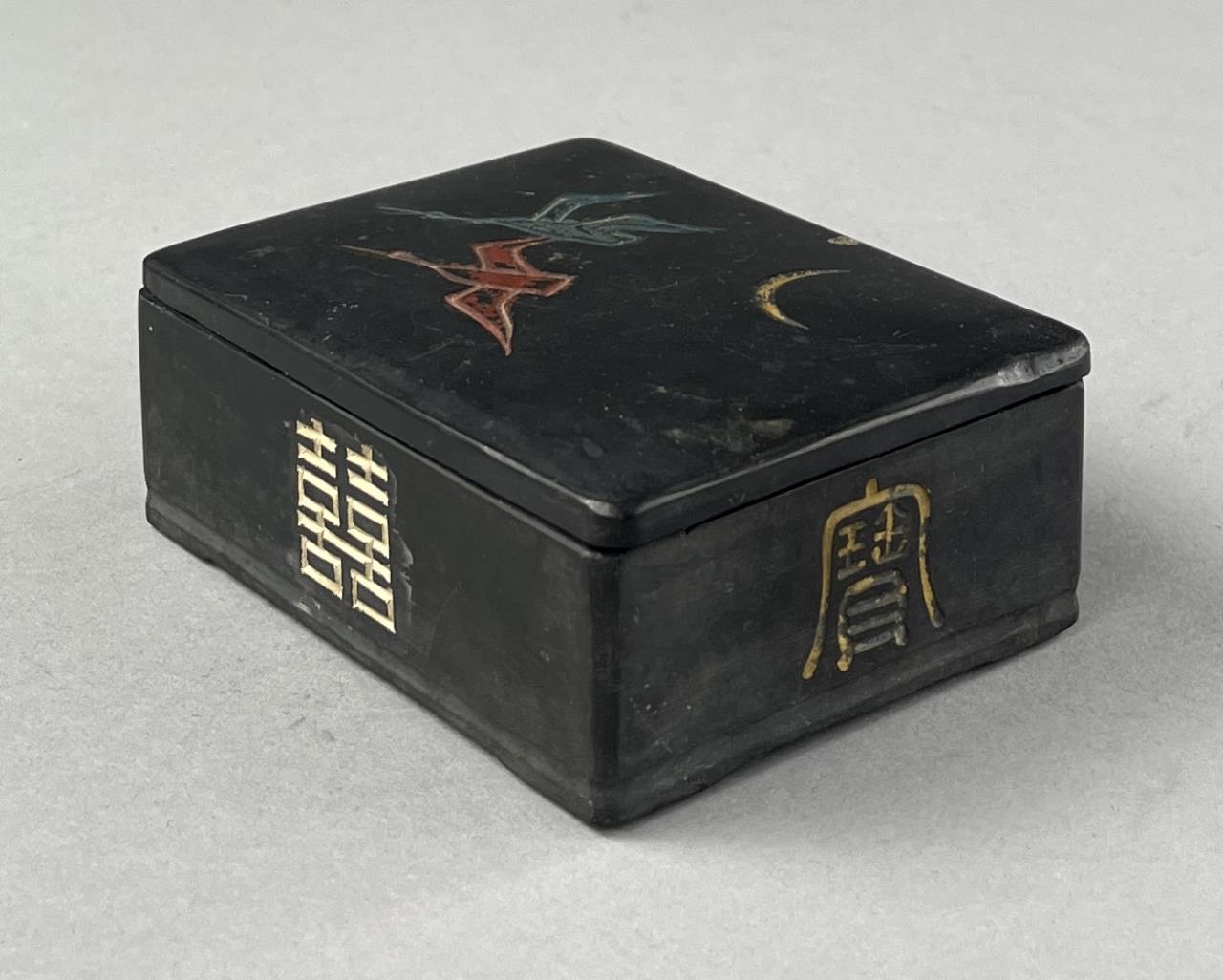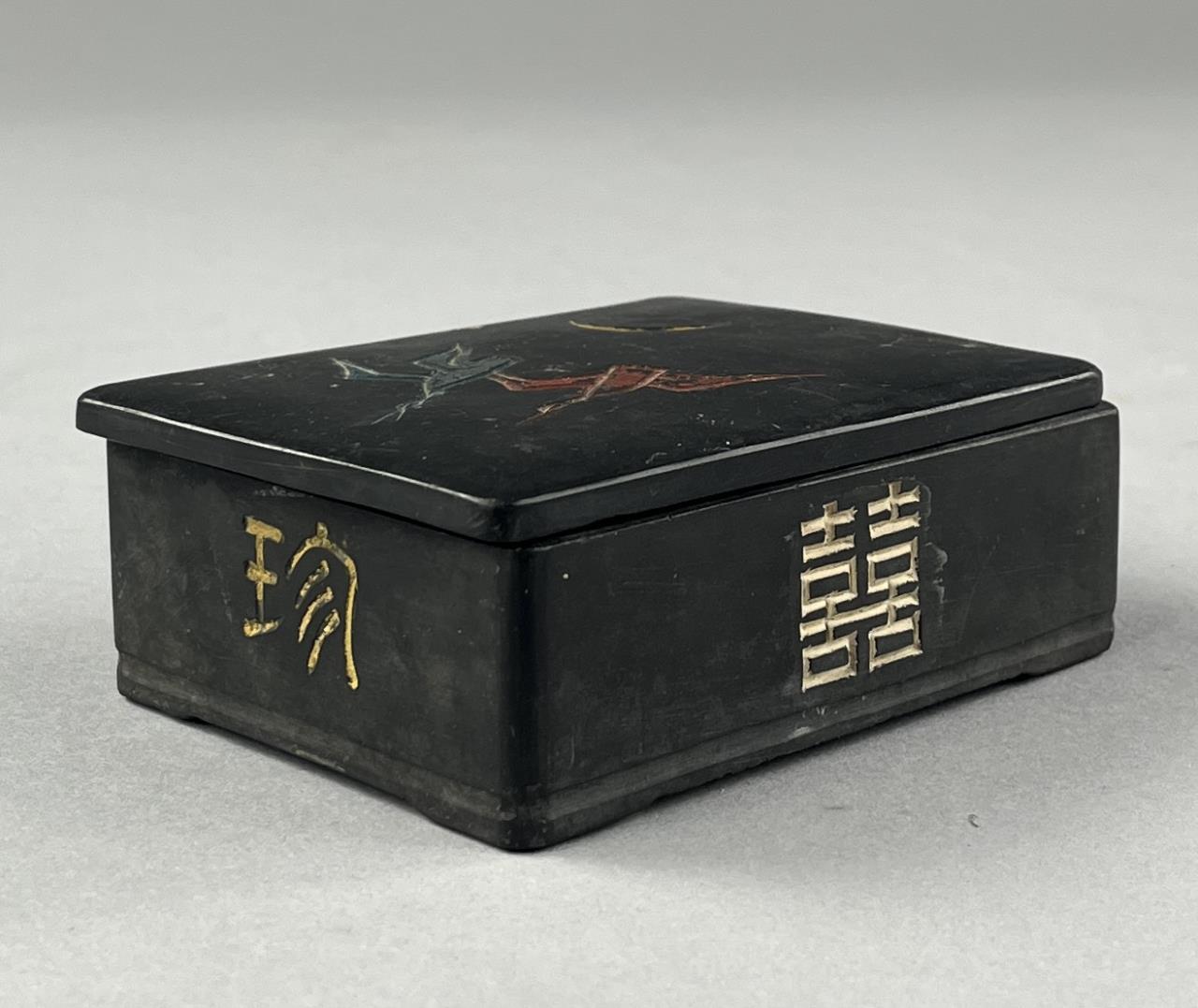 Antique Japanese carved slate cigarette box, measures approximately 4-1/8″ x 3-1/16″ x 1-1/2″. Provenance: ex-private Saint Johns, Michigan, USA collection; Seko’s House of Jade & Teak, Okinawa, Japan, 10/1979. Original receipts, bills of sale, invoices, or other similar documents of purchase or ownership may not necessarily be included even when pictured and are only shown to help better establish the provenance of a piece. CONDITION: SHIPPING: In-House Shipping Available. Please read our Shipping Policies and Terms and Conditions