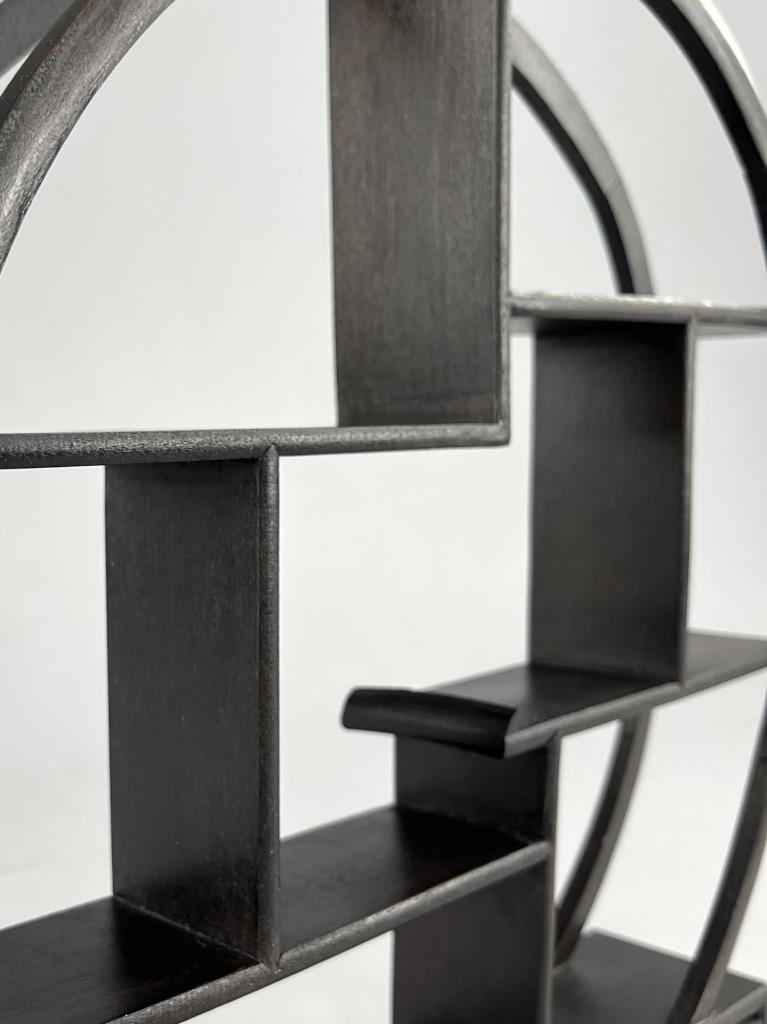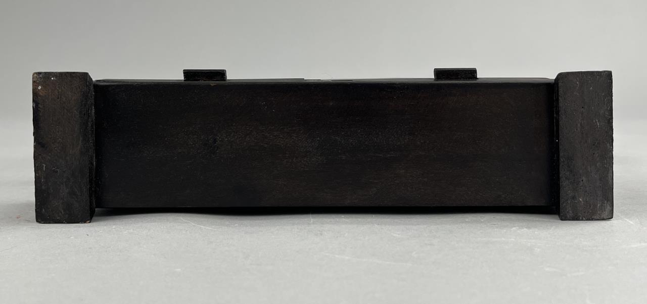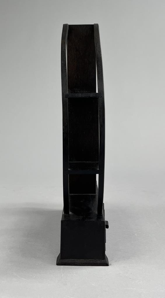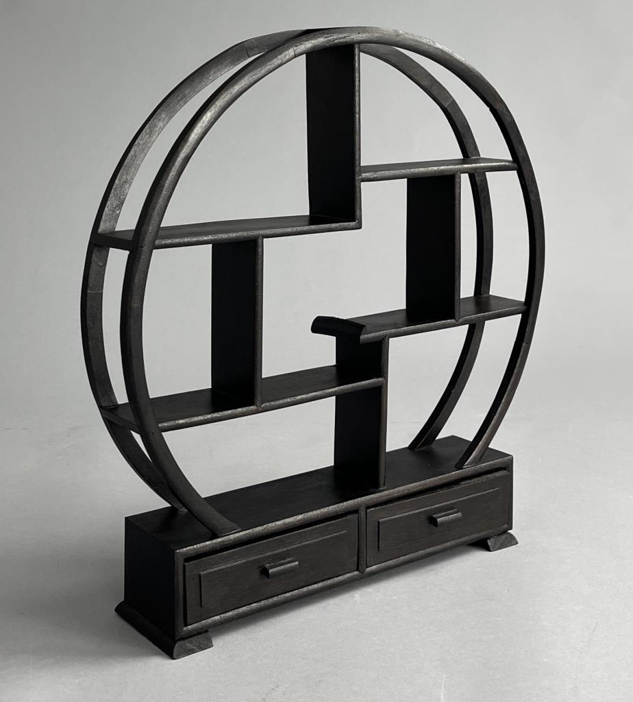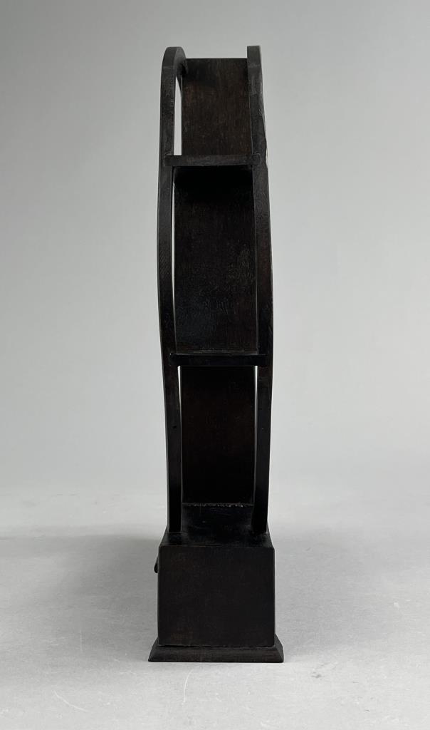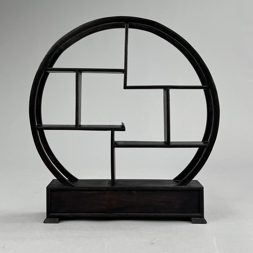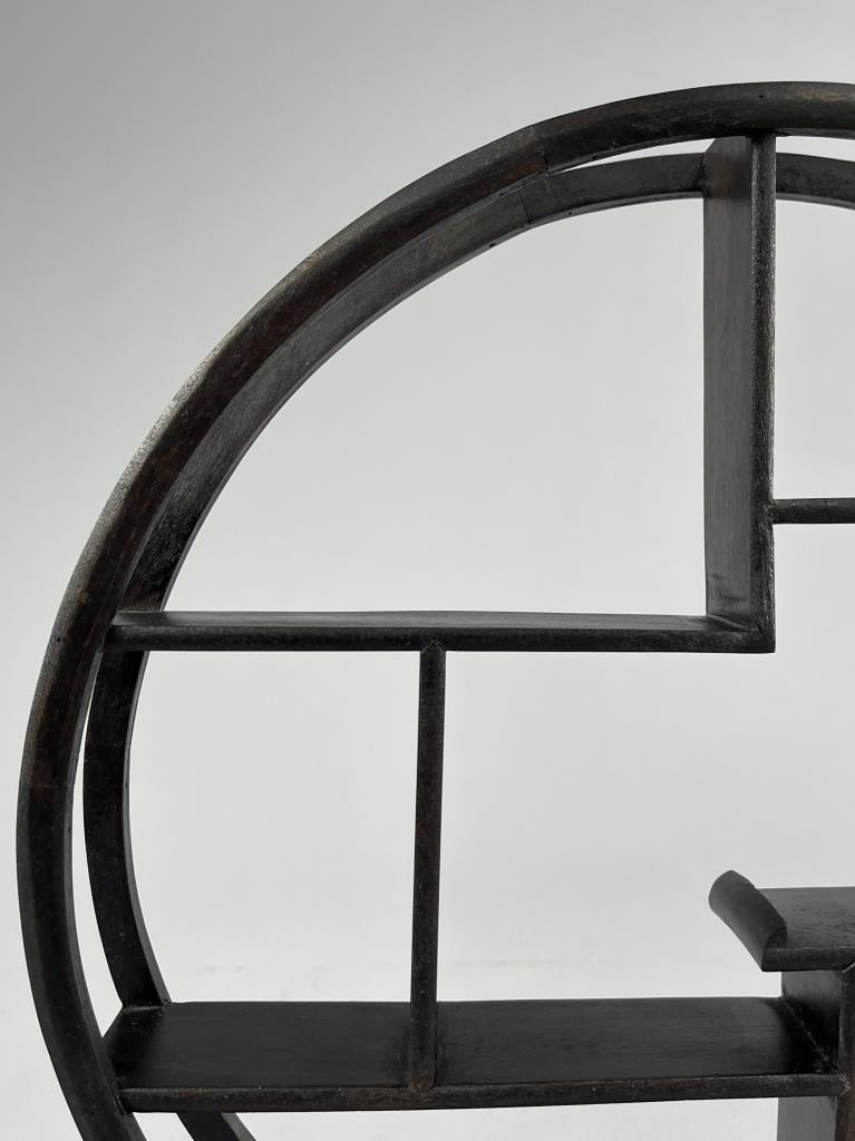 Tabletop Chinese full moon style miniature display stand with two drawers on bottom, dark stained wood, approximately 13-7/16″ x 2-7/8″ x 14-3/8″. CONDITION: SHIPPING: In-House Shipping Available. Please read our Shipping Policies and Terms and Conditions