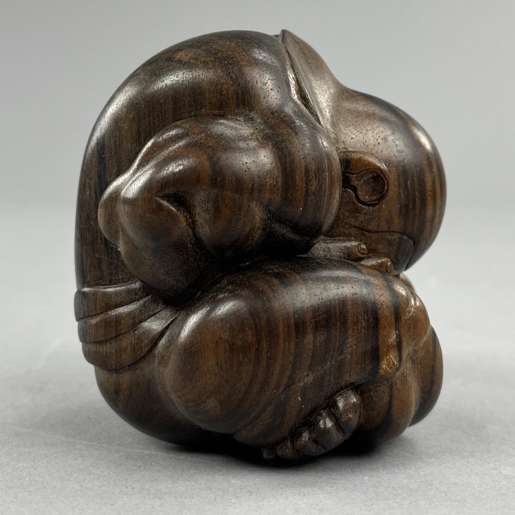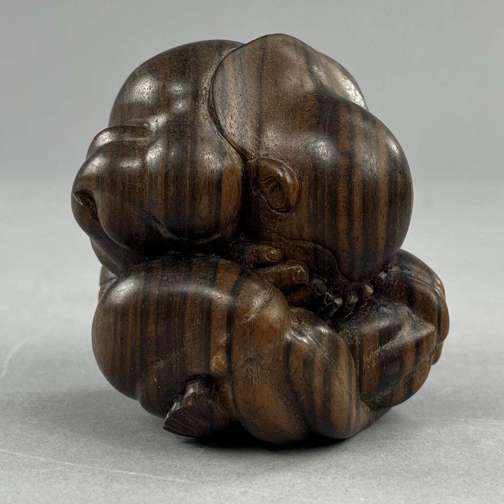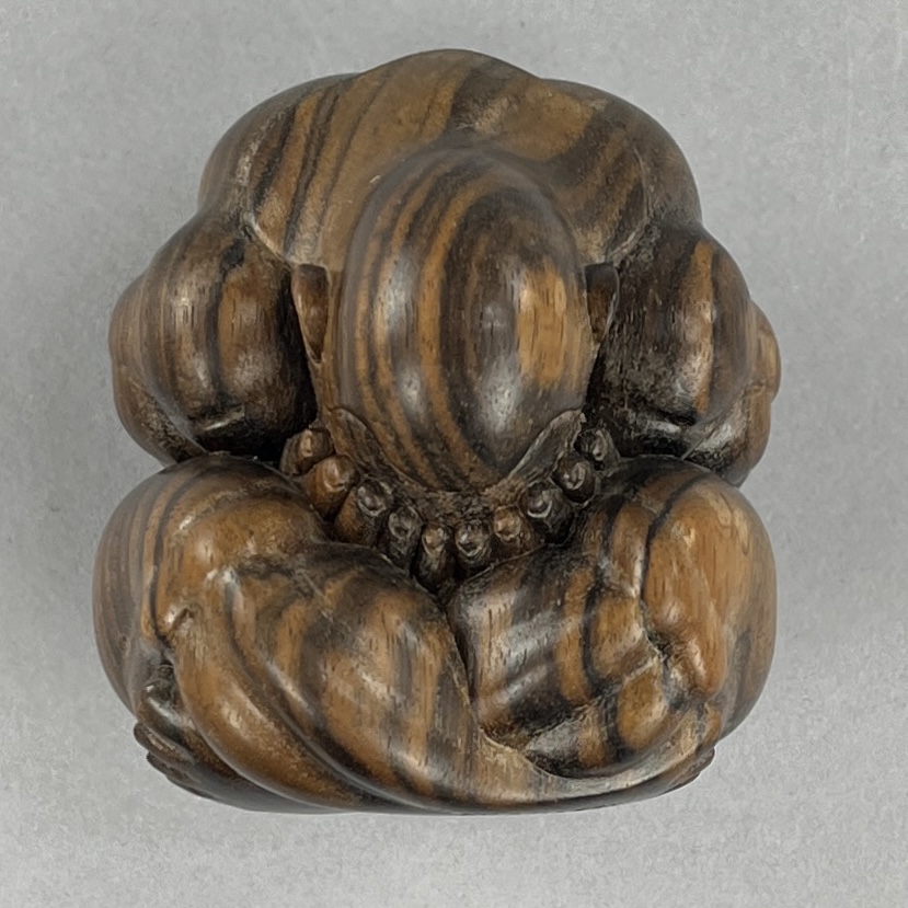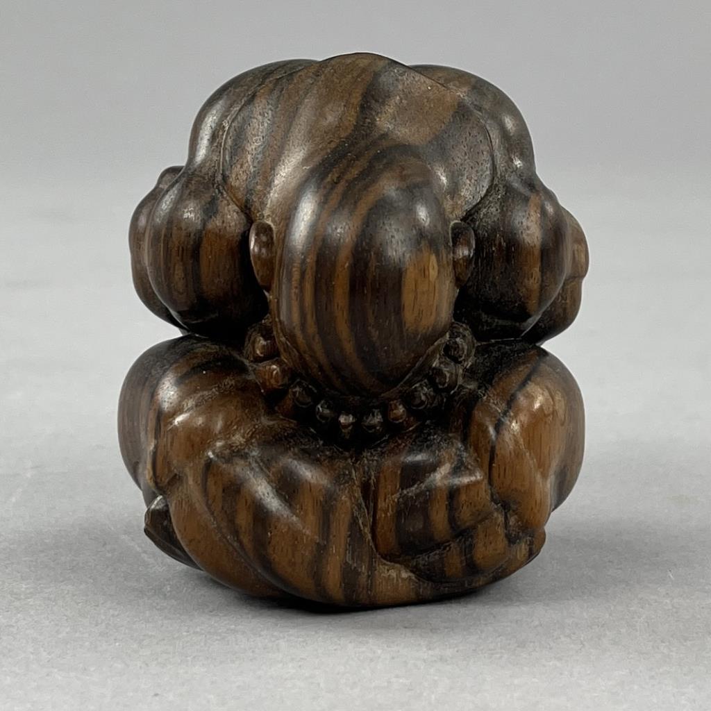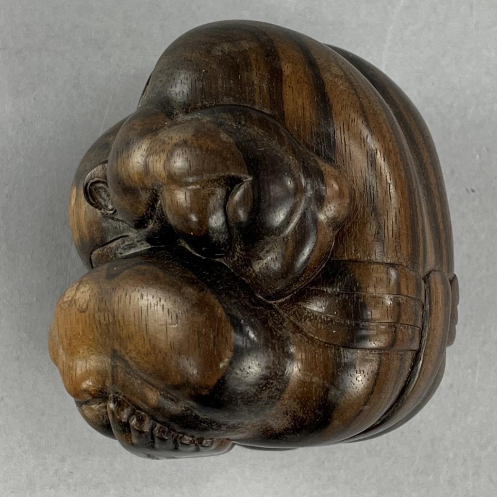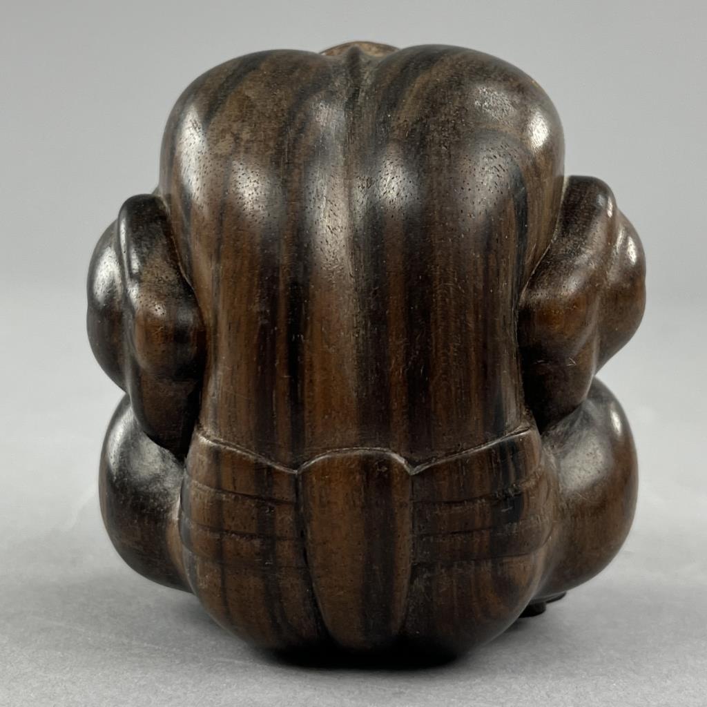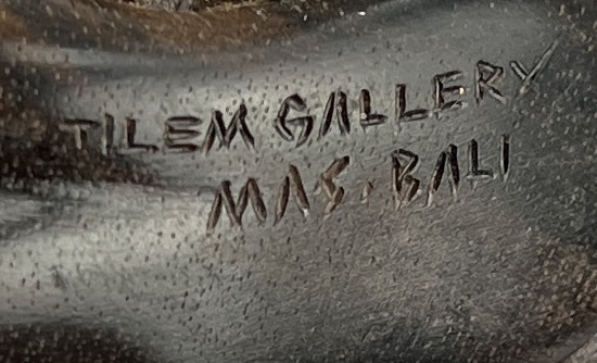 Carved Balinese figure of the weeping Buddha, or the “Orang Malu,” attributed to Ida Bagus Tilem (Indonesian / Balinese, 1936-1993), circa mid to late 20th Century, signed on bottom “Tilem Gallery; Mas, Bali,” most likely rosewood, approximately 3″ x 2-1/2″ x 2-1/2″. CONDITION: SHIPPING: In-House Shipping Available. Please read our Shipping Policies and Terms and Conditions