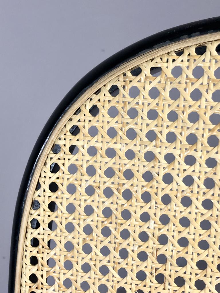 Mid century modern rocking arm chair, tubular chrome, black painted bentwood, with woven cane seat and back, unmarked but in the style of Marcel Breuer’s Cesca chair and reminiscent of Thonet’s earlier bentwood and caned rocking chair, approximately 21″ x 43″ x 41-1/2″. CONDITION: Some areas of corrosion and pitting to chrome, as well as some scratching and loss to painted surface of wood. SHIPPING: Local pick-up or third party shipping only for this lot. Please see the Shipping Policy for information on suggested shippers. We recommend the Pak Mail Store of Battle Creek to assist you. Please contact the shipper of your choice for shipping estimates on this lot. Refer to the Shipping section in our full Terms and Conditions for all information on shipping.