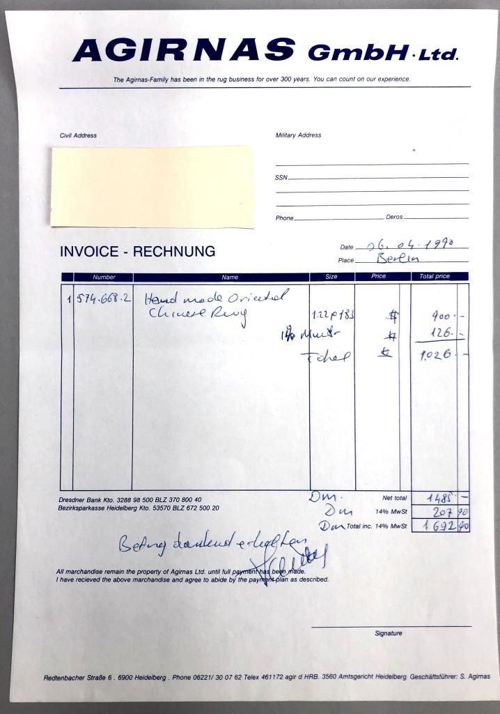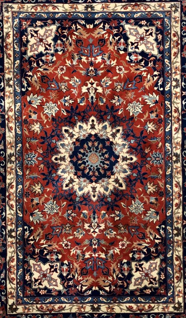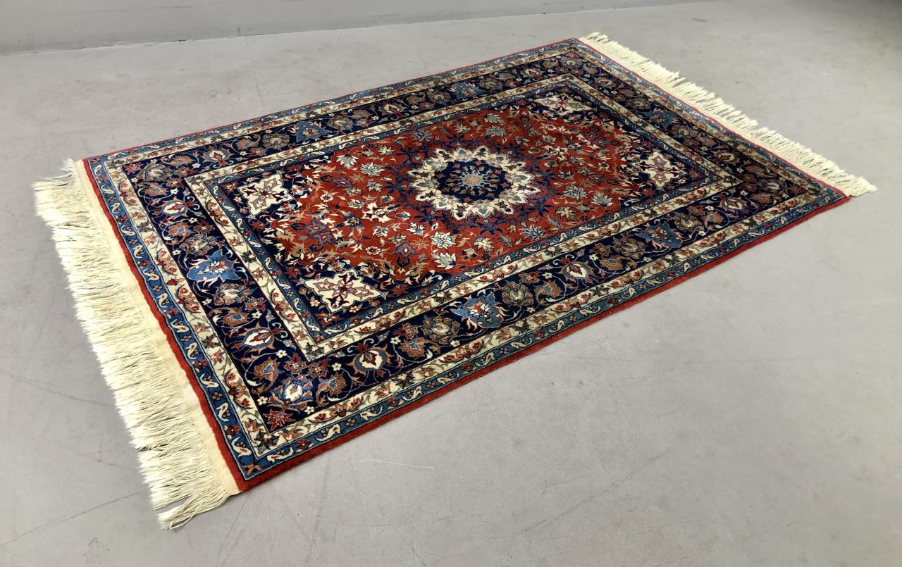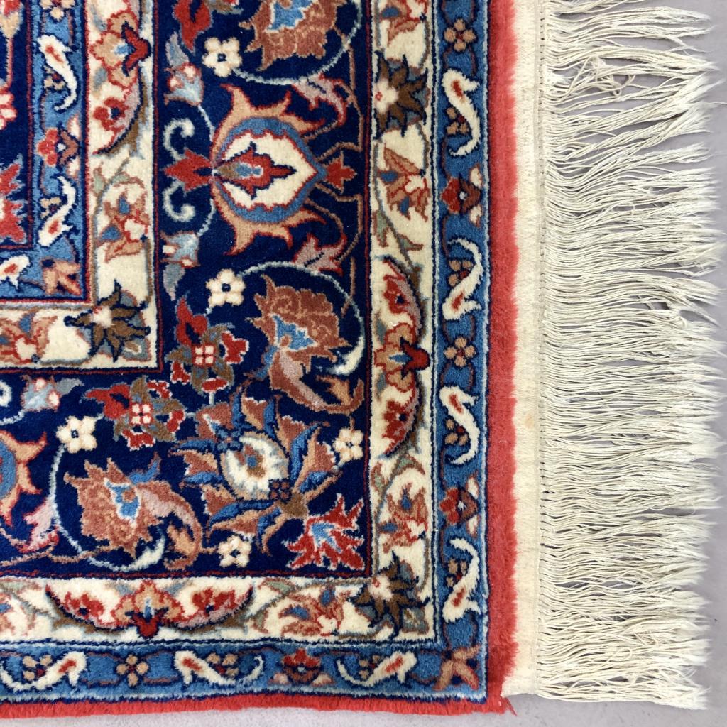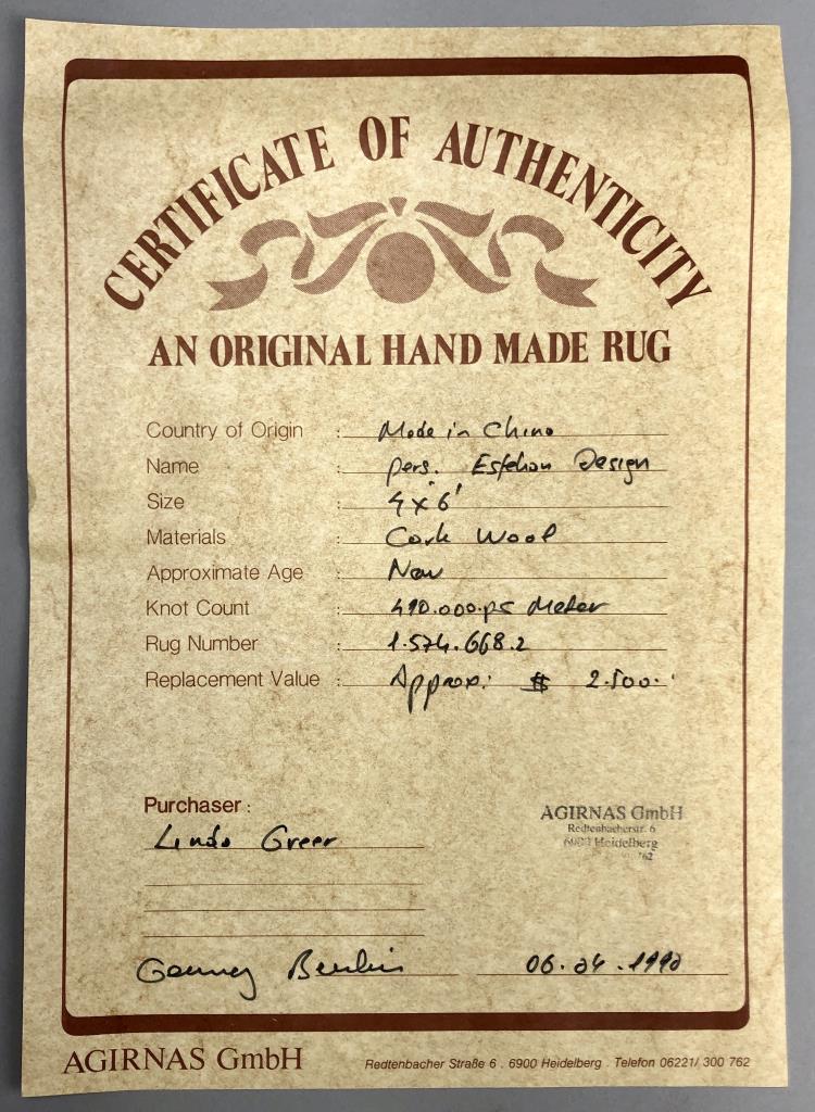 Sino-Persian Kashan style wool rug, hand-knotted, purchased in Germany in 1990, includes original receipt and certificate of authenticity, approximately 4′ x 6′ (not including fringe). CONDITION: Some minor spotting and loss of fringe on one corner. SHIPPING: In-House Shipping Available. Please read our Shipping Policies and Terms and Conditions