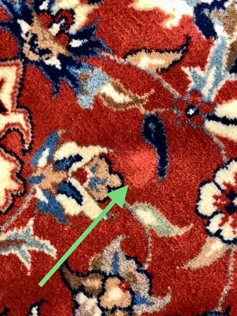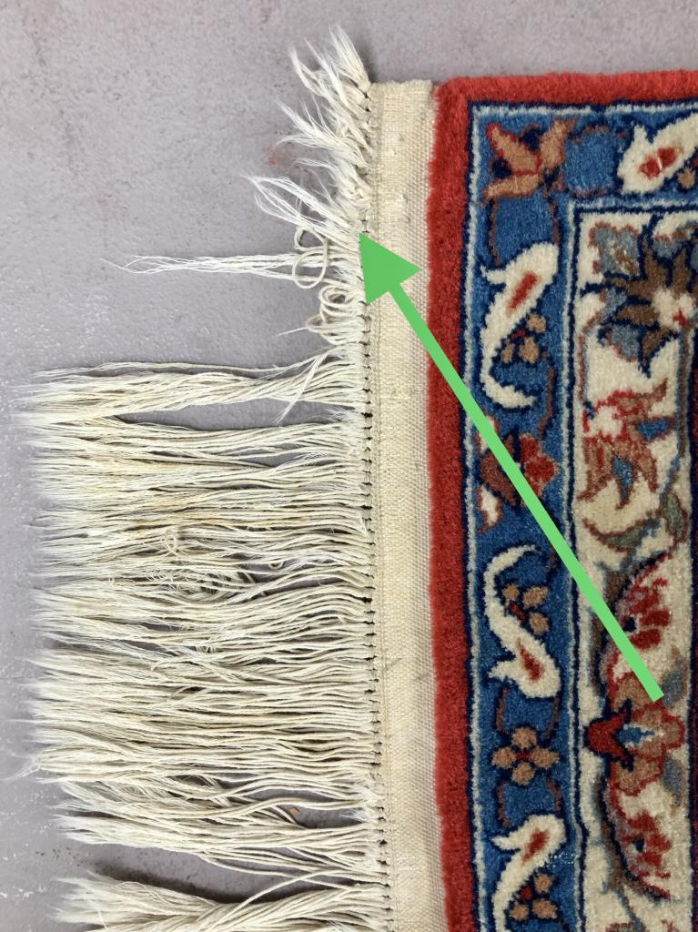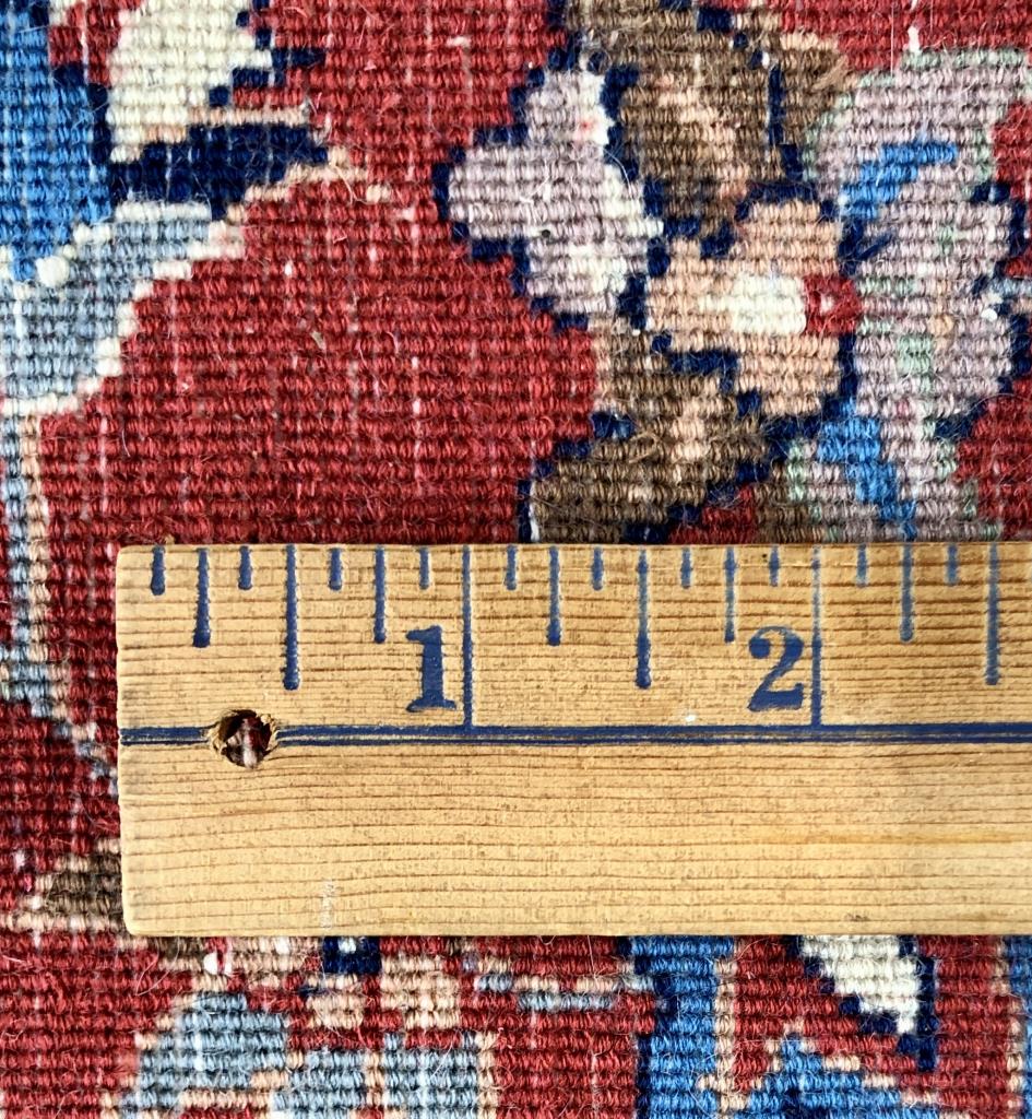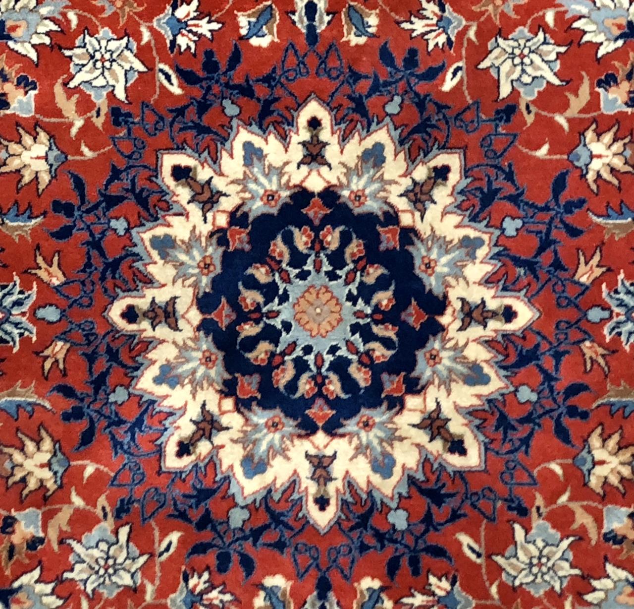 Sino-Persian Kashan style wool rug, hand-knotted, purchased in Germany in 1990, includes original receipt and certificate of authenticity, approximately 4′ x 6′ (not including fringe). CONDITION: Some minor spotting and loss of fringe on one corner. SHIPPING: In-House Shipping Available. Please read our Shipping Policies and Terms and Conditions