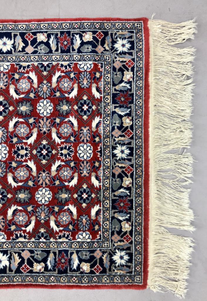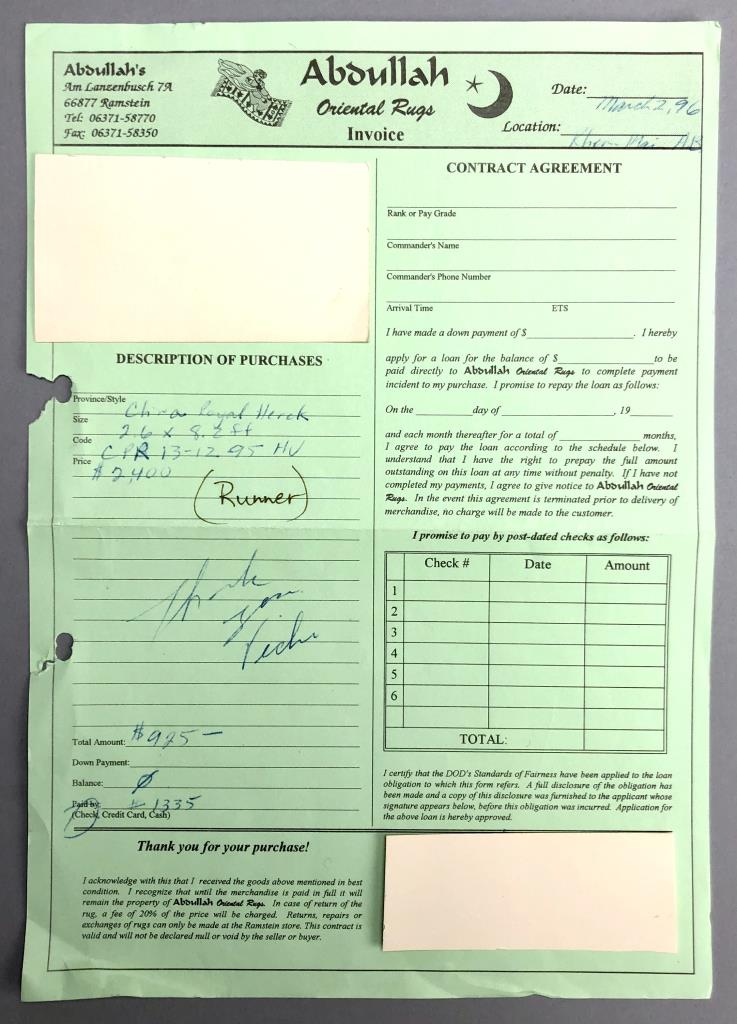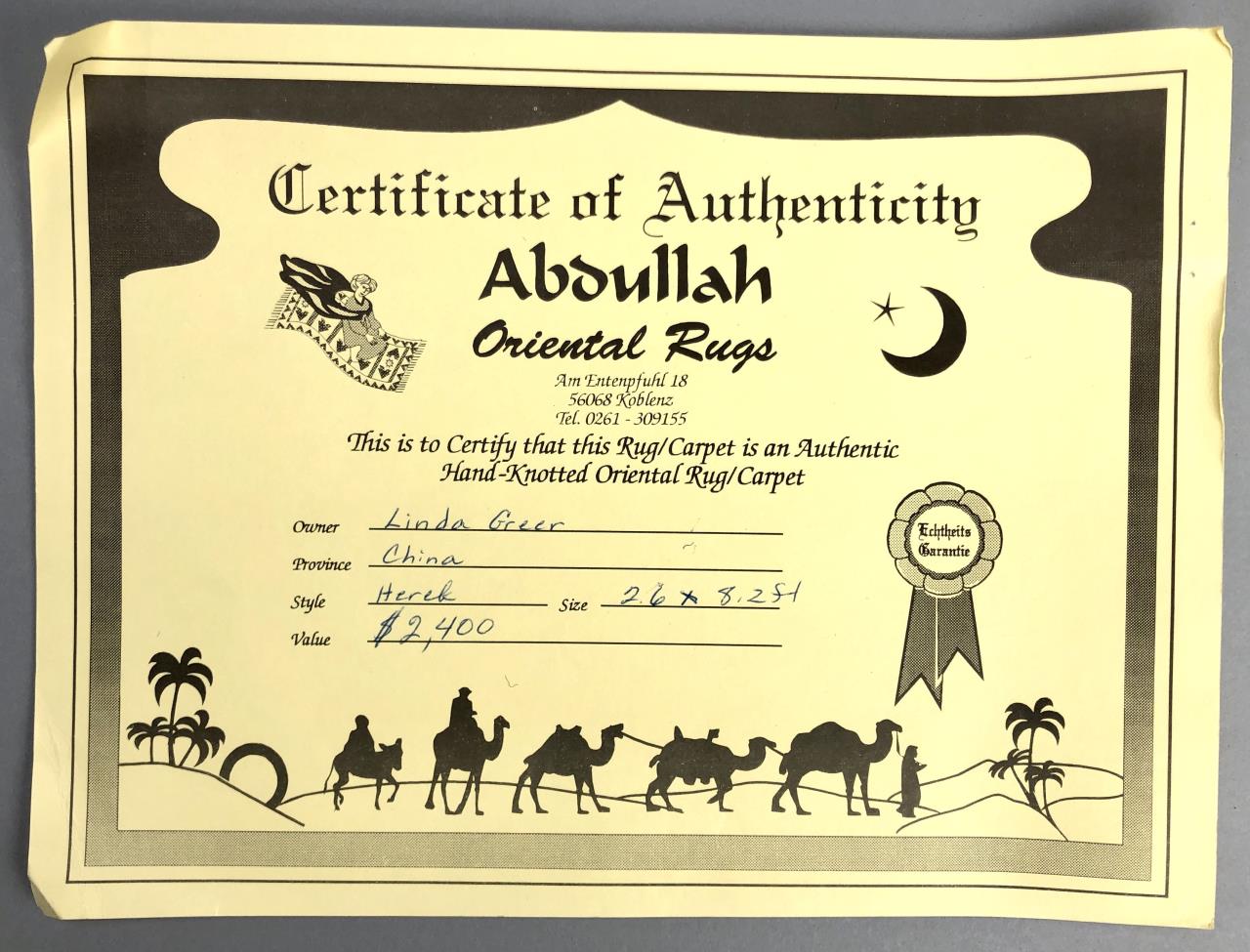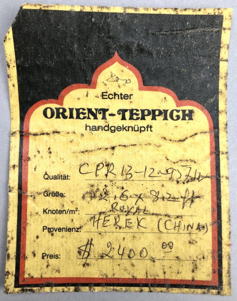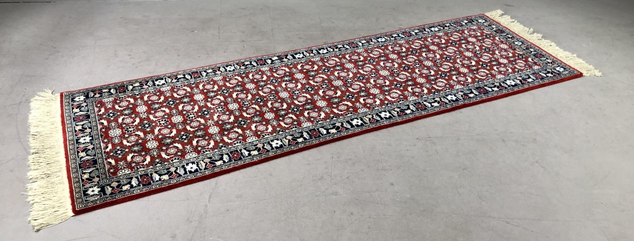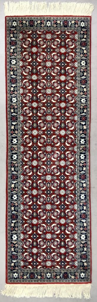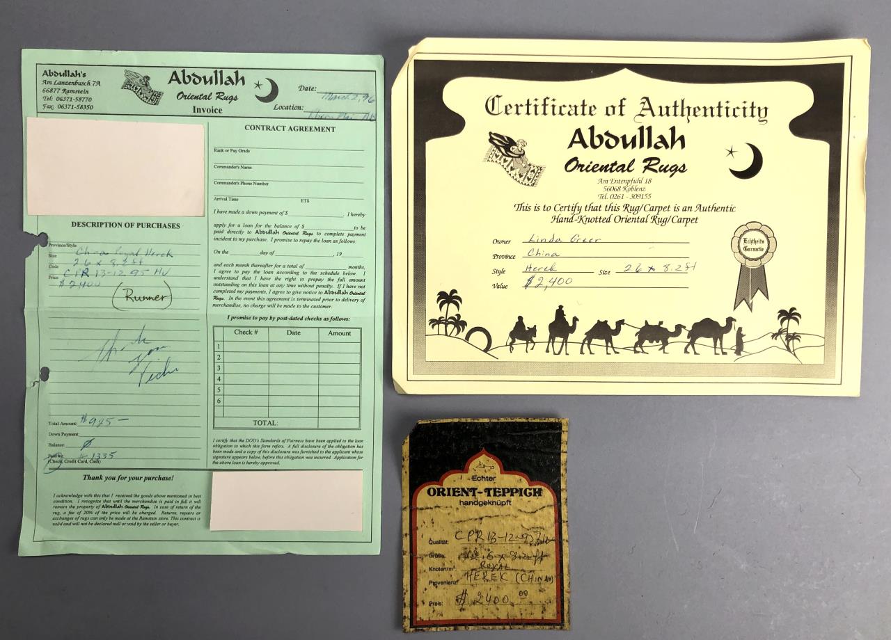 Sino-Turkish Hereke style wool runner, hand-knotted, purchased in Germany in 1996, includes original label, receipt, and certificate of authenticity, approximately 2’6″ x 8’2″ (not including fringe). CONDITION: SHIPPING: In-House Shipping Available. Please read our Shipping Policies and Terms and Conditions