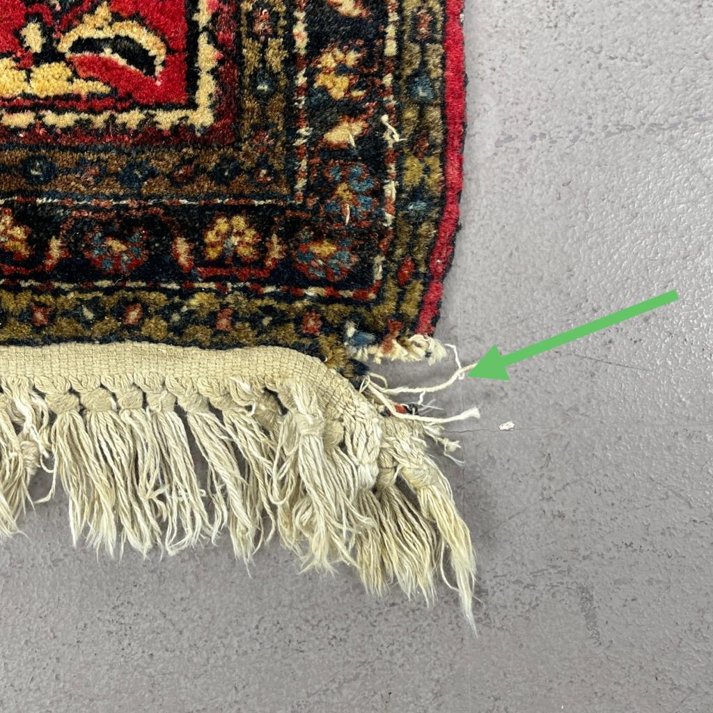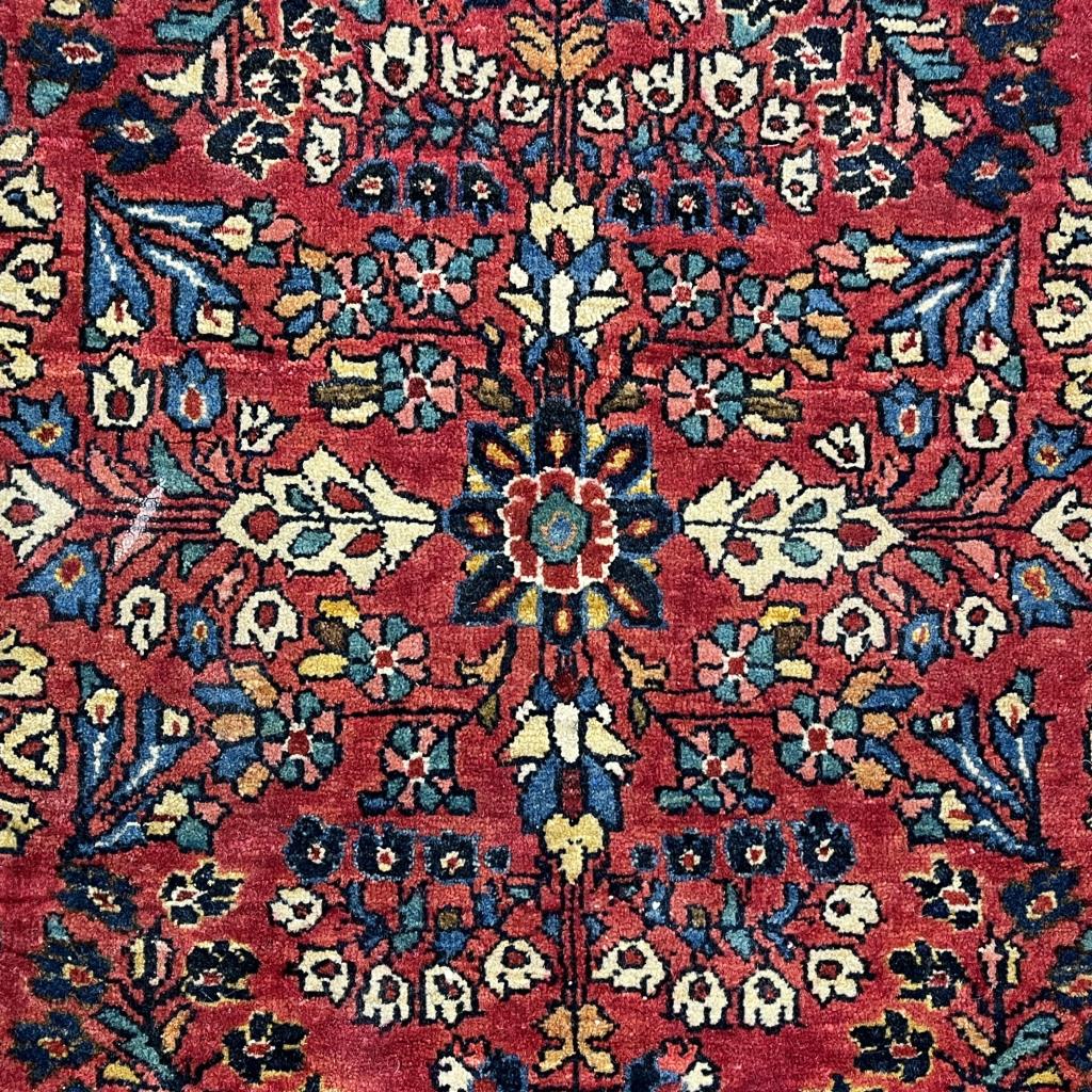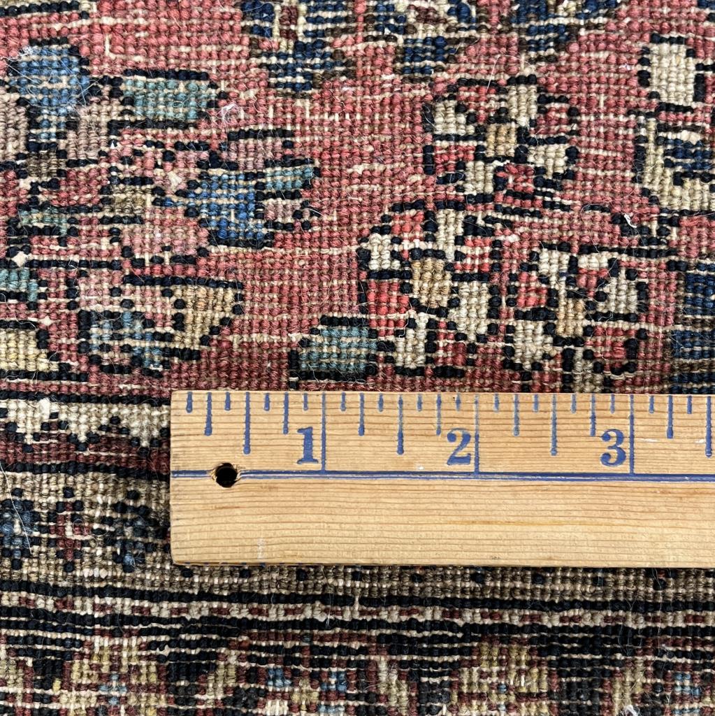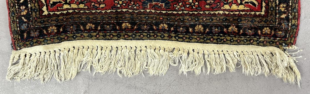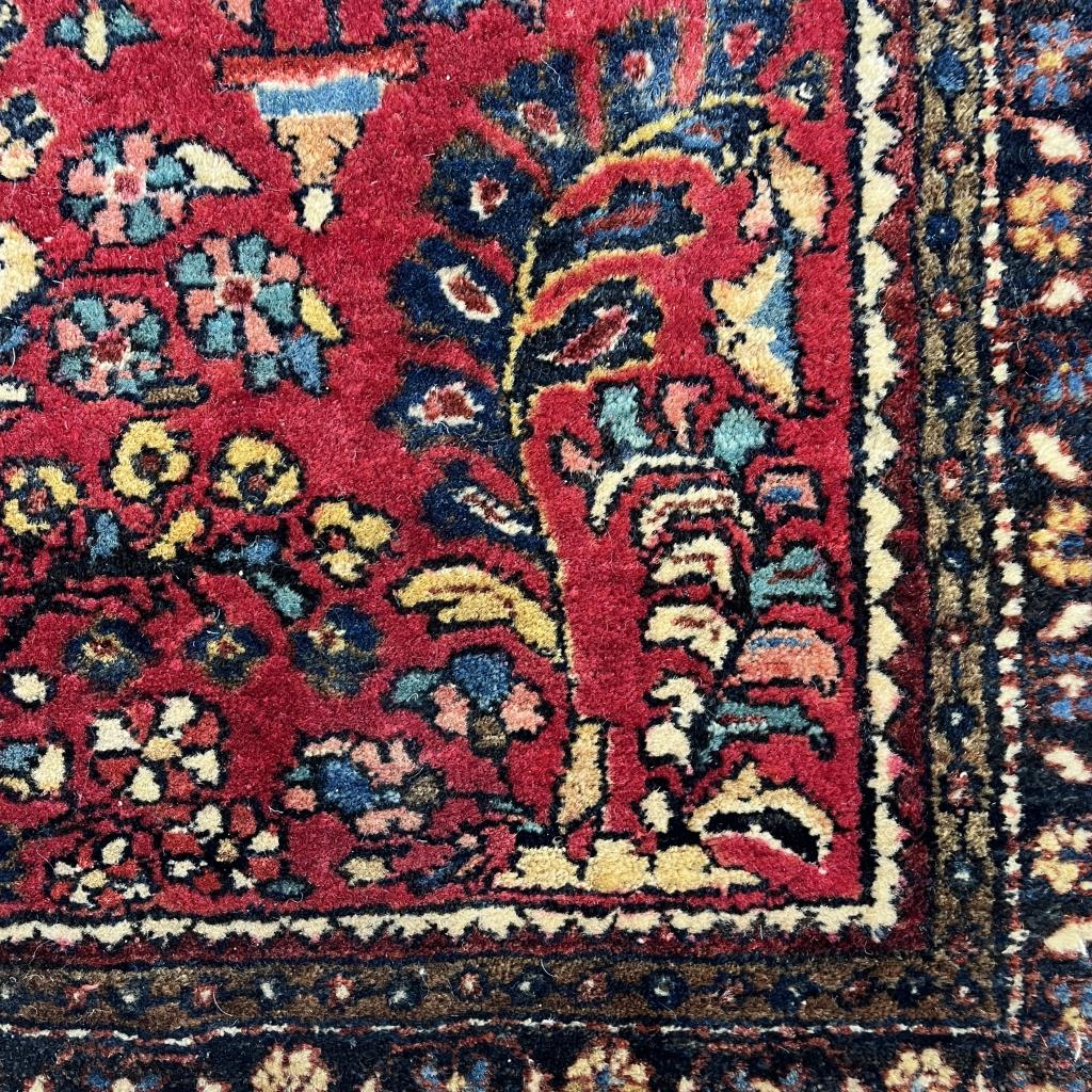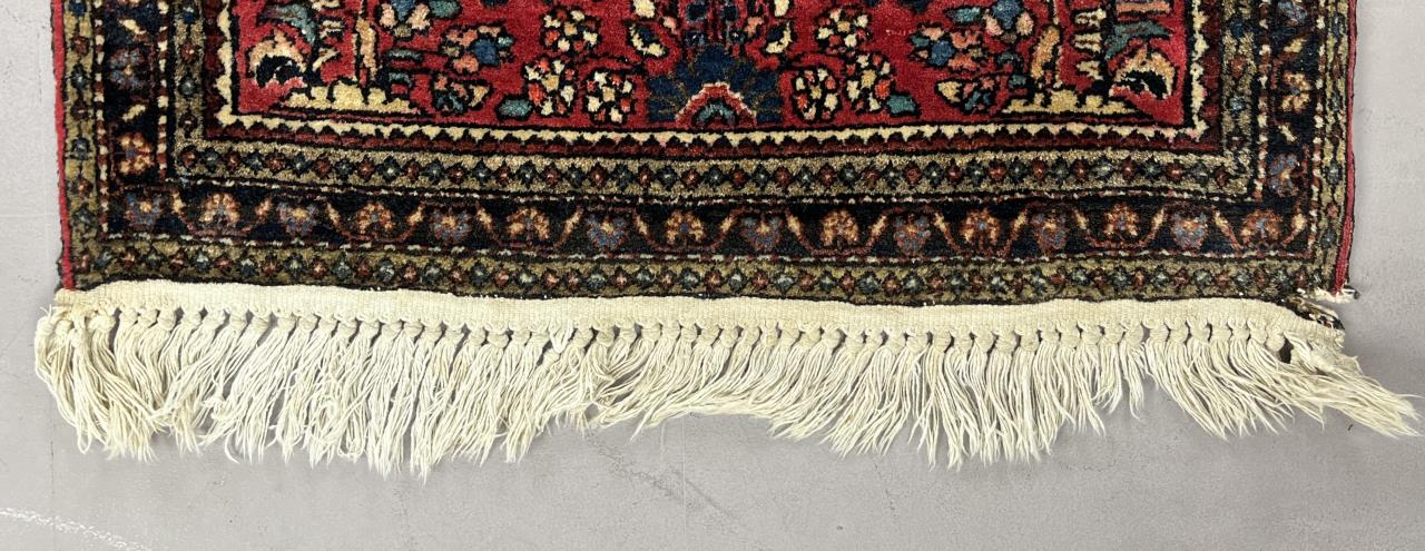 Semi antique Persian Sarouk, circa early to mid 20th Century, approximately 4’1″ x 2′ 1-1/2″ (not including fringe). CONDITION: Minor losses to borders at top and bottom, later attached fringe, wear and damage on salvage edges, please see last photo. SHIPPING: In-House Shipping Available. Please read our Shipping Policies and Terms and Conditions