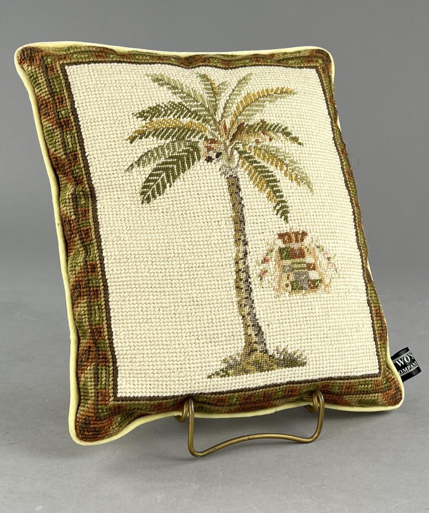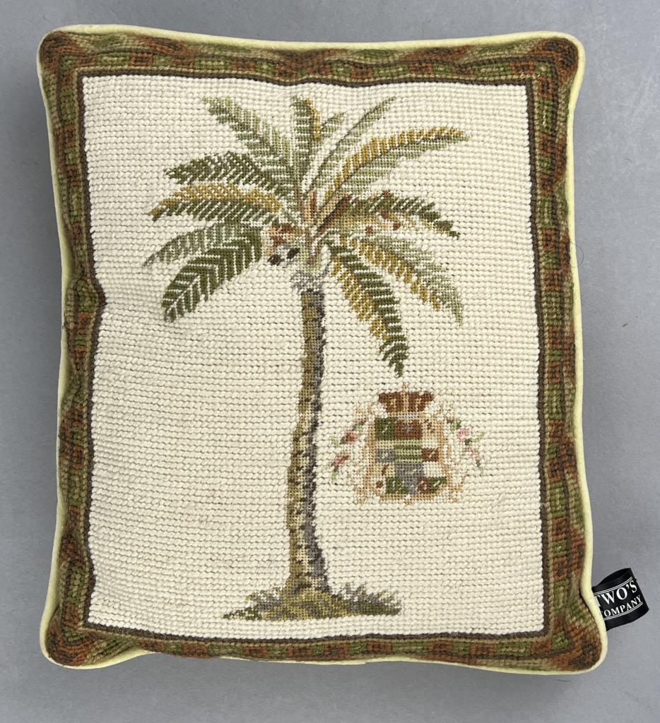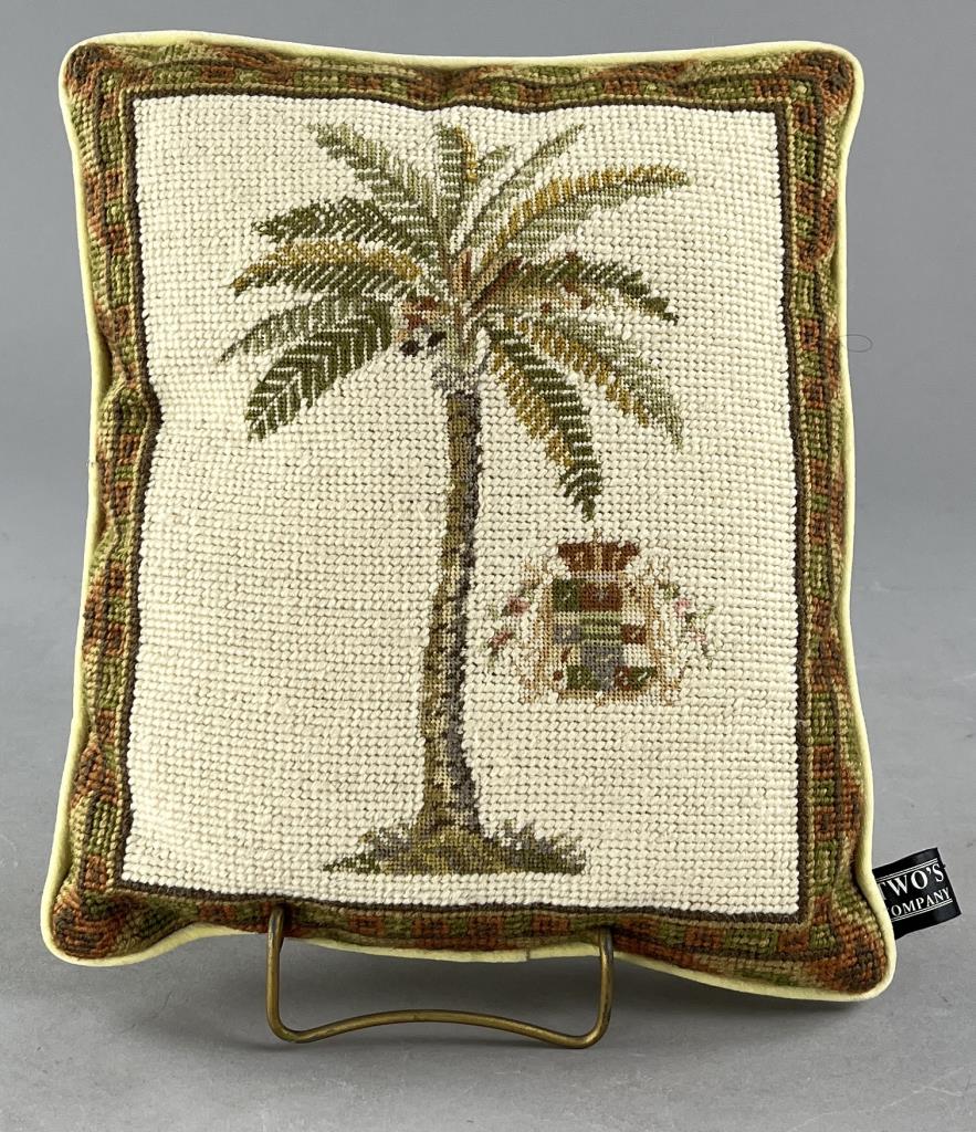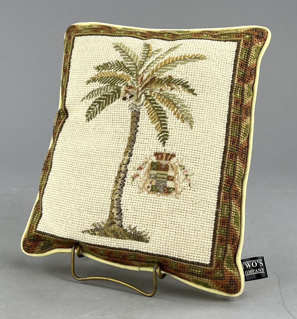 Petite point and needlepoint decorative throw pillow, featuring a palm tree and an armorial crest, velvet back, approximately 11-1/2″ x 9-3/4″. CONDITION: Some very minor spotting on the back. SHIPPING: In-House Shipping Available. Please read our Shipping Policies and Terms and Conditions