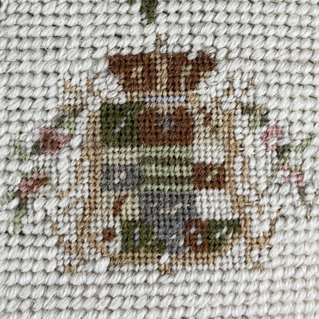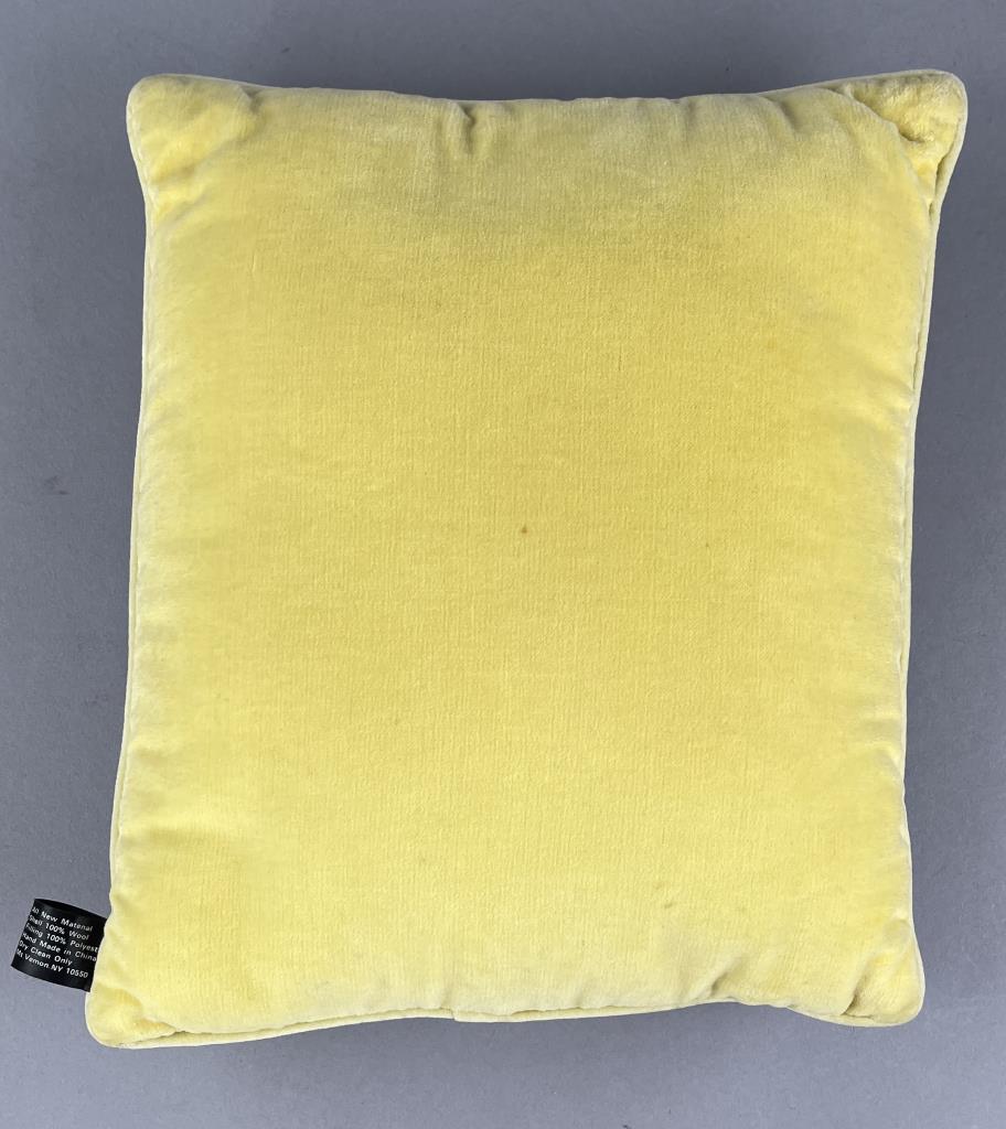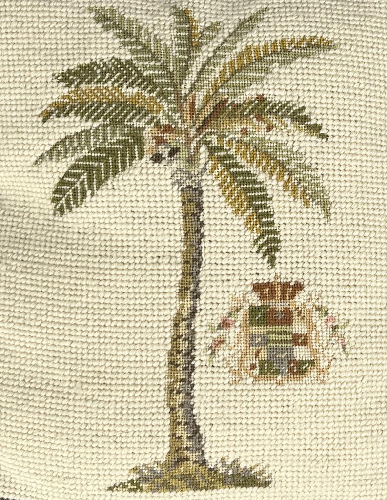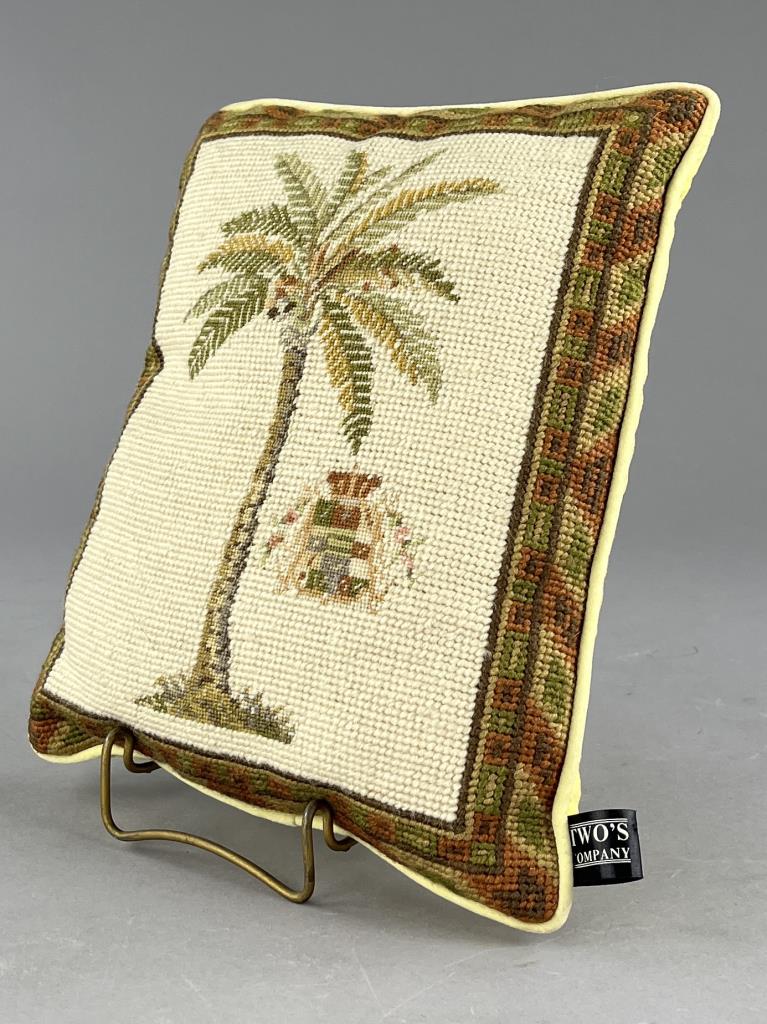 Petite point and needlepoint decorative throw pillow, featuring a palm tree and an armorial crest, velvet back, approximately 11-1/2″ x 9-3/4″. CONDITION: Some very minor spotting on the back. SHIPPING: In-House Shipping Available. Please read our Shipping Policies and Terms and Conditions