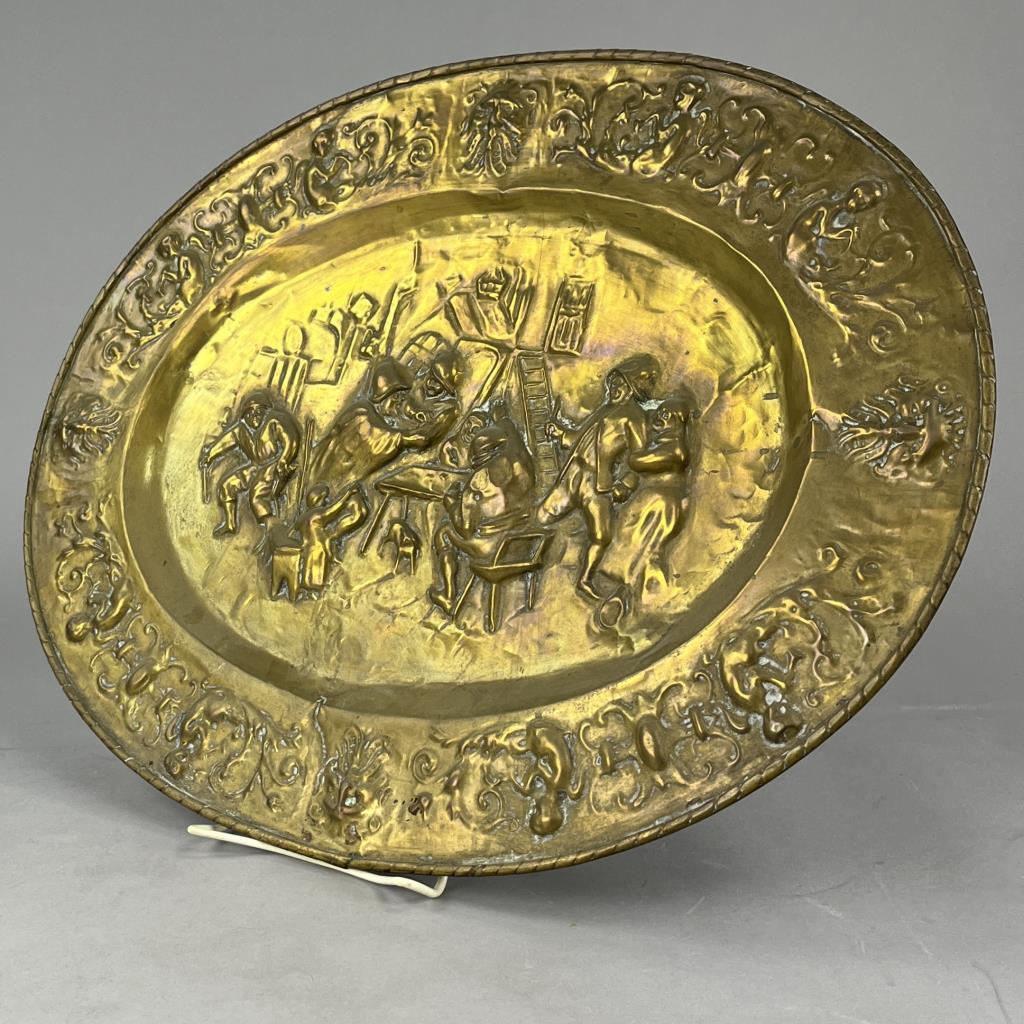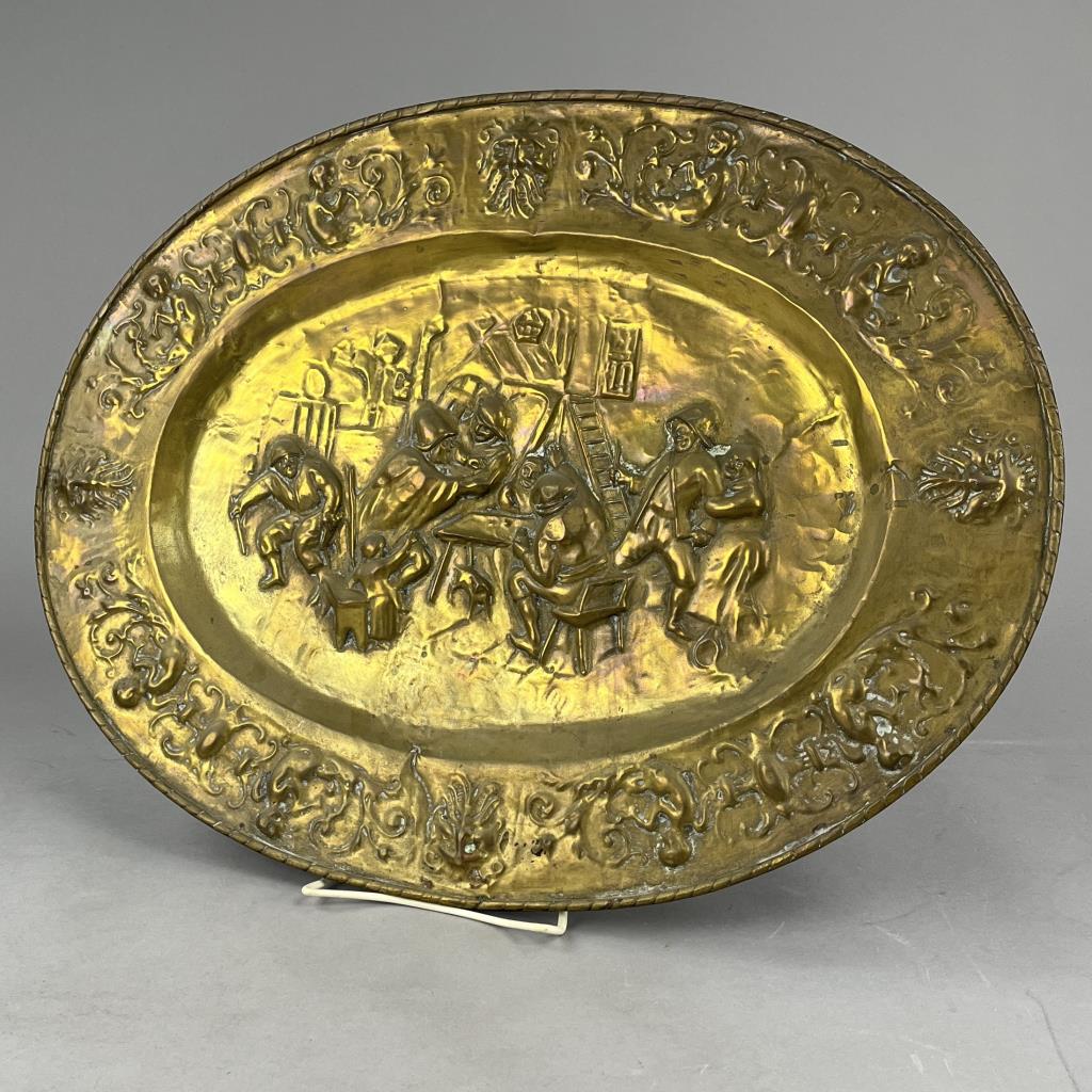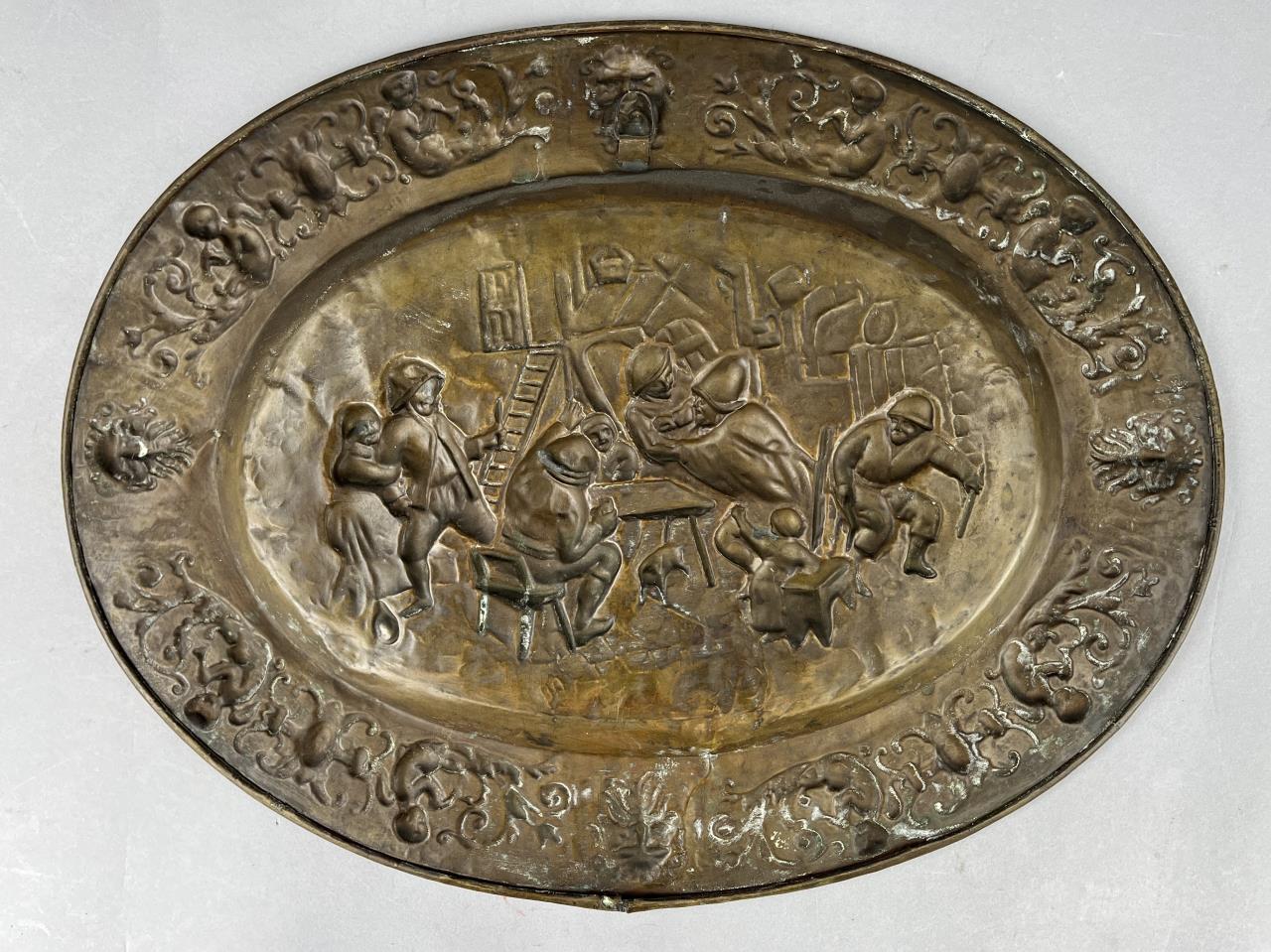 Antique oval wall plaque, depicting a tavern scene, repousse brass, European, early 20th Century, 21-11/16′ x 16-5/8″. CONDITION: Some areas of minor damage. SHIPPING: In-House Shipping Available. Please read our Shipping Policies and Terms and Conditions