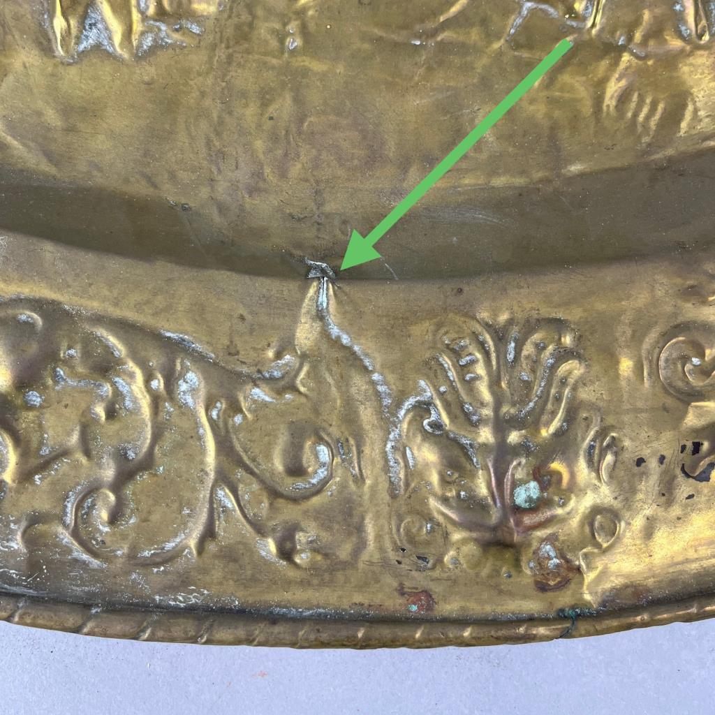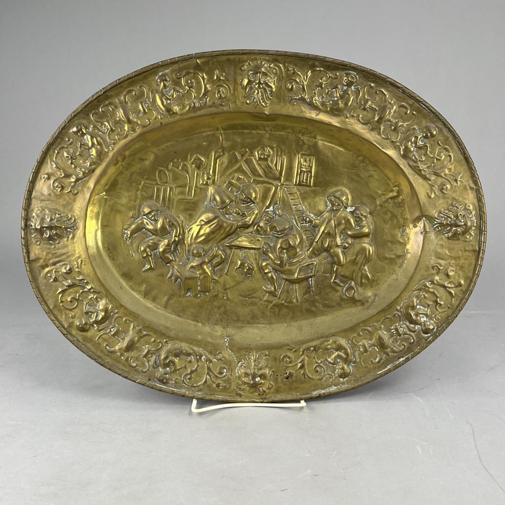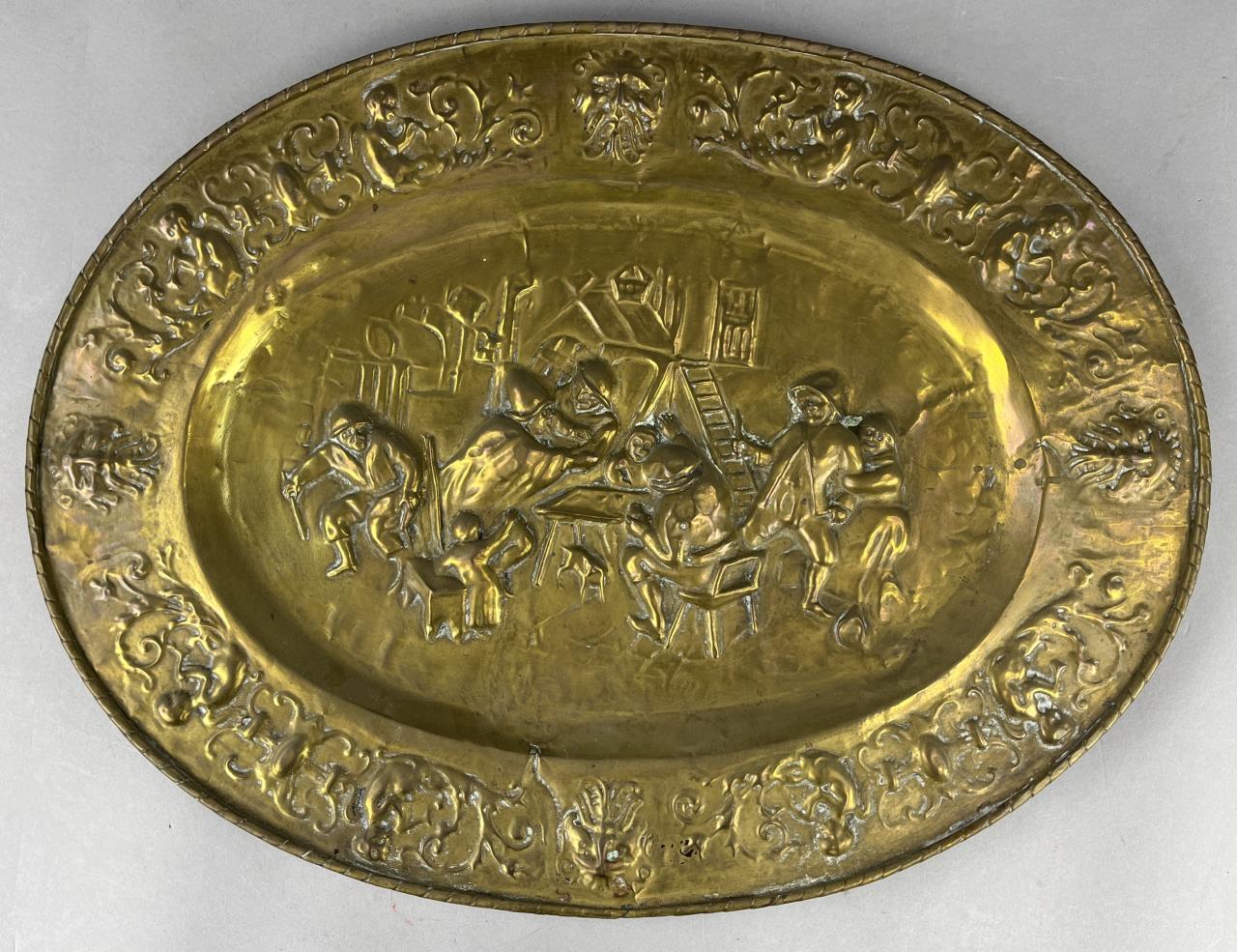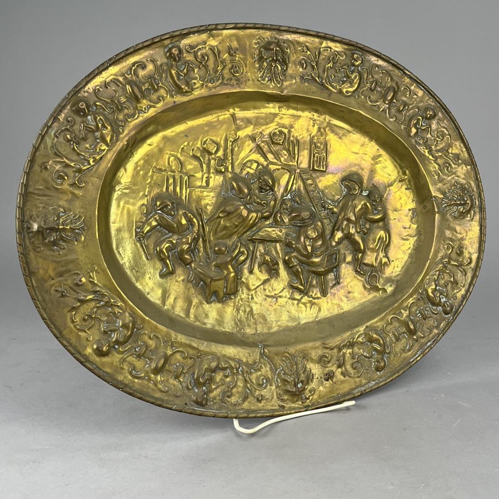 Antique oval wall plaque, depicting a tavern scene, repousse brass, European, early 20th Century, 21-11/16′ x 16-5/8″. CONDITION: Some areas of minor damage. SHIPPING: In-House Shipping Available. Please read our Shipping Policies and Terms and Conditions