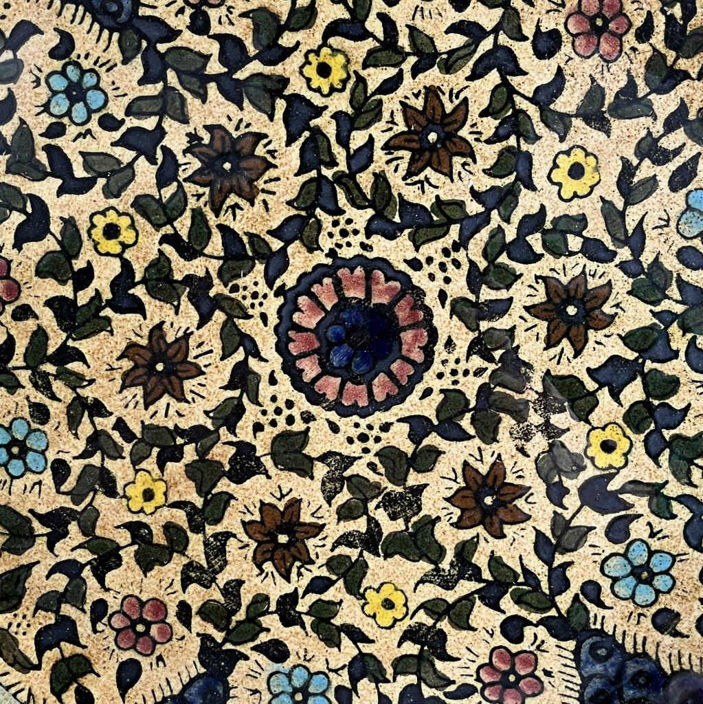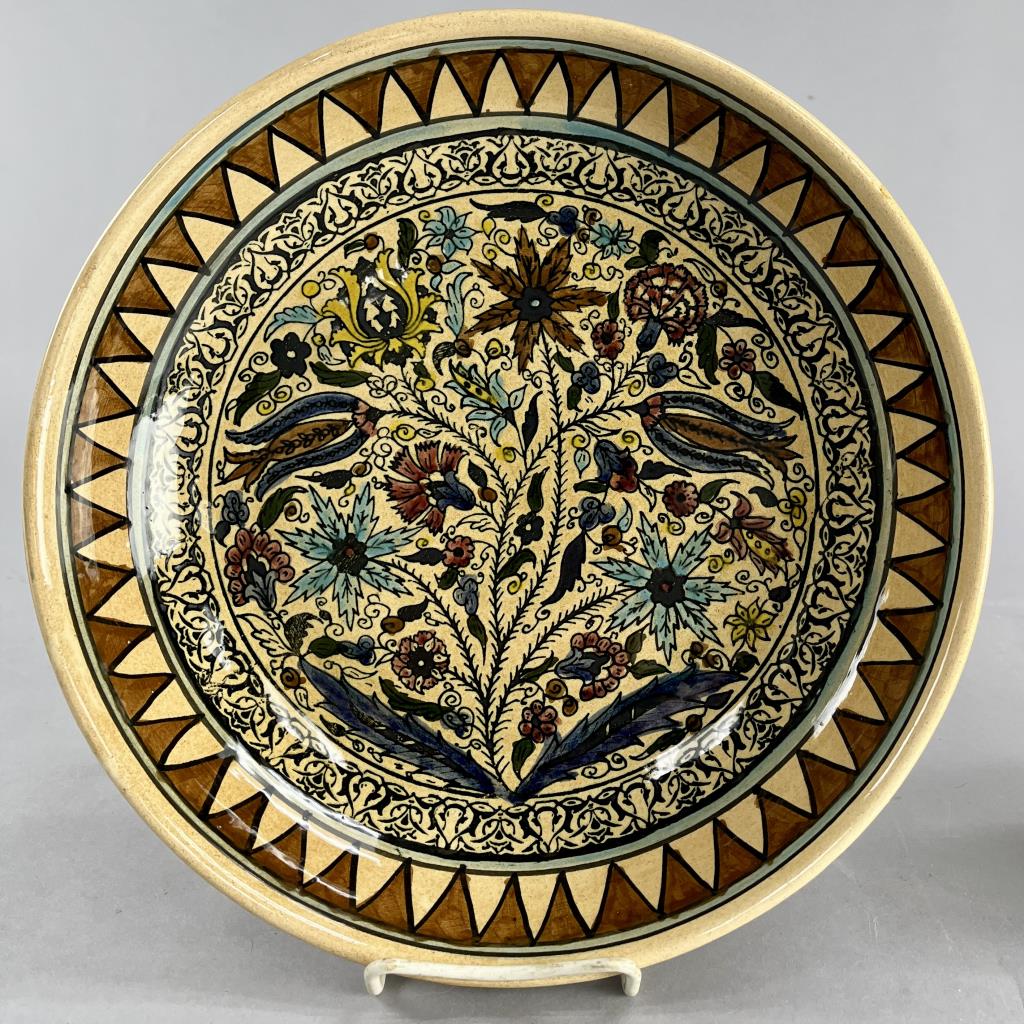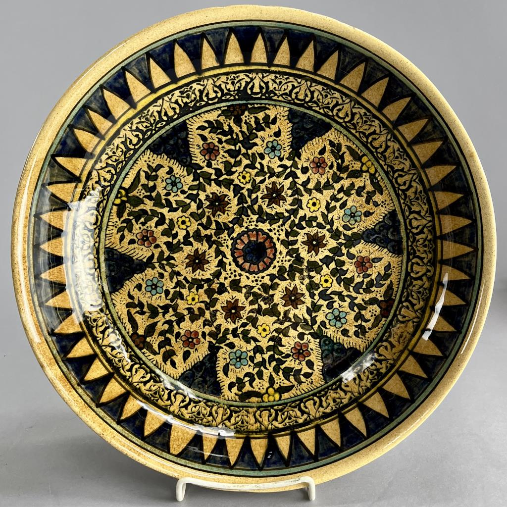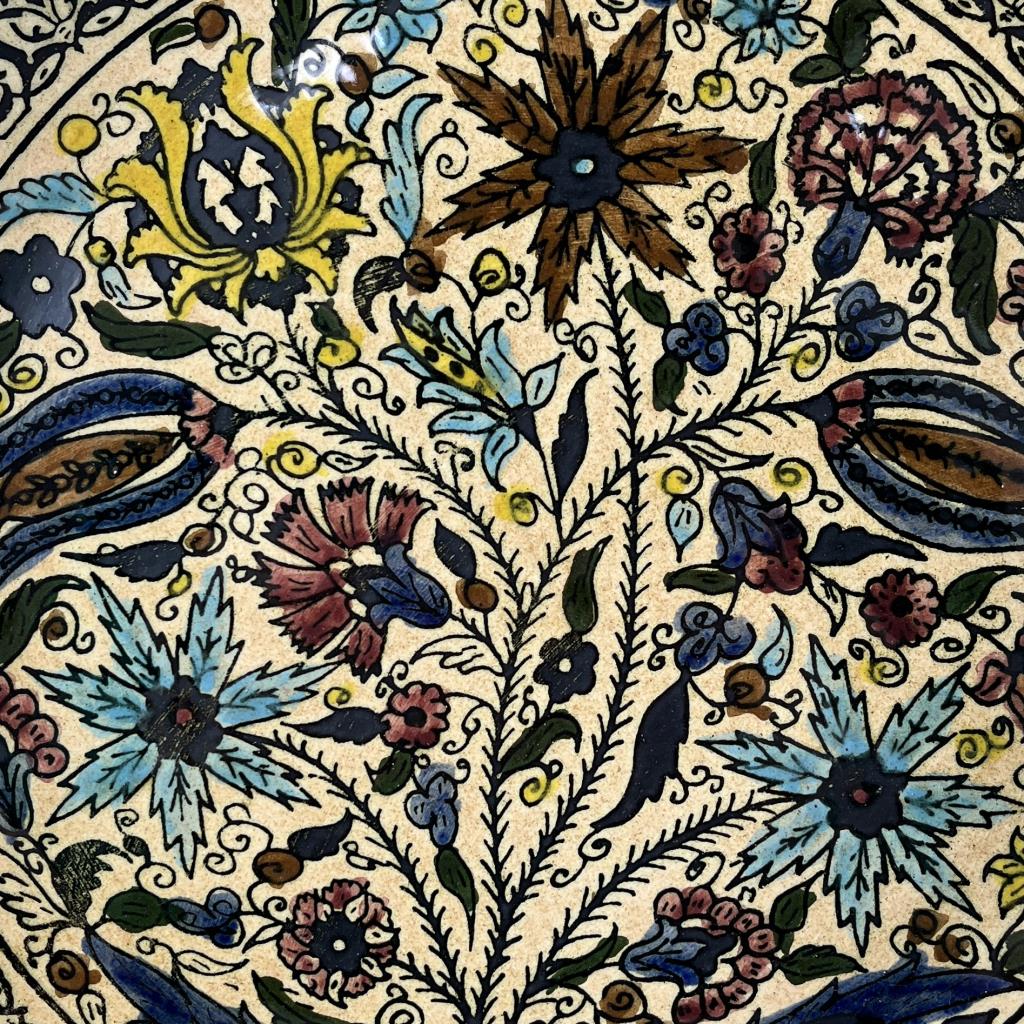 Two large Armenian style pottery fruit bowls, hand crafted and hand painted with floral motifs surrounded by geometric borders, unsigned but most likely made in Isreal in the mid to late 20th Century, each approximately 13-1/4″ (diameter) x 2-3/4″ (depth). CONDITION: SHIPPING: In-House Shipping Available. Please read our Shipping Policies and Terms and Conditions