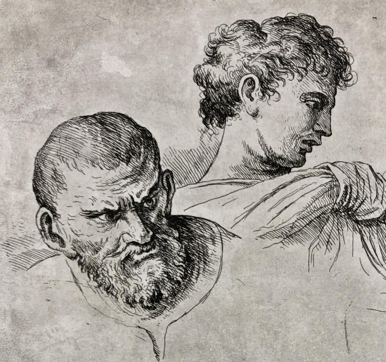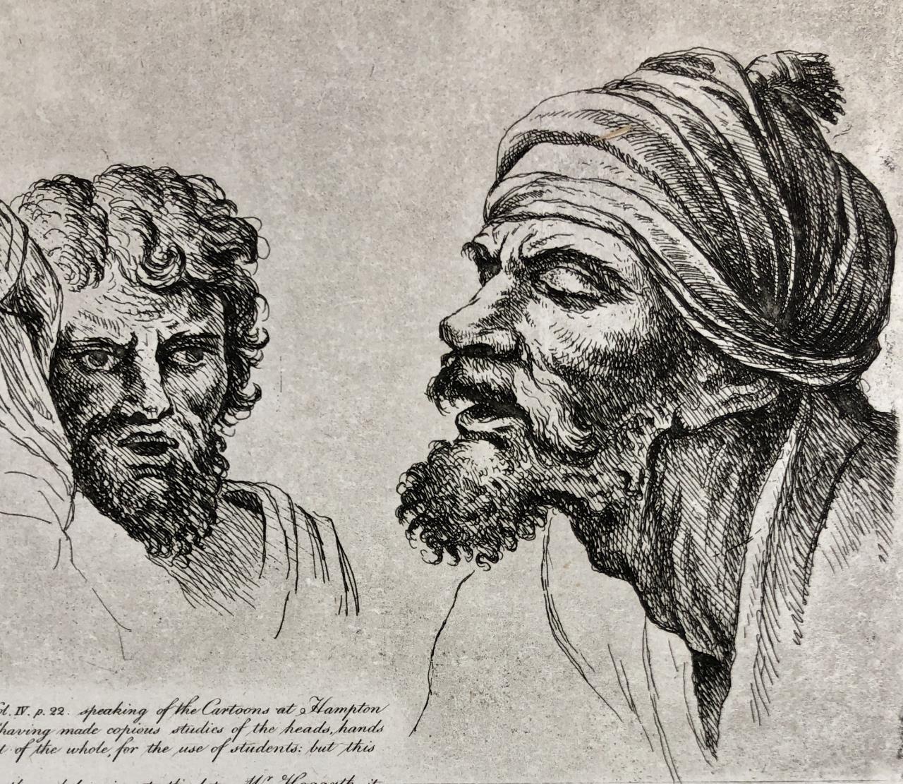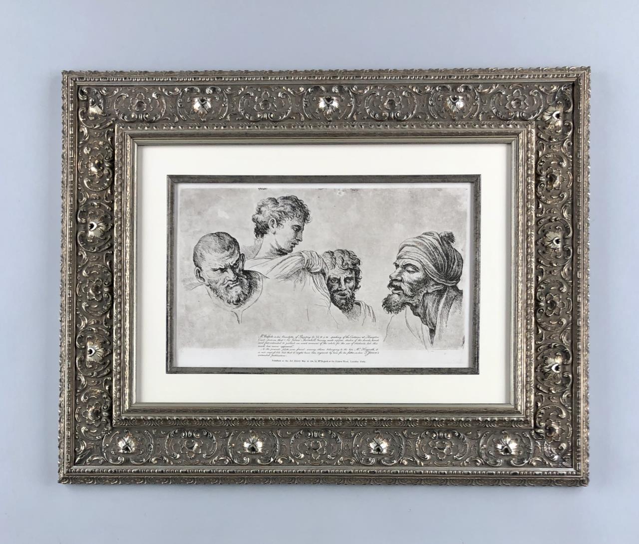 Framed contemporary copy of an artist study, attributed to William Hogarth (British, 1697 – 1764), of the “Four Heads From the Raphael Cartoons at Hampton Court,” circa late 20th Century. In a silver gilt gesso and wood frame measuring 20-3/8″ x 25-7/8″. CONDITION: Not examined out of frame. SHIPPING: In-House Shipping Available. Please read our Shipping Policies and Terms and Conditions
