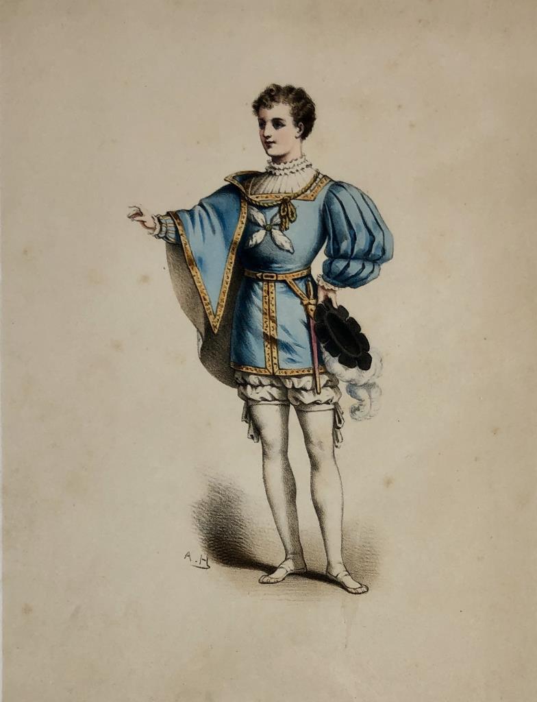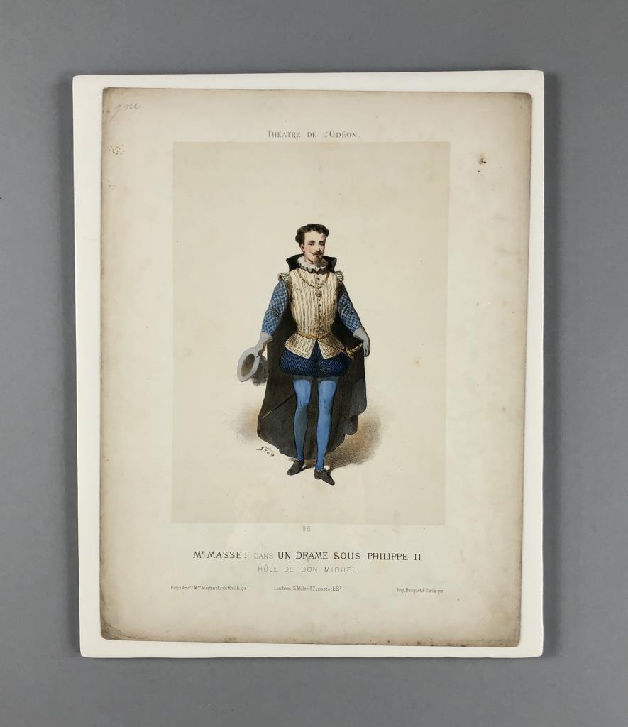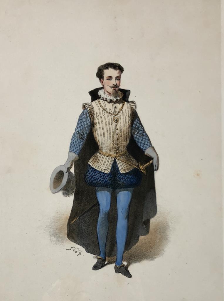 Two antique hand colored lithographs, both depicting male figures in costume, either historical or theatrical, French, mid to late 19th Century, each measuring approximately 14-1/4″ x 10-7/8″. CONDITION: Not examined out of wrap. Some discoloration and foxing. SHIPPING: In-House Shipping Available. Please read our Shipping Policies and Terms and Conditions