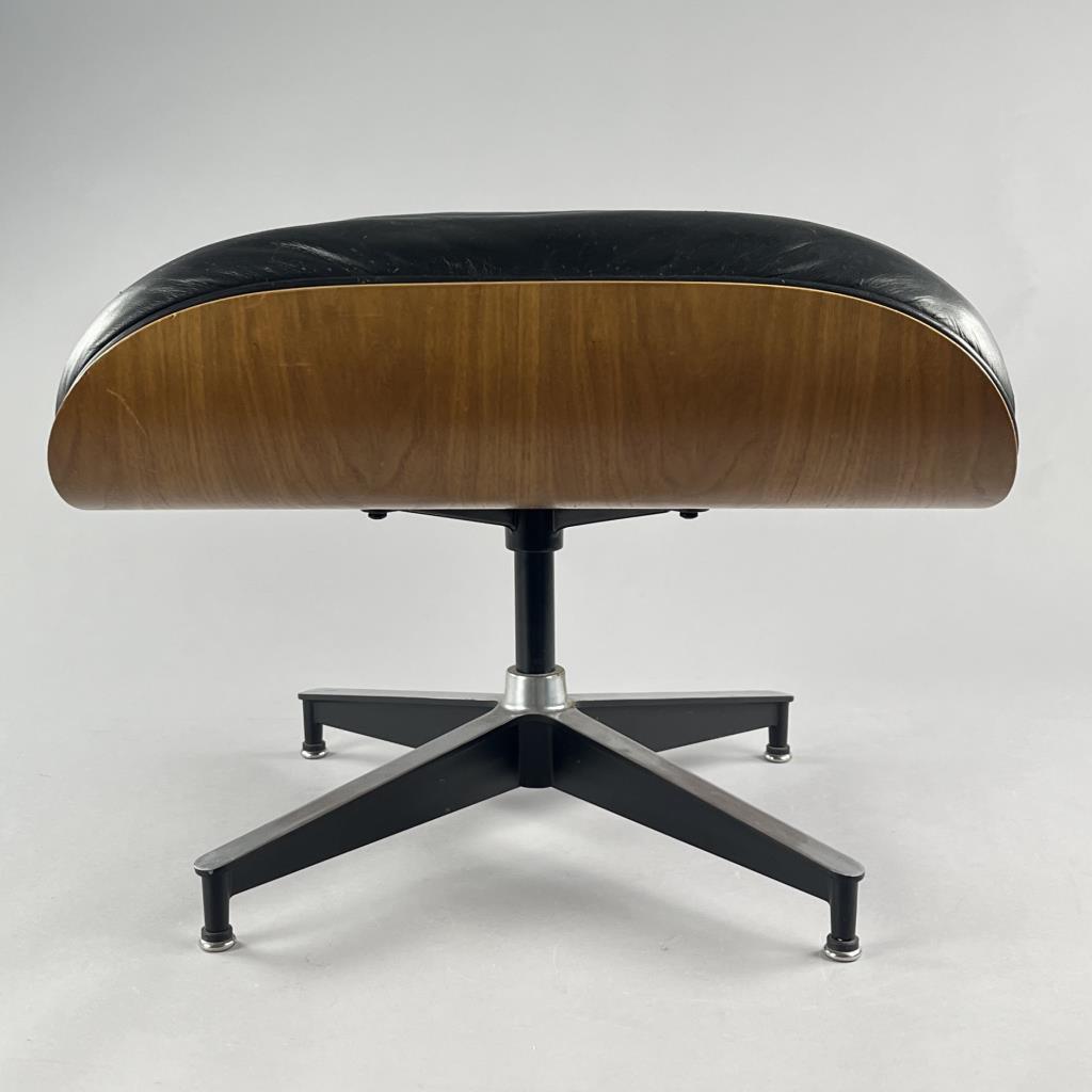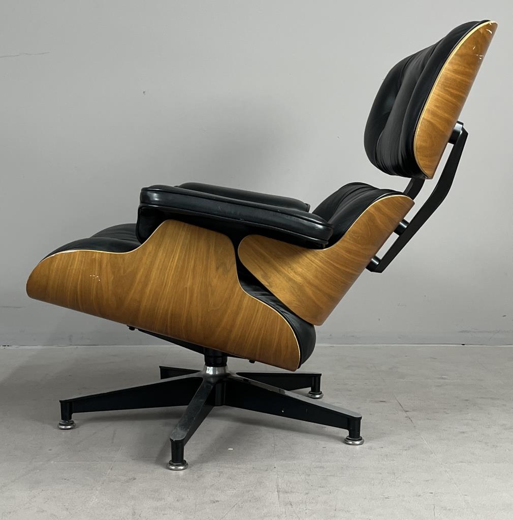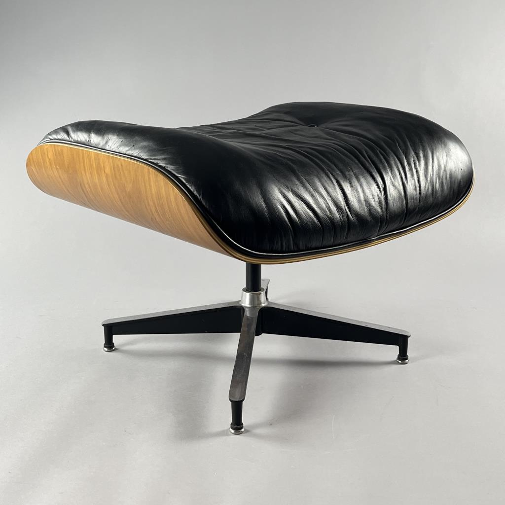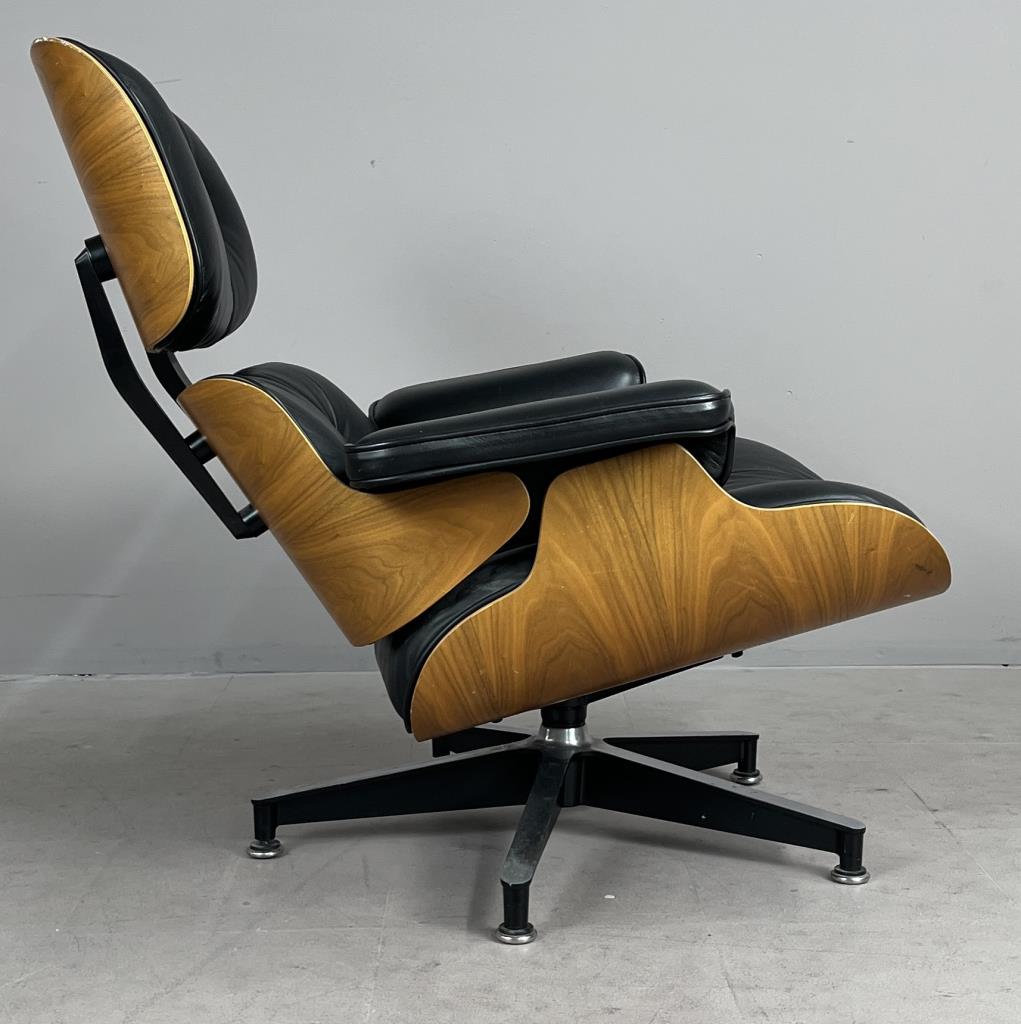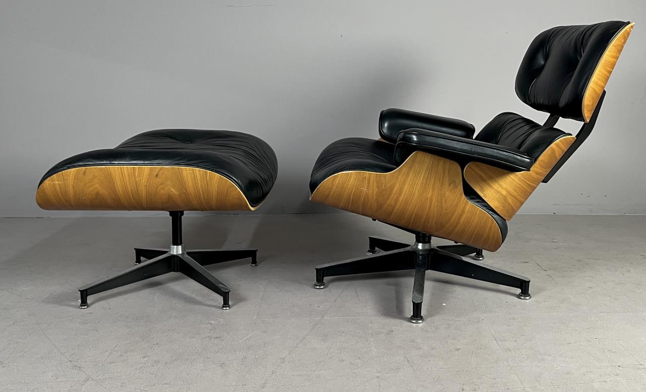 Eames lounge chair and matching ottoman (5th generation), designed by the husband and wife team of Charles Eames (American, 1907-1978) and Ray (Kaiser) Eames (American, 1912-1988), first introduced in 1956, and produced by Herman Miller (Zealand, Michigan). Seven-ply molded walnut plywood, powder-coated and brushed aluminum, and black tufted leather upholstery. Circa early to mid 1990s. The chair measures approximately 33-1/2″ x 31-1/2 x 35″ and the ottoman approximately 26″ x 20-3/4″ x 17-1/4″. Included also is the original brochure, dated 1991. CONDITION: Some very minor scuffing to wood and leather. SHIPPING: Local pick-up or third party shipping only for this lot. Please see the Shipping Policy for information on suggested shippers. We recommend the Pak Mail Store of Battle Creek to assist you. Please contact the shipper of your choice for shipping estimates on this lot. Refer to the Shipping section in our full Terms and Conditions for all information on shipping.