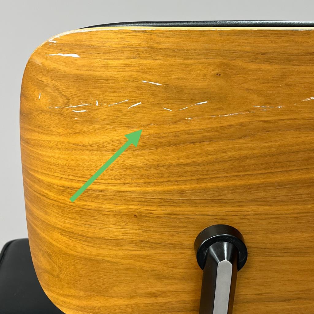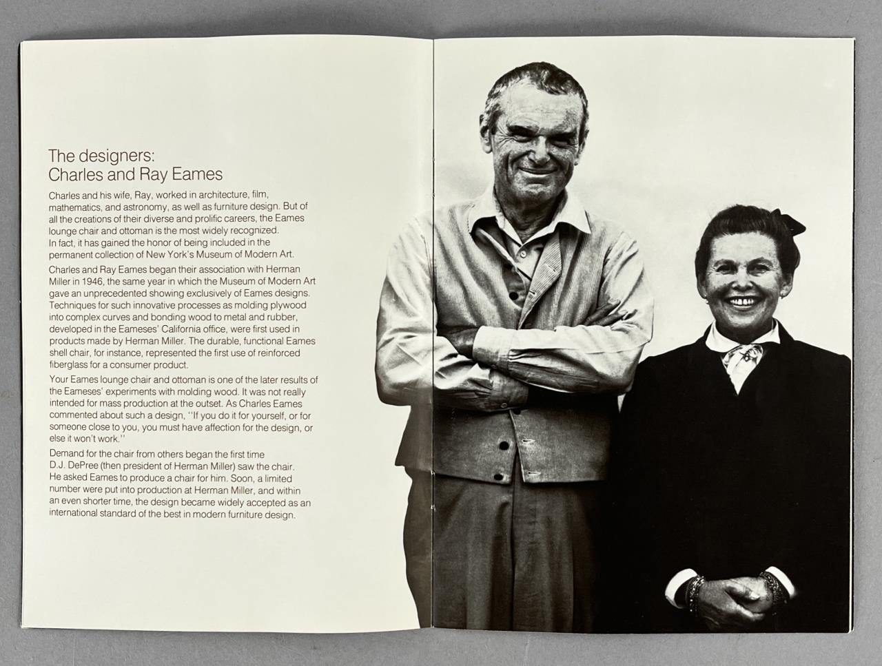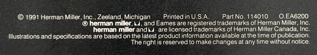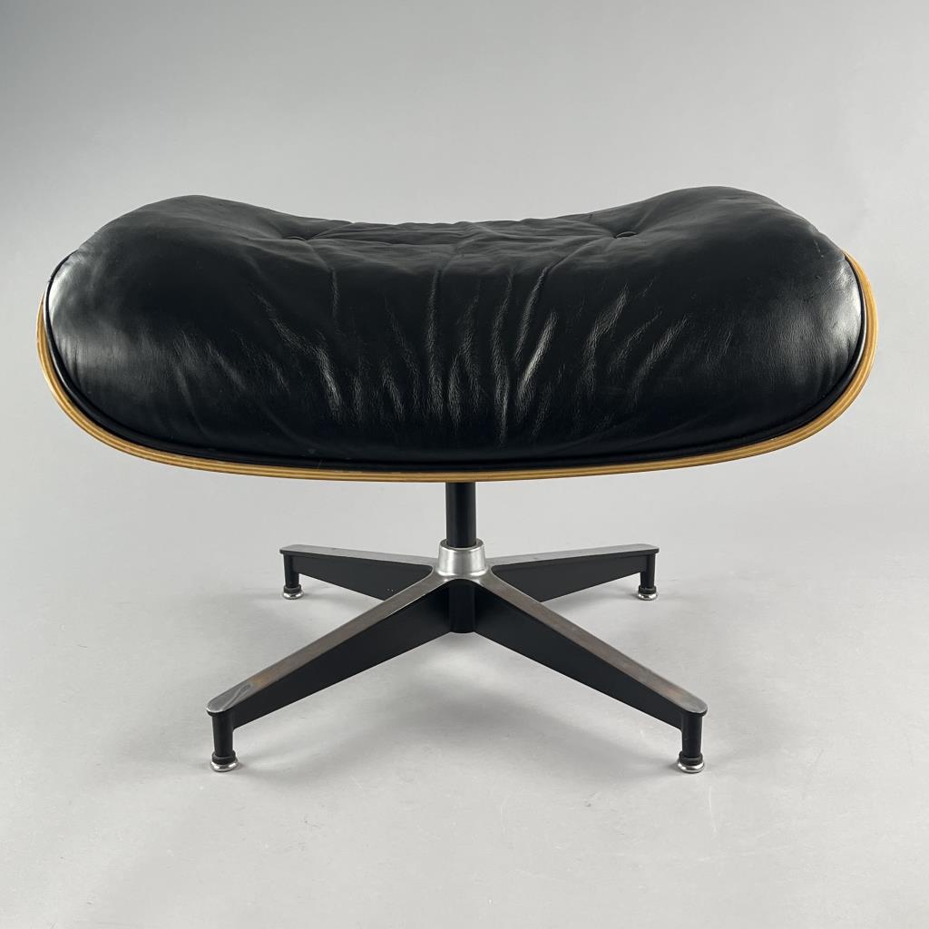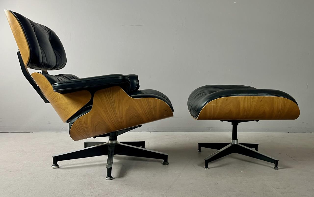 Eames lounge chair and matching ottoman (5th generation), designed by the husband and wife team of Charles Eames (American, 1907-1978) and Ray (Kaiser) Eames (American, 1912-1988), first introduced in 1956, and produced by Herman Miller (Zealand, Michigan). Seven-ply molded walnut plywood, powder-coated and brushed aluminum, and black tufted leather upholstery. Circa early to mid 1990s. The chair measures approximately 33-1/2″ x 31-1/2 x 35″ and the ottoman approximately 26″ x 20-3/4″ x 17-1/4″. Included also is the original brochure, dated 1991. CONDITION: Some very minor scuffing to wood and leather. SHIPPING: Local pick-up or third party shipping only for this lot. Please see the Shipping Policy for information on suggested shippers. We recommend the Pak Mail Store of Battle Creek to assist you. Please contact the shipper of your choice for shipping estimates on this lot. Refer to the Shipping section in our full Terms and Conditions for all information on shipping.