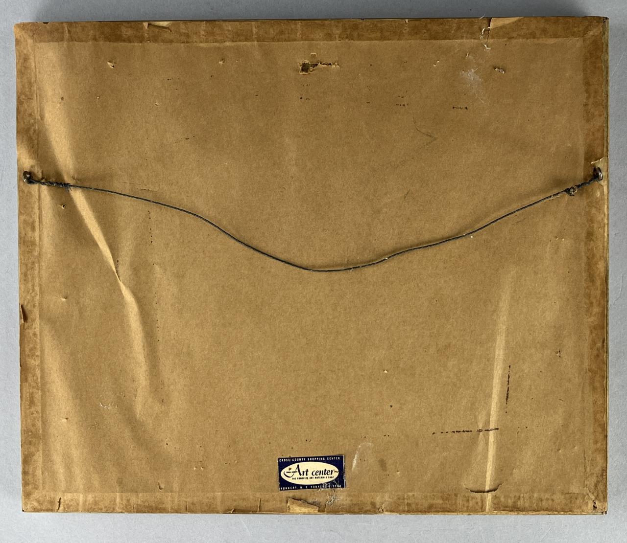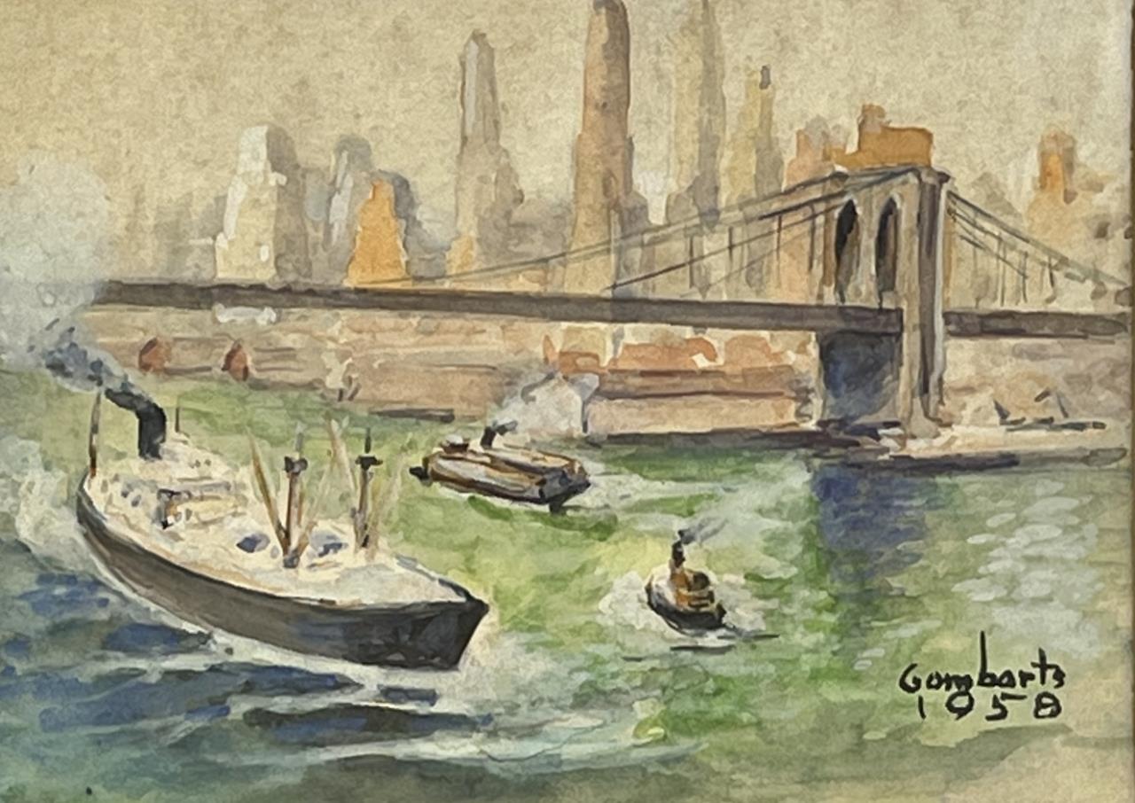 Watercolor painting, showing the Brooklyn Bridge, the Lower Eastside skyline of New York City, a steamship freighter, a tugboat, and possibly a ferry boat, signed lower right “Gombartz 1958″, in a painted wood frame measuring 11-1/16″ x 13-1/8”. CONDITION: Not examined out of frame. SHIPPING: In-House Shipping Available. Please read our Shipping Policies and Terms and Conditions