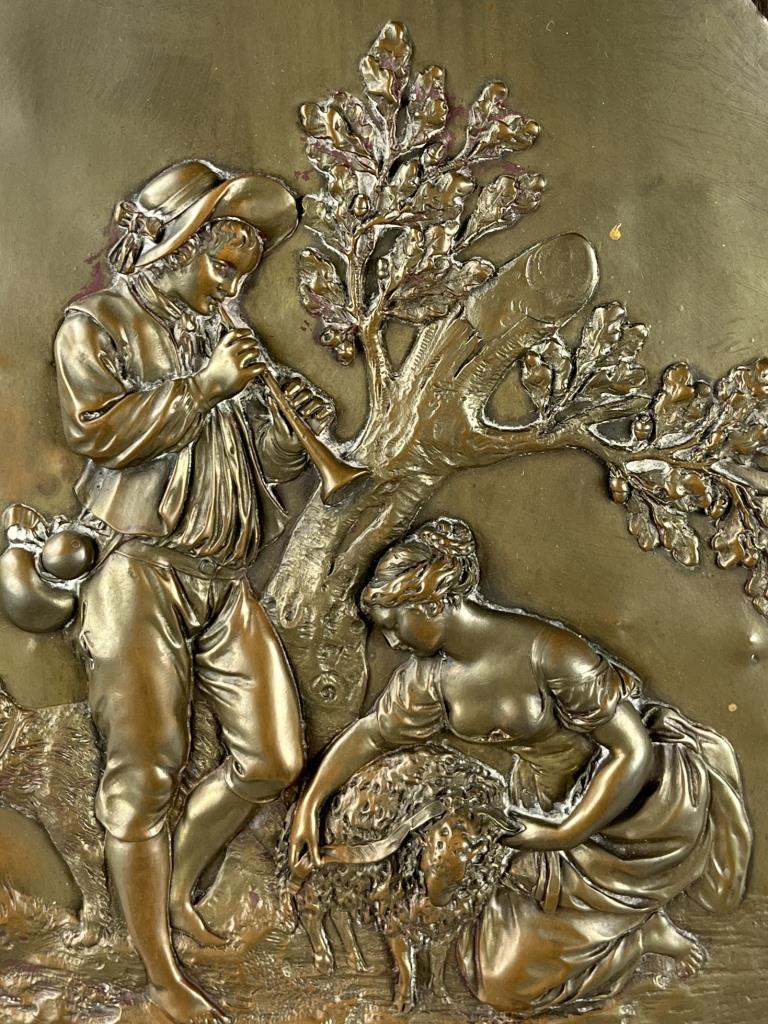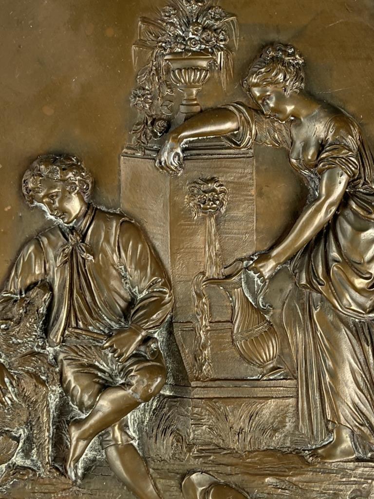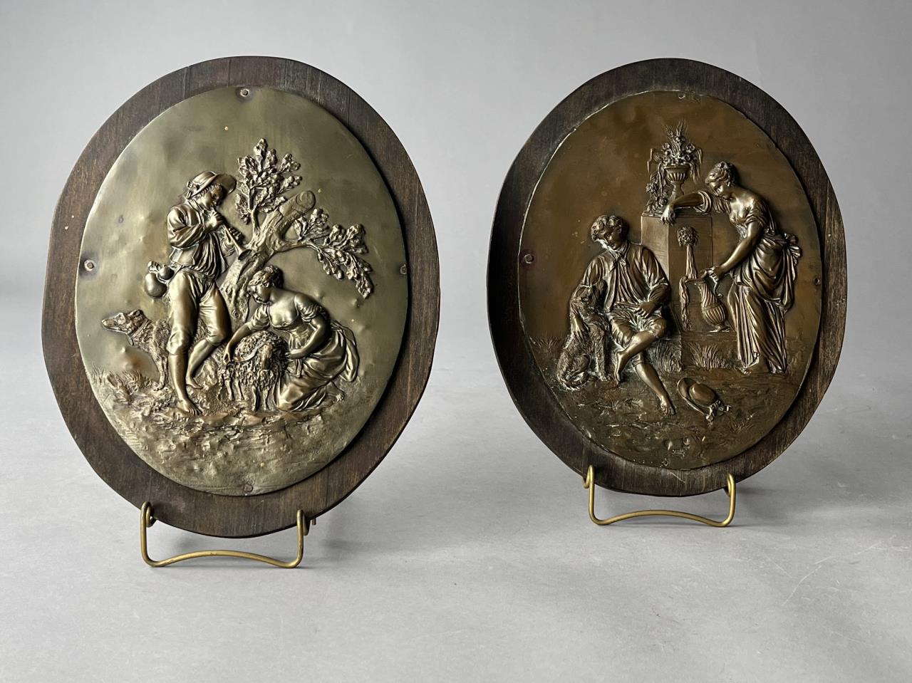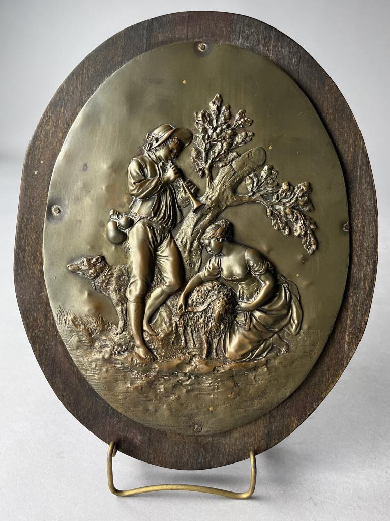 Pair of 19th Century French bas relief copper medallion plaques, depicting bucolic scenes of a shepherd and shepherdess, most likely mounted to later wood bases measuring approximately 12″ x 9-1/2″. CONDITION: SHIPPING: In-House Shipping Available. Please read our Shipping Policies and Terms and Conditions