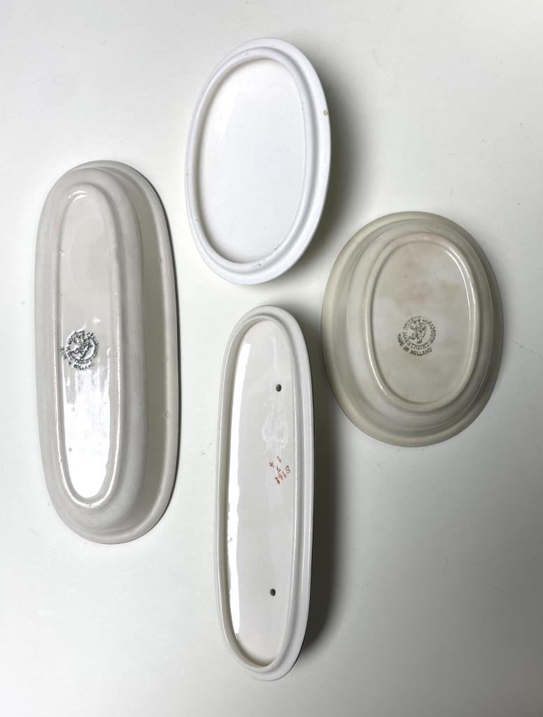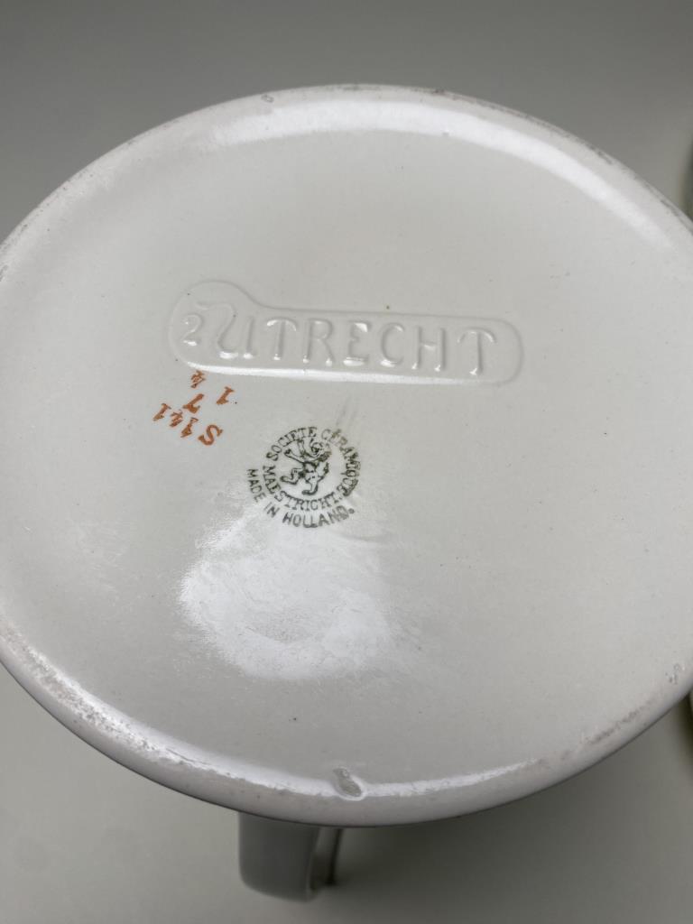 A Dutch Washstand set including a pitcher and bowl with two covered dishes. It is marked “Societe Ceramique Marstricht Made in Holland” with “2 Utrecht” embossed on the bottom of the pitcher. The height of the pitcher is 10-1/2″. CONDITION: There is some crazing and discoloration on the covered dishes and the bowl. There are hairlines on the bowl and the soap dish. SHIPPING: In-House Shipping Available. Please read our Shipping Policies and Terms and Conditions