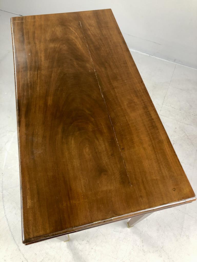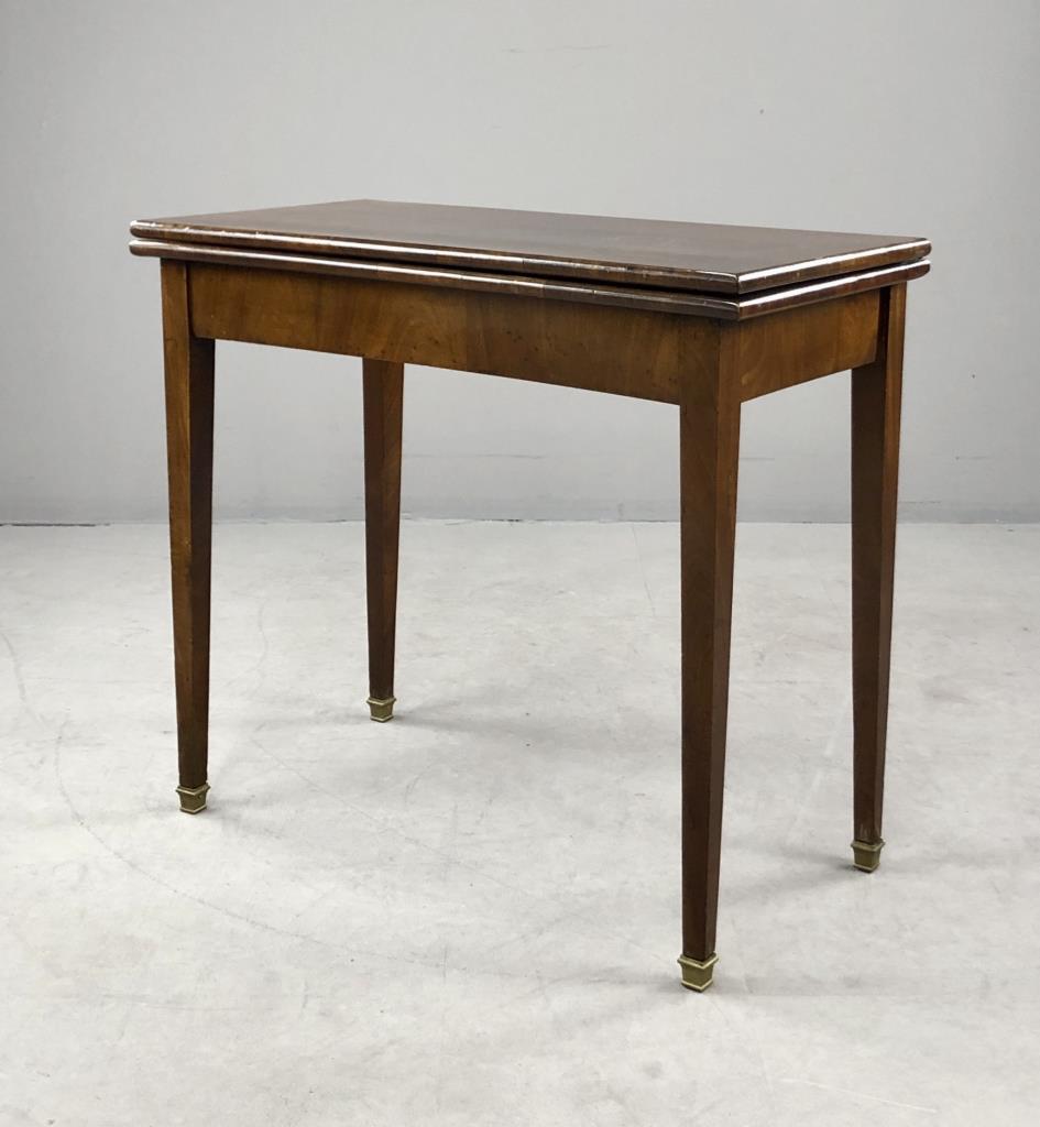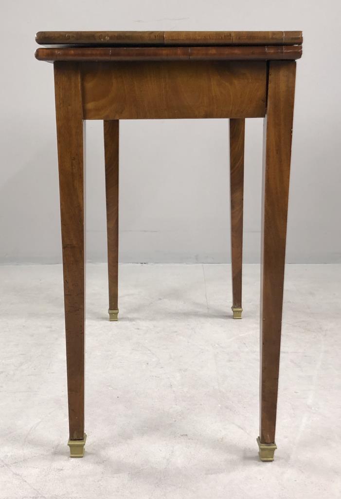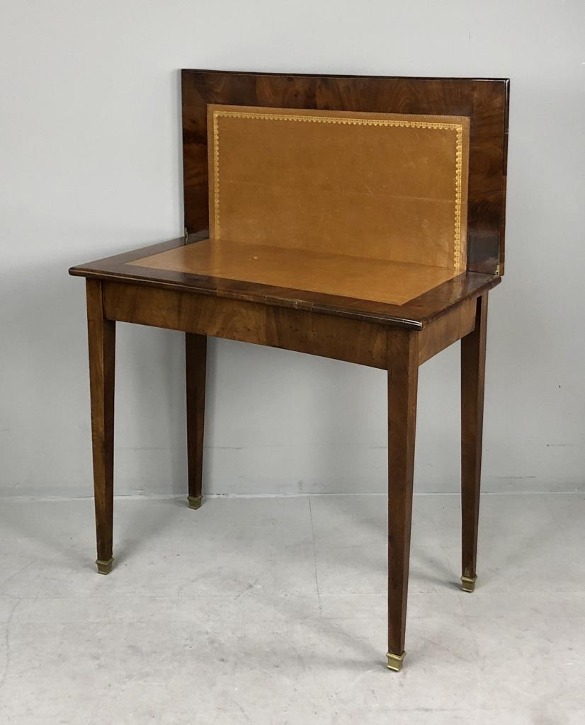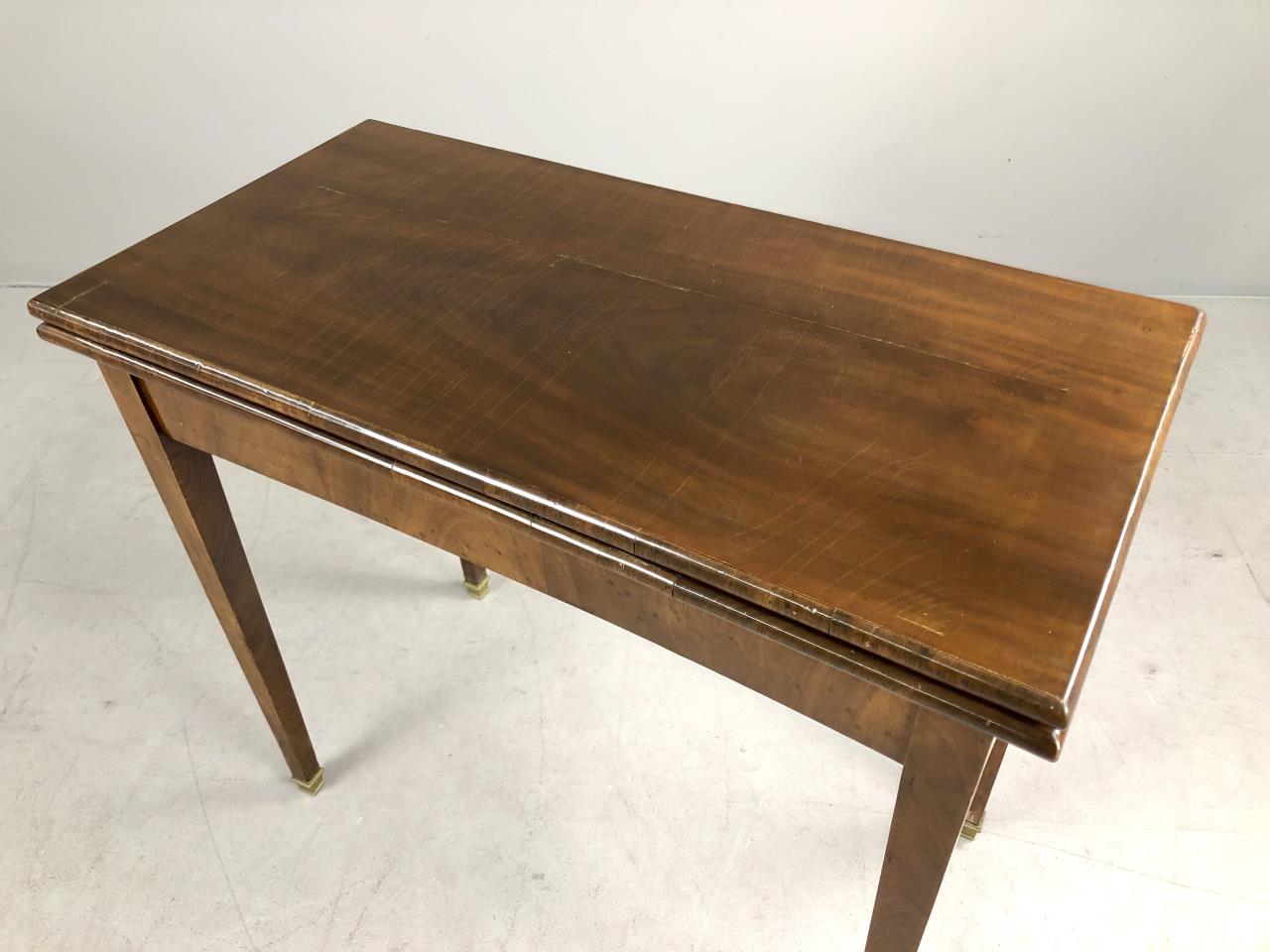 Antique French flip-top game table / console table, mahogany, tooled gilt leather, and brass foot caps, circa early 19th Century, 33″ x 16-1/2″ (33″ when opened) x 28-3/4″. CONDITION: Areas of repairs and restoration throughout, including two legs which appear to have been broken and partially replaced towards their bases, sections of the slides and drawer also appear to have been ether repaired or replaced, and the leather pad is most likely a later replacement. SHIPPING: Local pick-up or third party shipping only for this lot. Please see the Shipping Policy for information on suggested shippers. We recommend the Pak Mail Store of Battle Creek to assist you. Please contact the shipper of your choice for shipping estimates on this lot. Refer to the Shipping section in our full Terms and Conditions for all information on shipping.