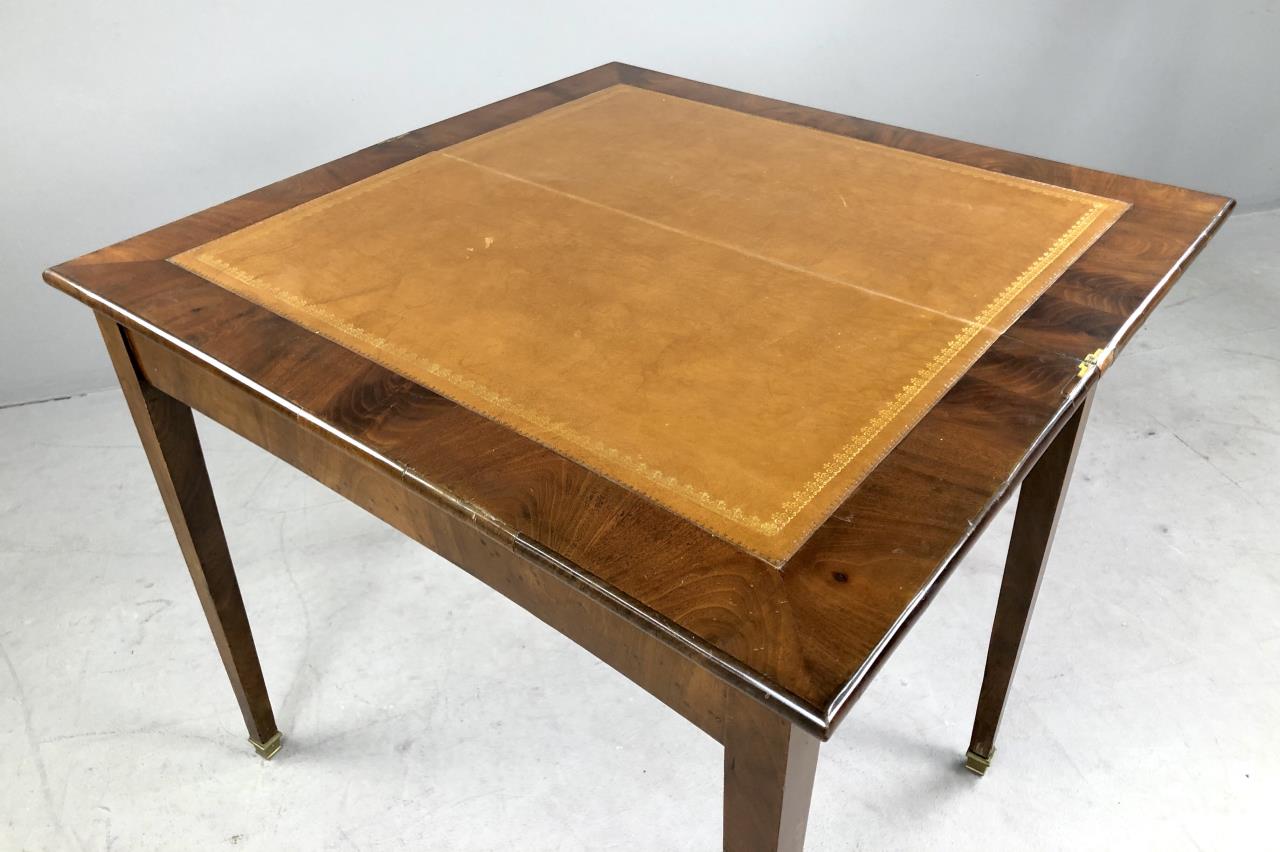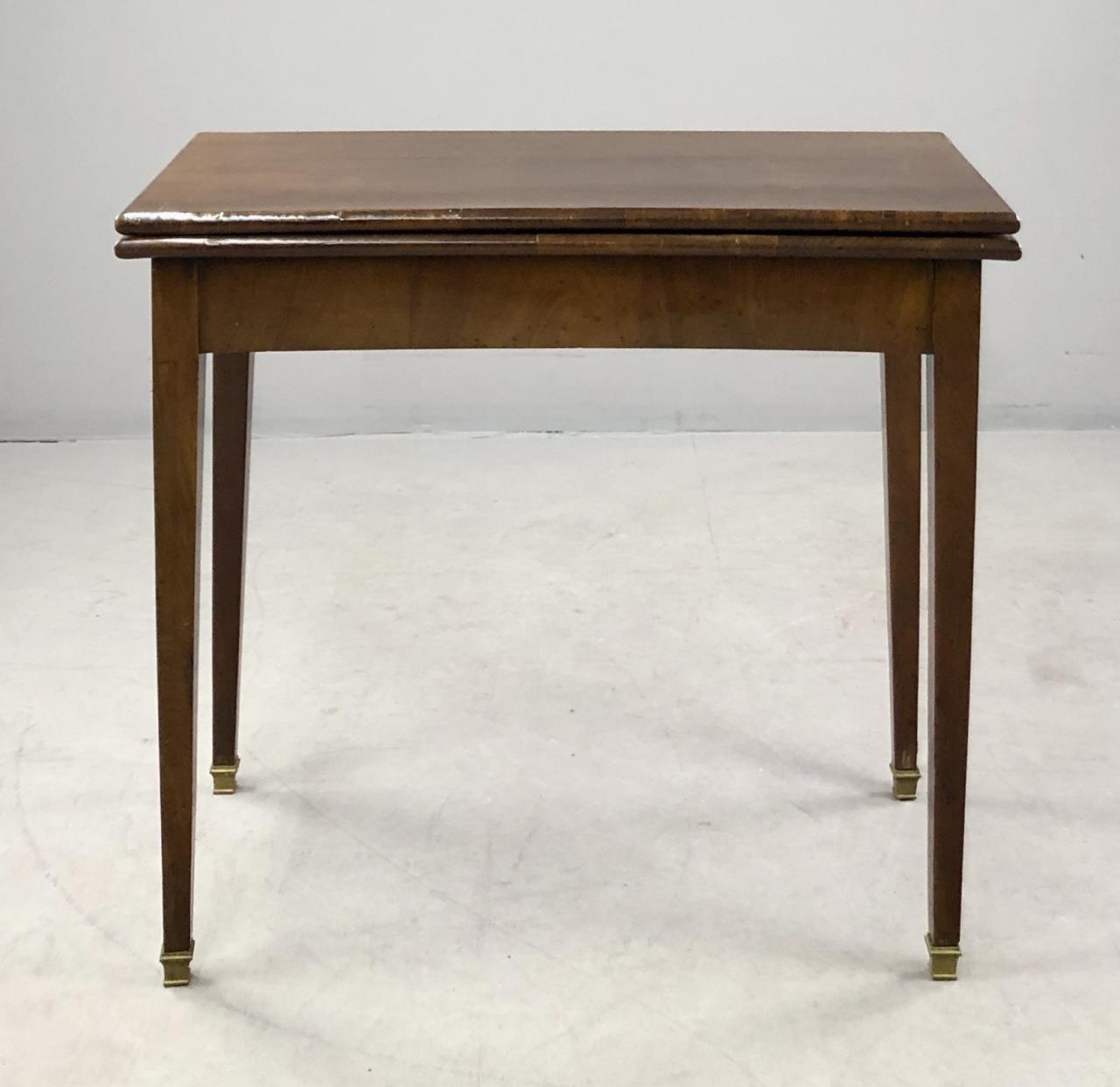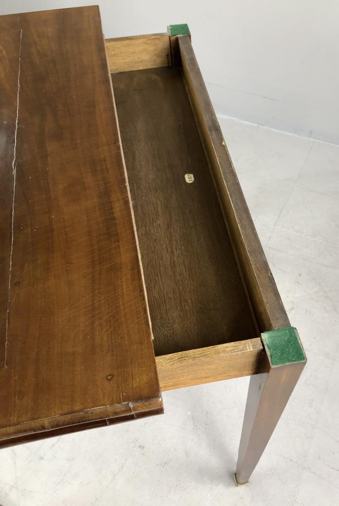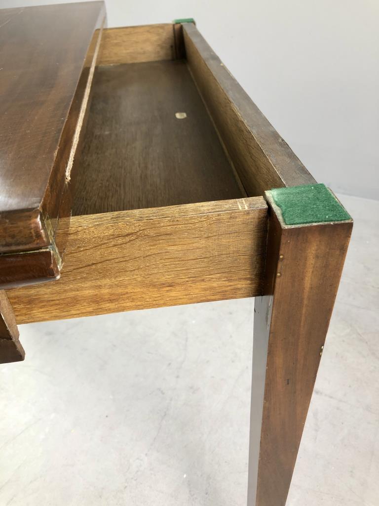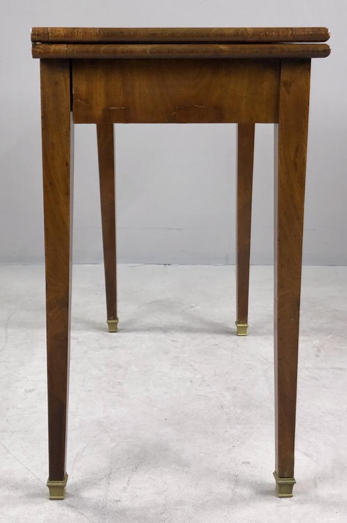 Antique French flip-top game table / console table, mahogany, tooled gilt leather, and brass foot caps, circa early 19th Century, 33″ x 16-1/2″ (33″ when opened) x 28-3/4″. CONDITION: Areas of repairs and restoration throughout, including two legs which appear to have been broken and partially replaced towards their bases, sections of the slides and drawer also appear to have been ether repaired or replaced, and the leather pad is most likely a later replacement. SHIPPING: Local pick-up or third party shipping only for this lot. Please see the Shipping Policy for information on suggested shippers. We recommend the Pak Mail Store of Battle Creek to assist you. Please contact the shipper of your choice for shipping estimates on this lot. Refer to the Shipping section in our full Terms and Conditions for all information on shipping.