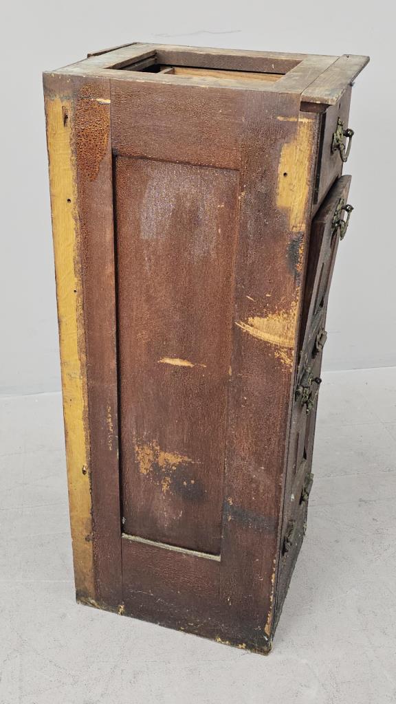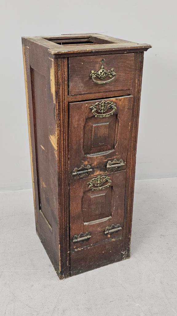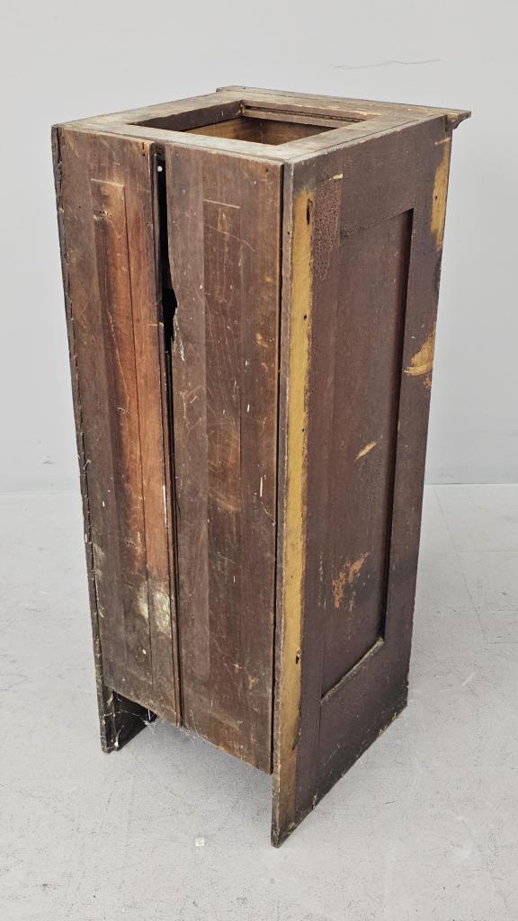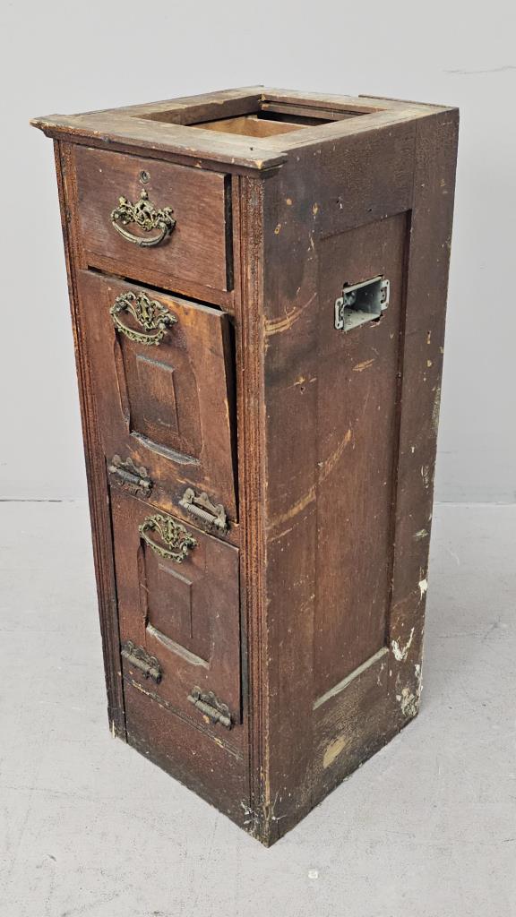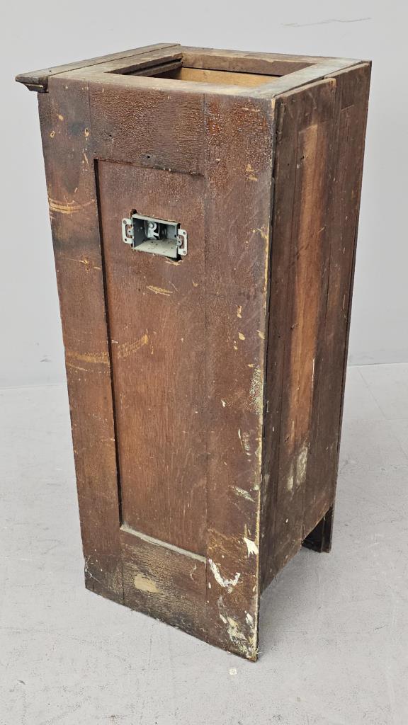 Antique single barber station, one drawer over two flip down doors, golden oak with cast brass hardware, late Victorian Era, circa 1890s / 1900s, approximately 15-1/2″ (L) x 14-3/4″ (W) x 37-1/2″ (H). CONDITION: No countertop and an electrical box has been added on one side. SHIPPING: Local pick-up or third party shipping only for this lot. Please see the Shipping Policy for information on suggested shippers. We recommend the Pak Mail Store of Battle Creek to assist you. Please contact the shipper of your choice for shipping estimates on this lot. Refer to the Shipping section in our full Terms and Conditions for all information on shipping.
