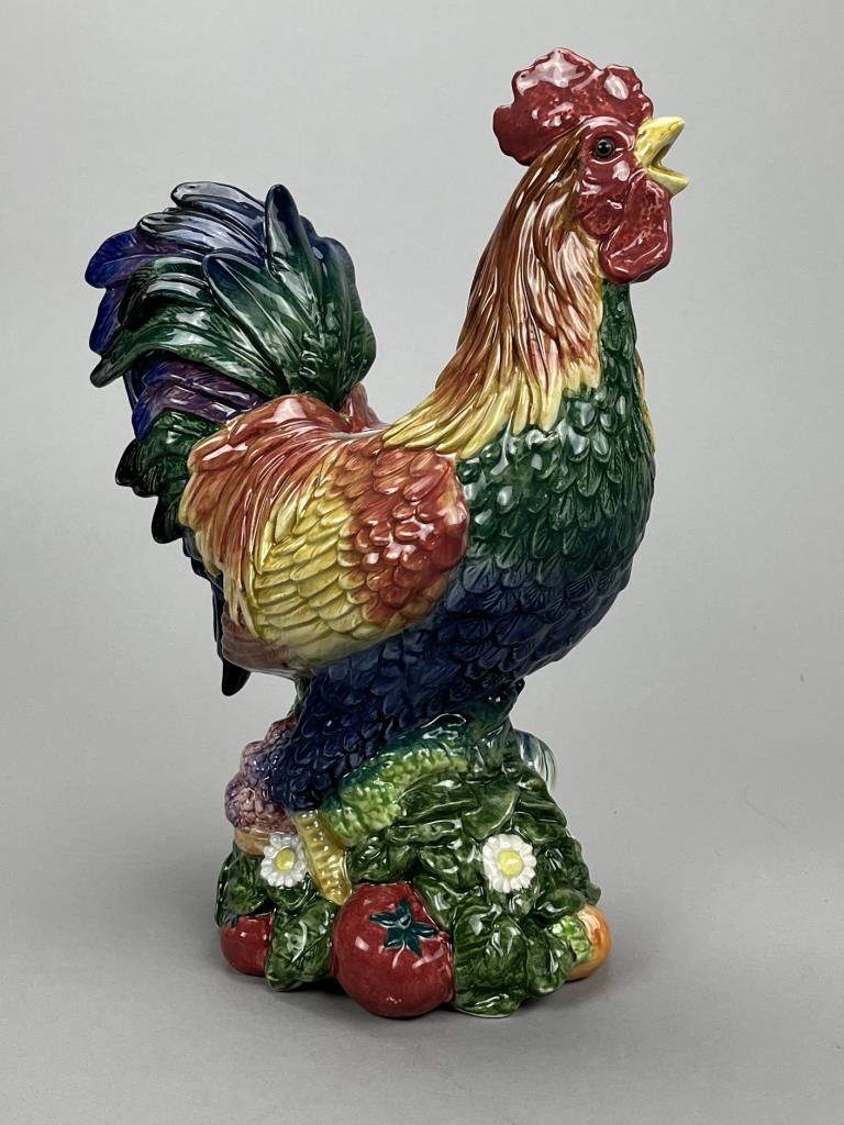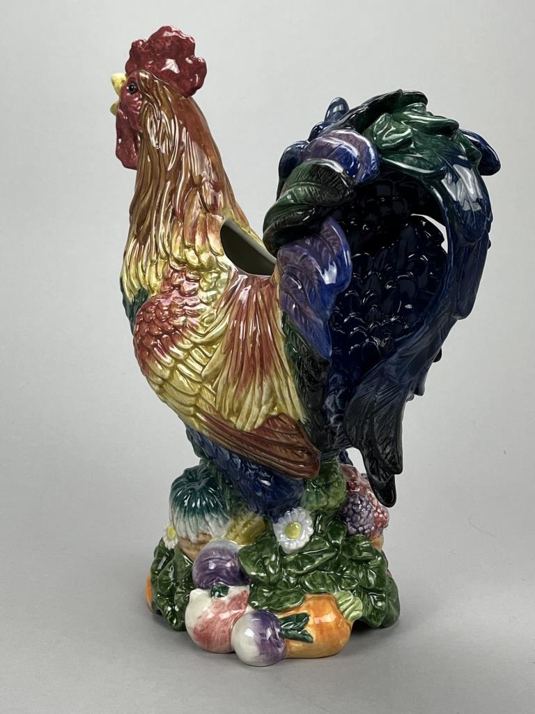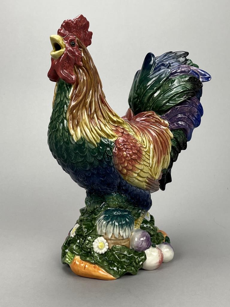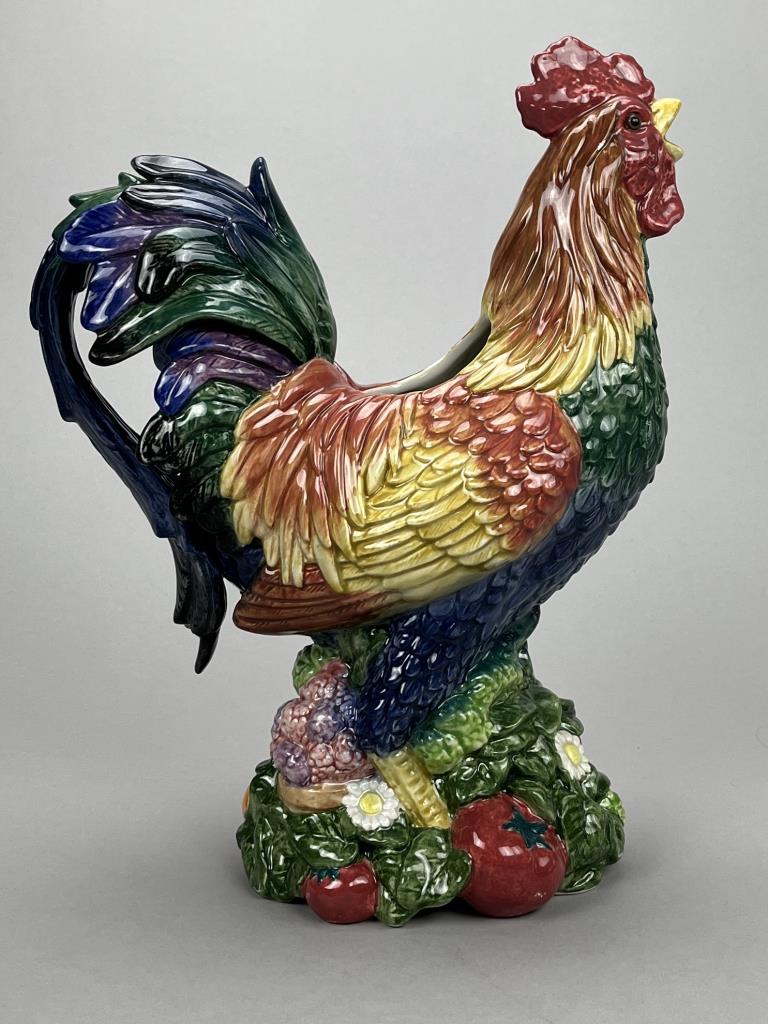 Glazed ceramic figural rooster pitcher, from the Coq Du Village series from Fitz & Floyd, dated 1996, marked on bottom, 12″ (H). CONDITION: One small chip near base. SHIPPING: In-House Shipping Available. Please read our Shipping Policies and Terms and Conditions
