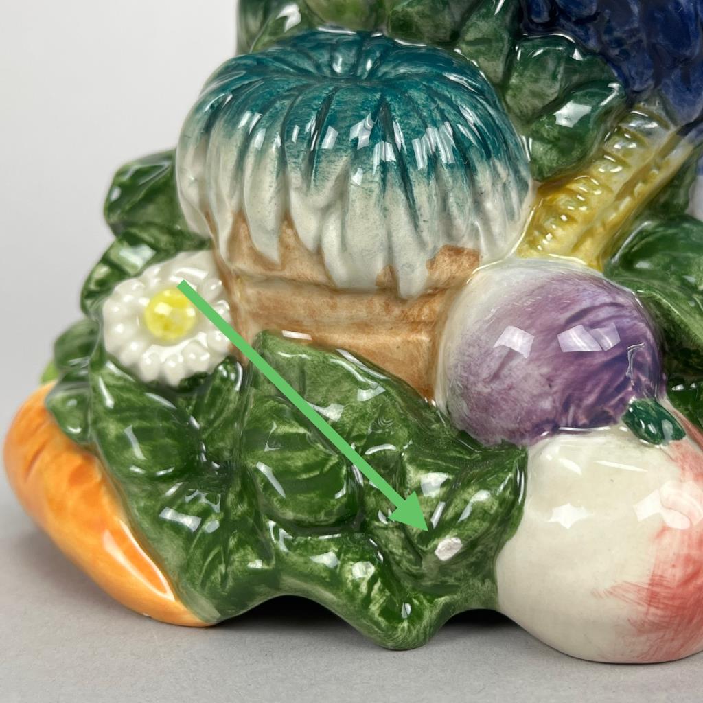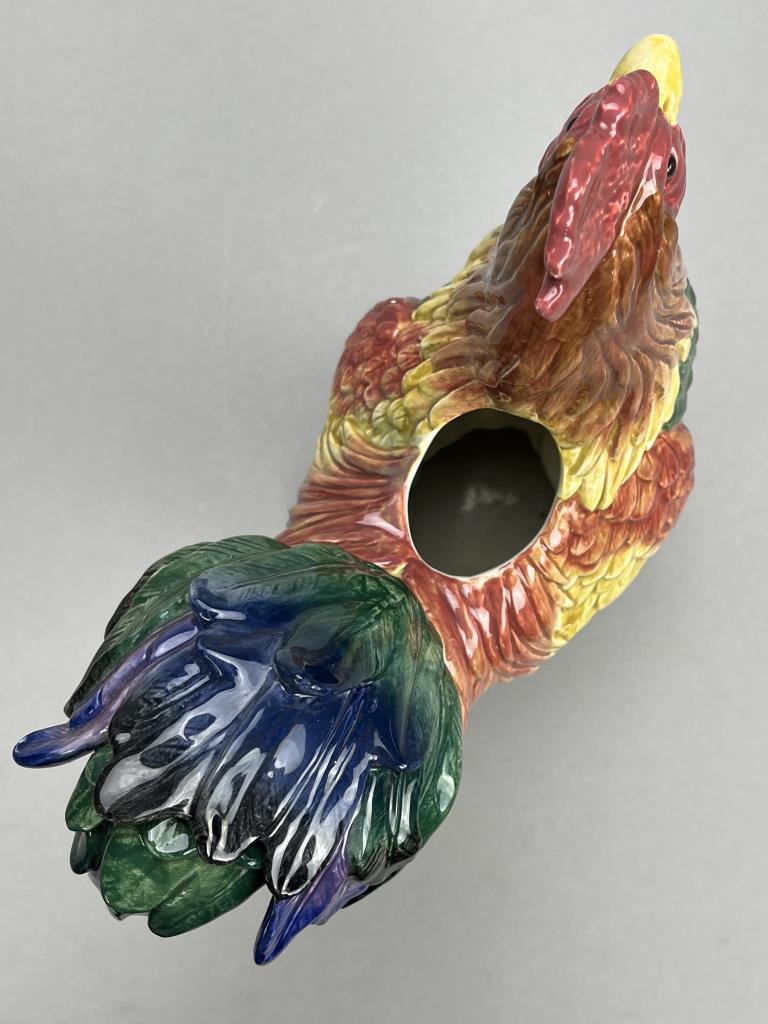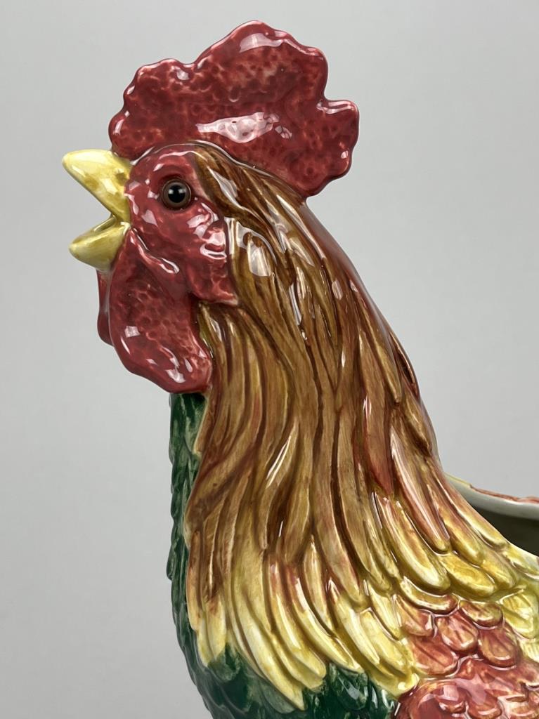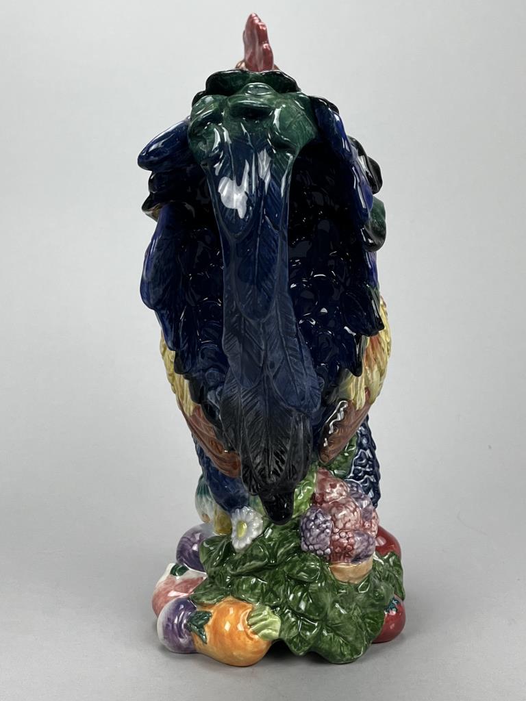 Glazed ceramic figural rooster pitcher, from the Coq Du Village series from Fitz & Floyd, dated 1996, marked on bottom, 12″ (H). CONDITION: One small chip near base. SHIPPING: In-House Shipping Available. Please read our Shipping Policies and Terms and Conditions