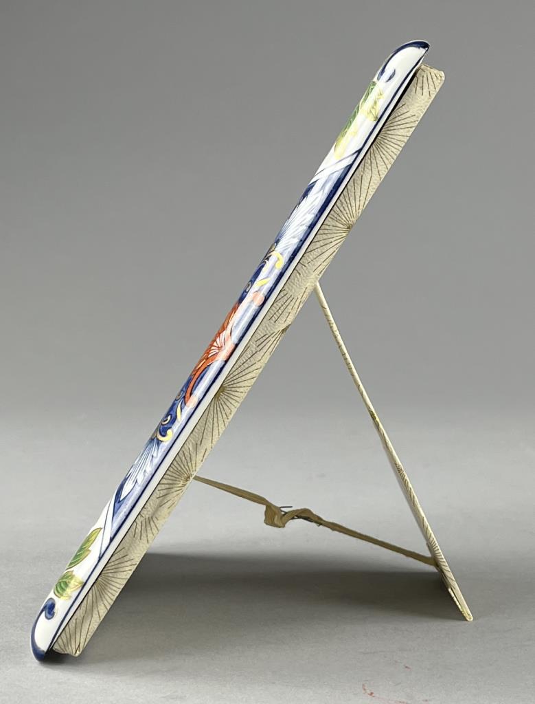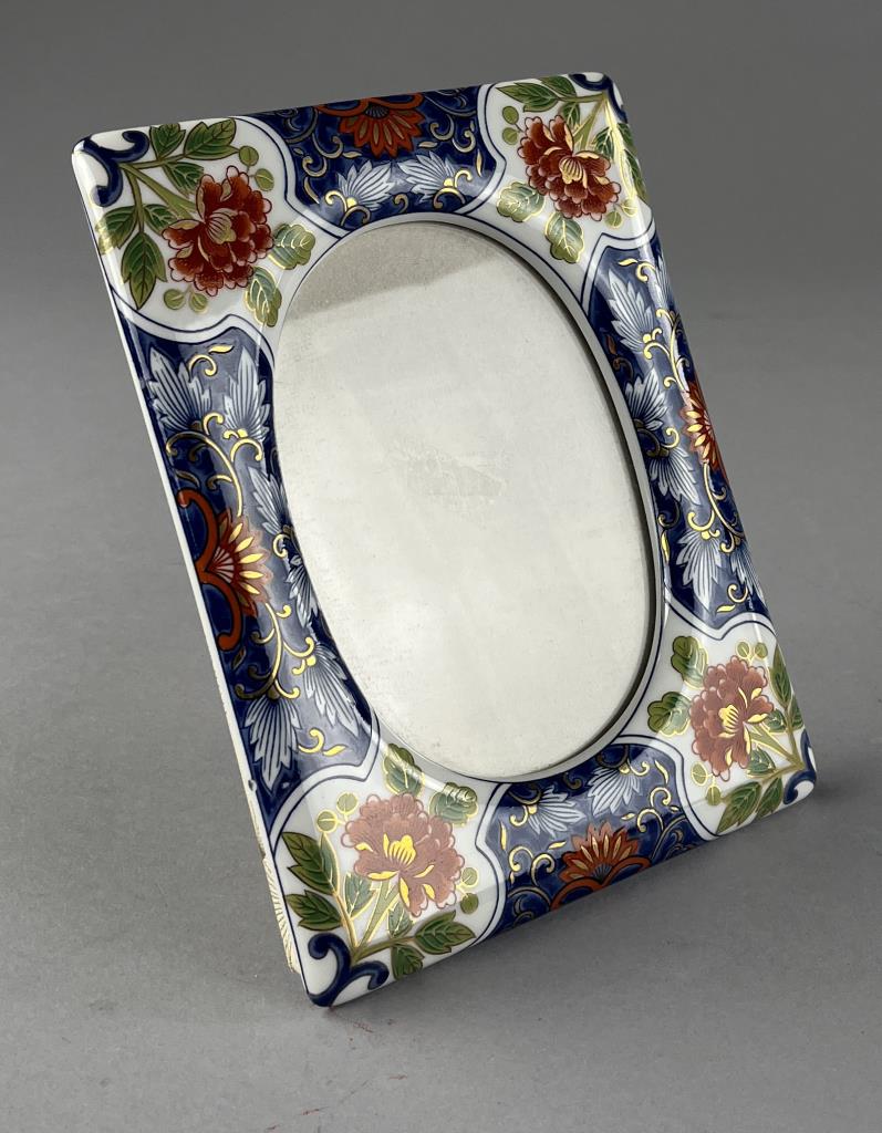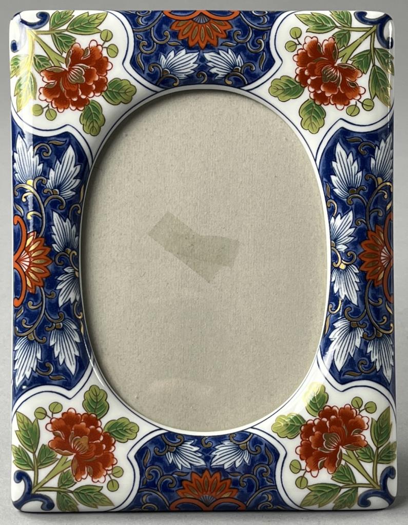 Japanese Imari picture frame, hand painted porcelain, paper label on back, mid to late 20th Century, overall frame size is approximately 6″ x 7-3/4″, while the opening size, or viewable area, is approximately 3-7/8″ x 5-7/16″, most like to accommodate a 4″x 6″ photo. CONDITION: SHIPPING: In-House Shipping Available. Please read our Shipping Policies and Terms and Conditions
