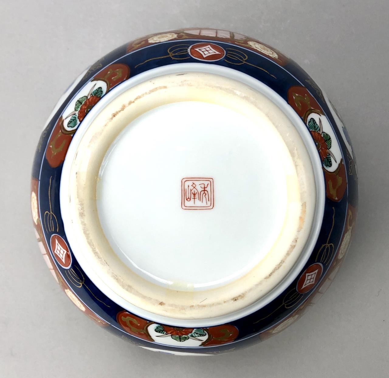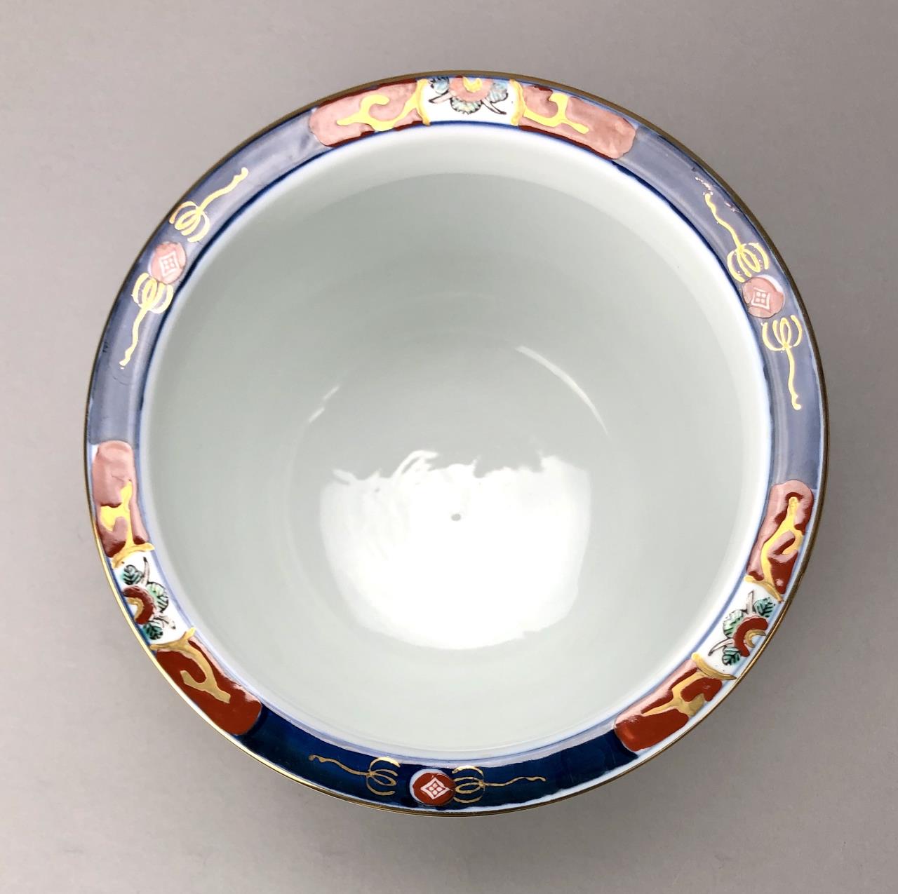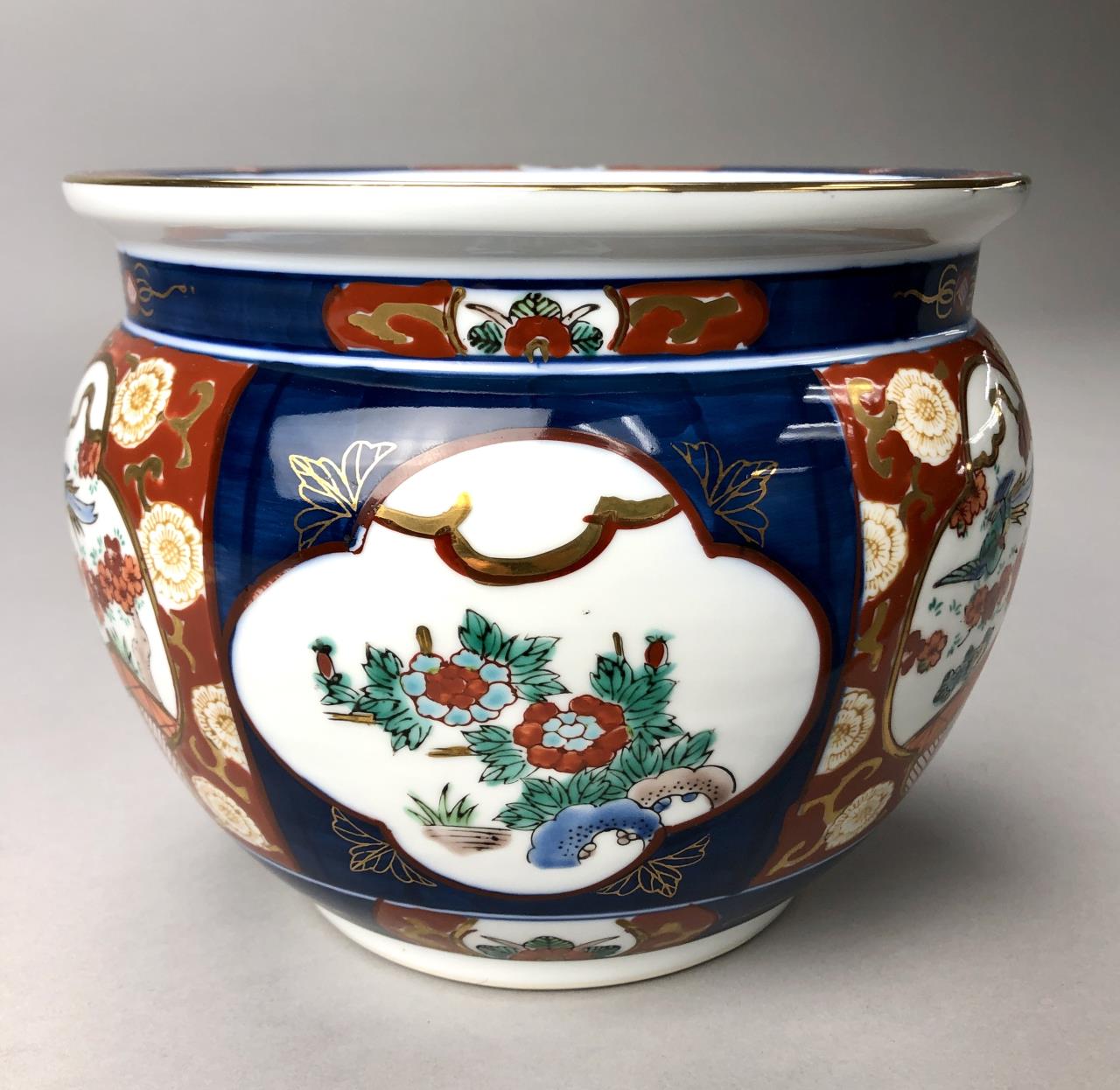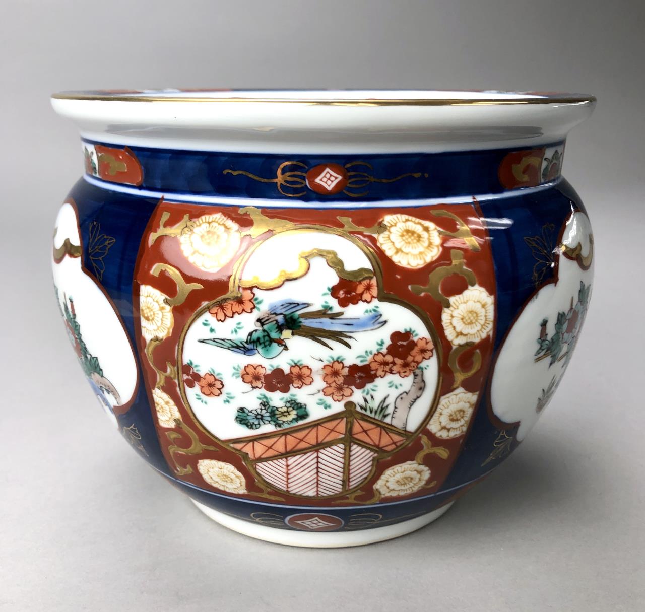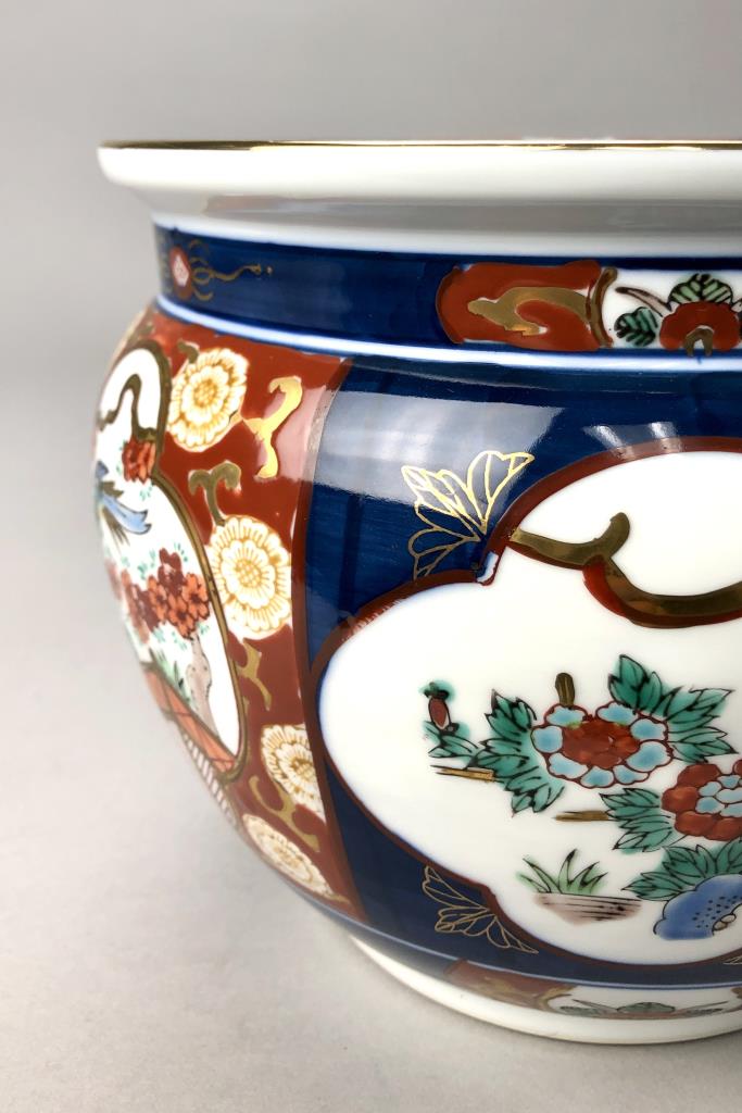 Japanese Imari jardiniere, hand painted porcelain, marked on bottom, mid to late 20th Century, 8-1/4″ D x 6-1/2″ H. CONDITION: SHIPPING: In-House Shipping Available. Please read our Shipping Policies and Terms and Conditions