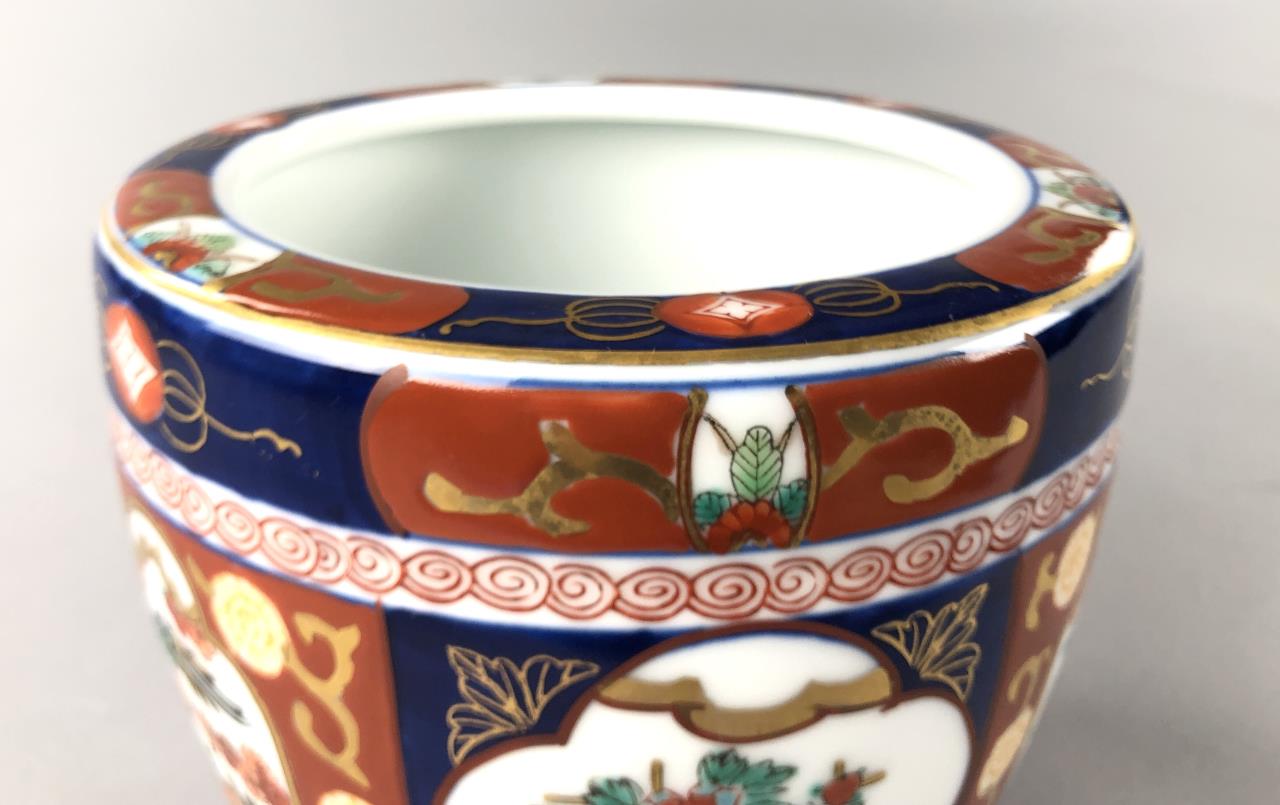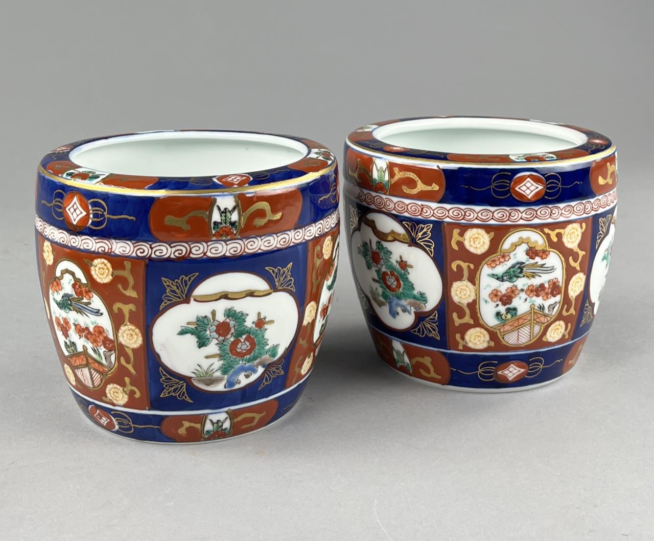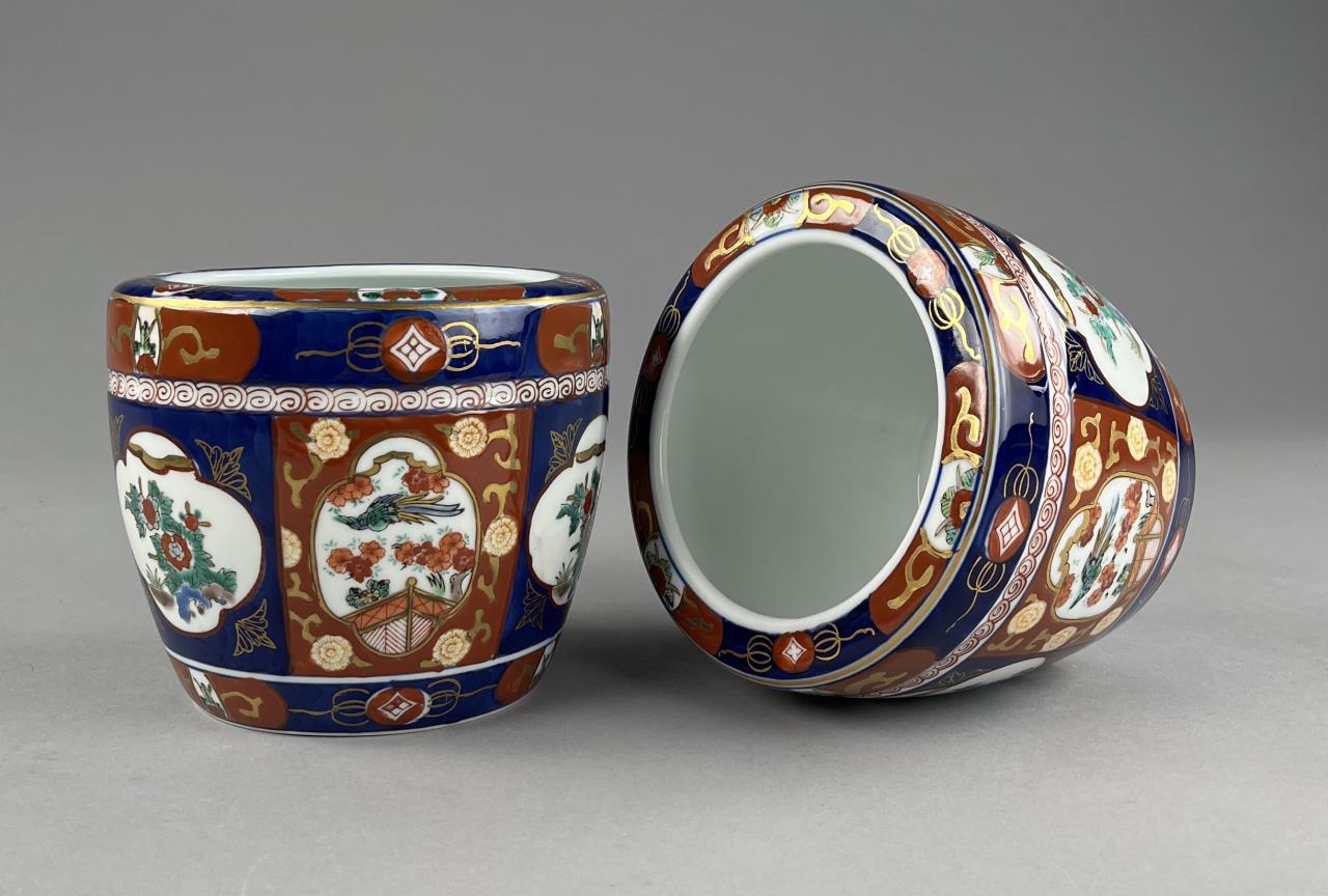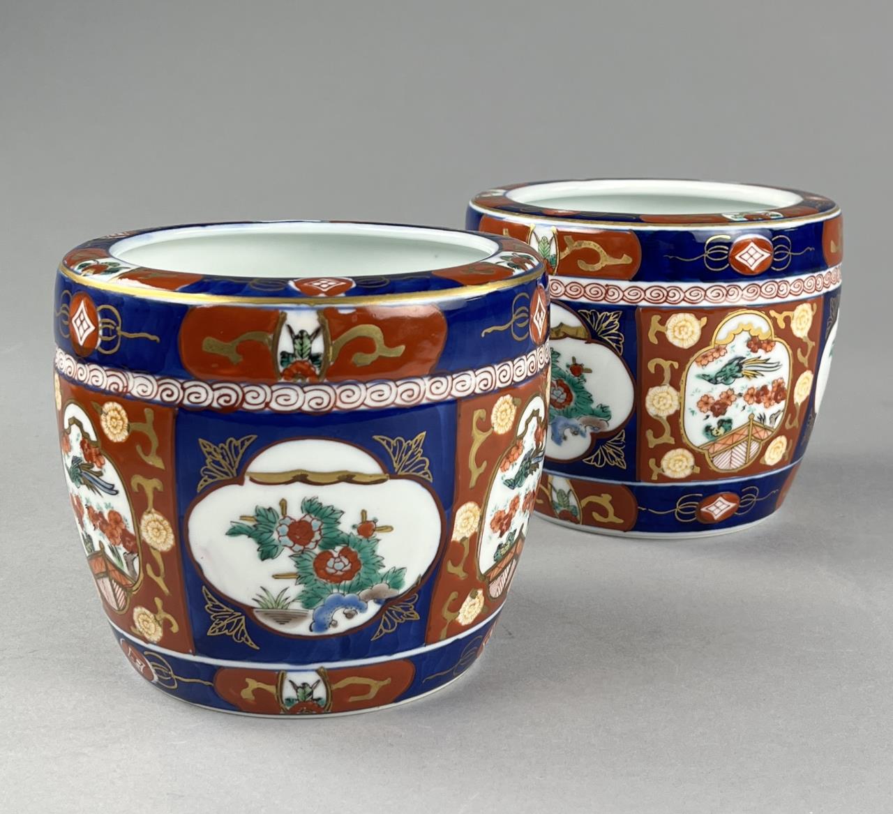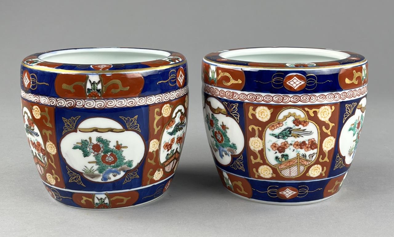 Assembled pair of Japanese Imari jardinieres, hand painted porcelain, marked on bottoms but with different marks, mid to late 20th Century, each approximately 6″ D x 5-1/8″ H. CONDITION: SHIPPING: In-House Shipping Available. Please read our Shipping Policies and Terms and Conditions