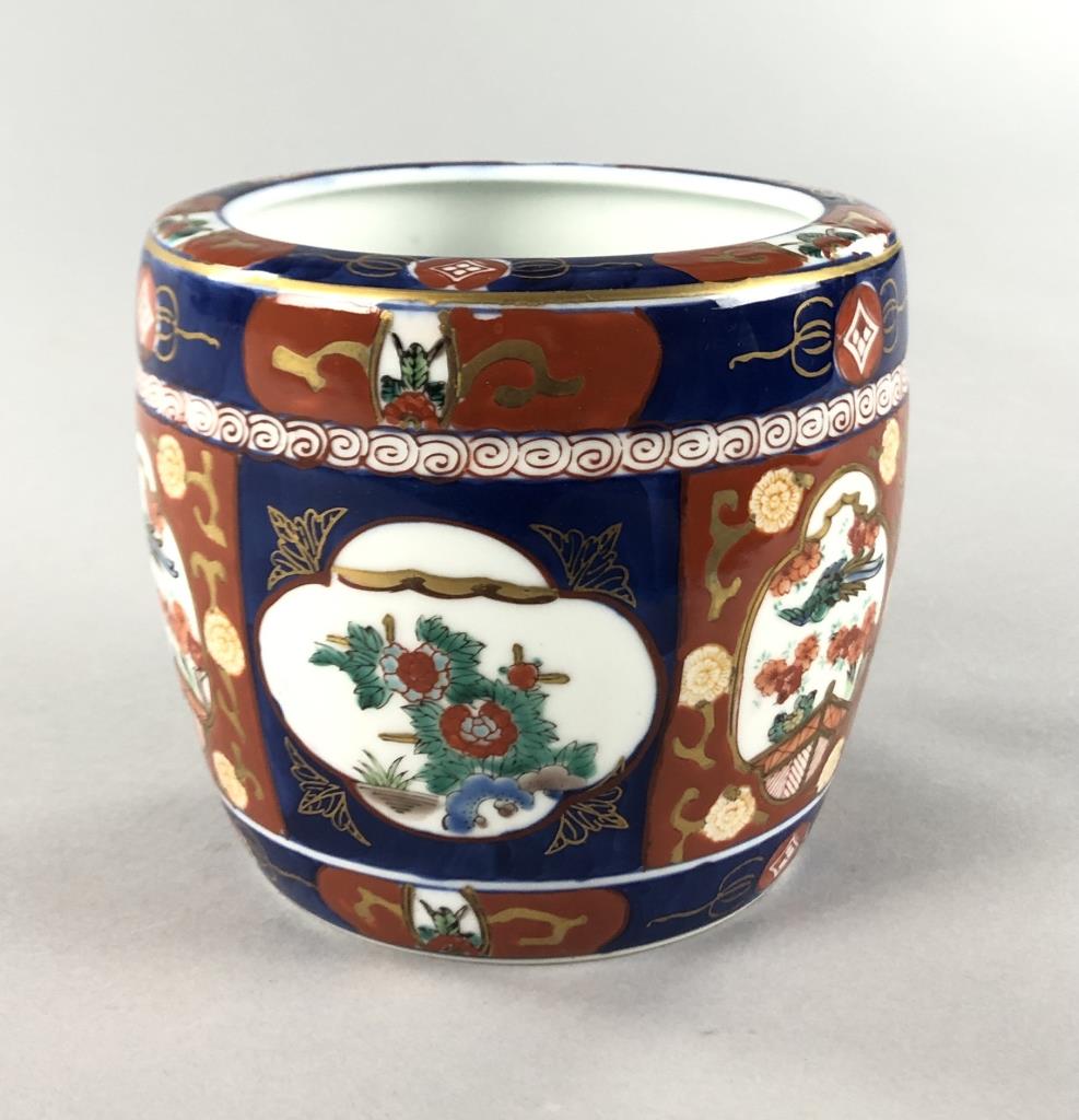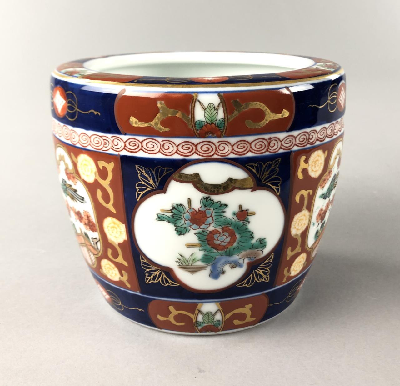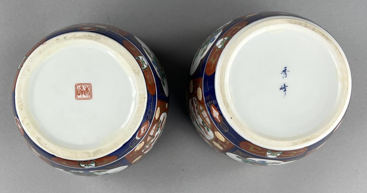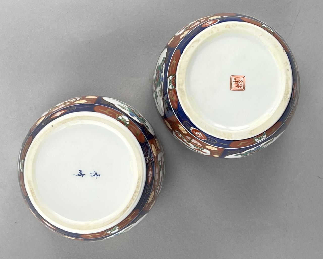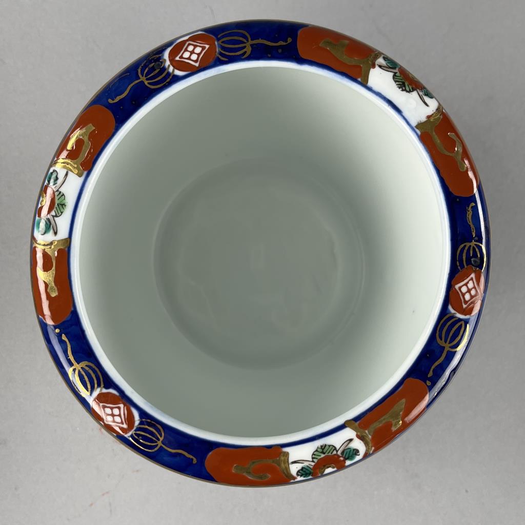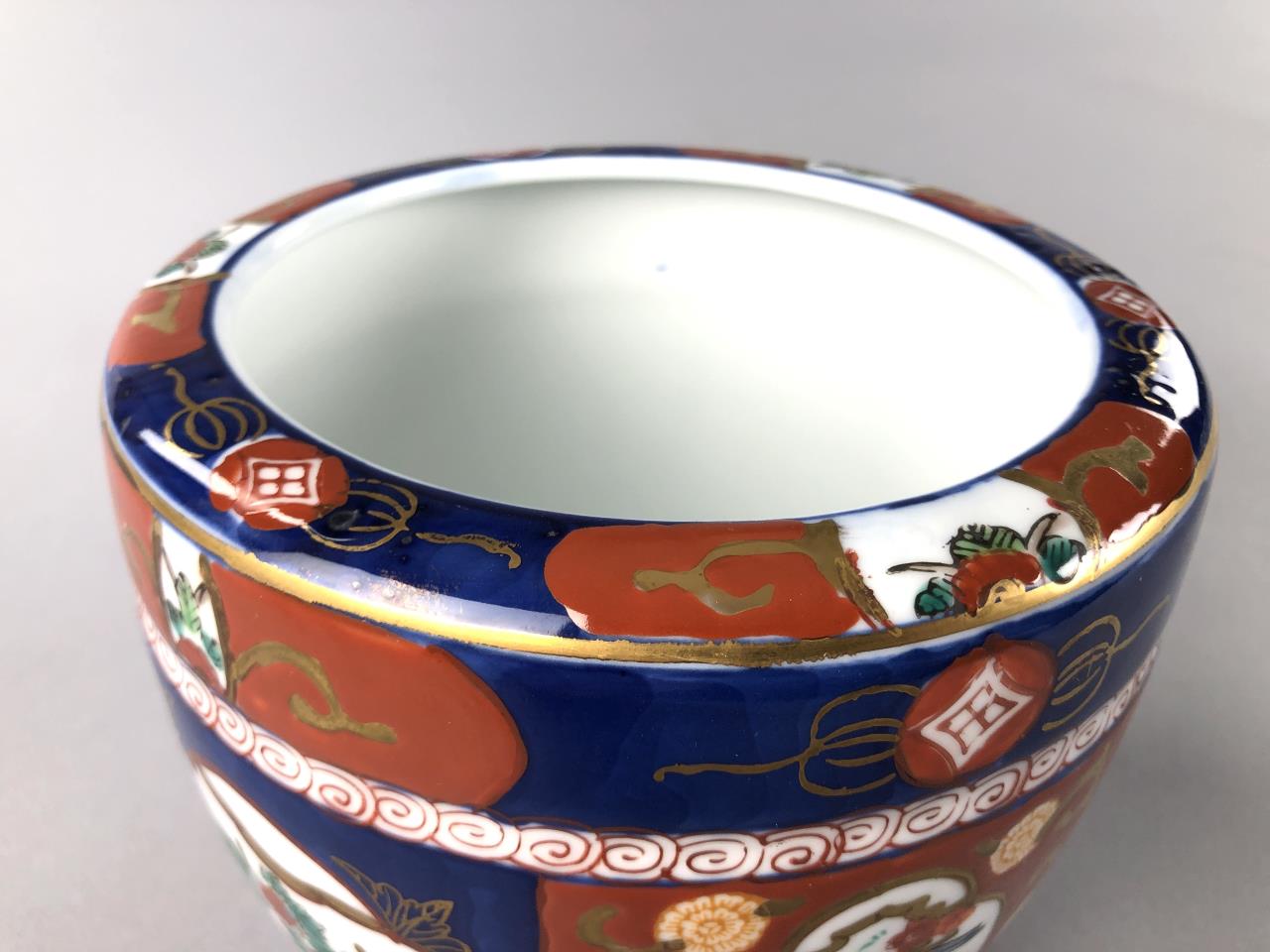 Assembled pair of Japanese Imari jardinieres, hand painted porcelain, marked on bottoms but with different marks, mid to late 20th Century, each approximately 6″ D x 5-1/8″ H. CONDITION: SHIPPING: In-House Shipping Available. Please read our Shipping Policies and Terms and Conditions
