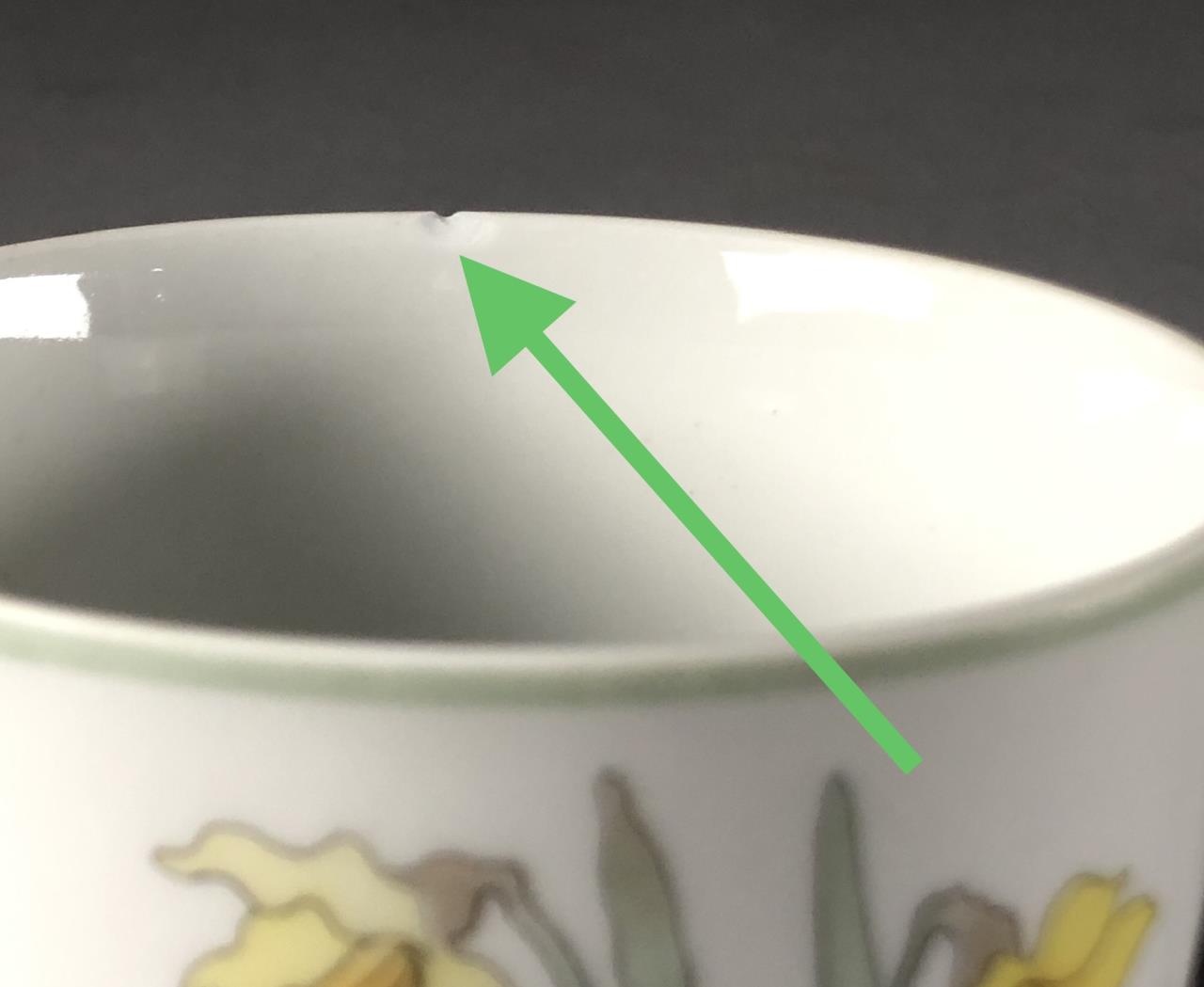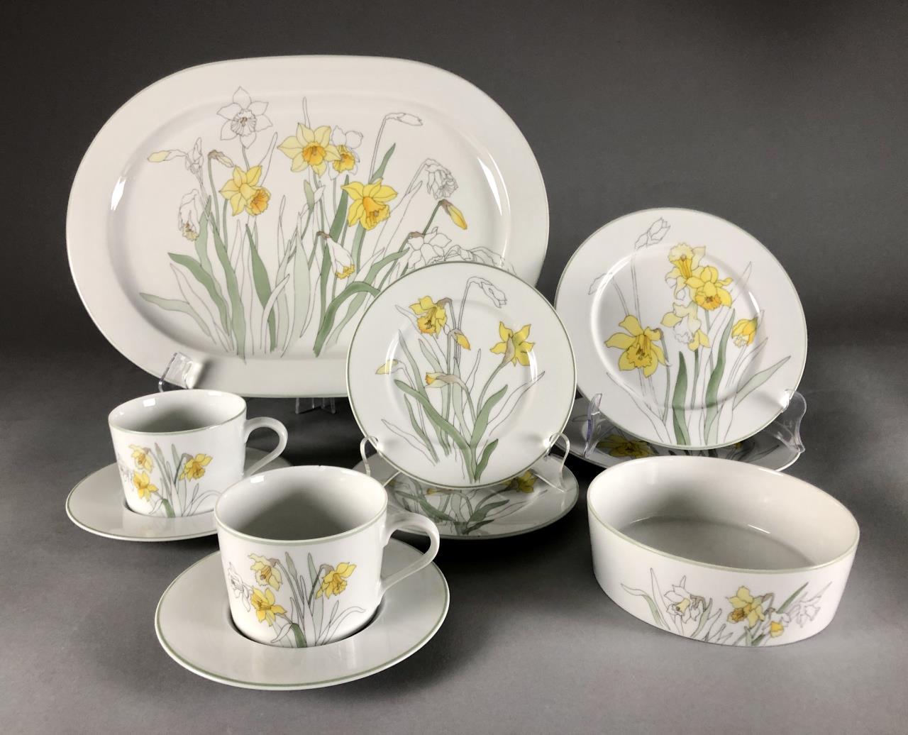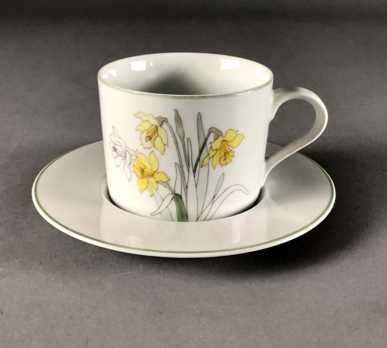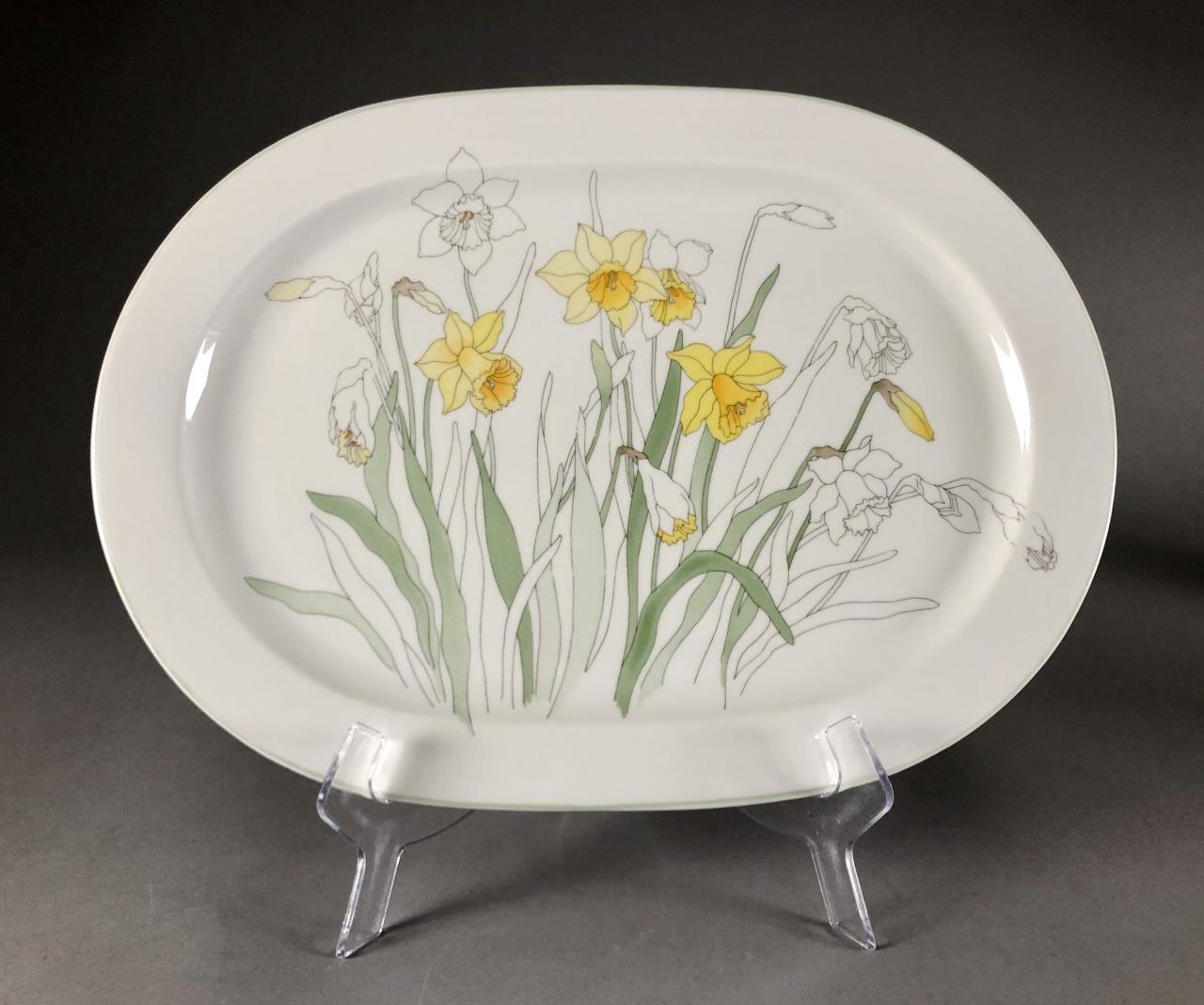 Ten pieces of Mid Century Modern, Block China (Portugal), in the “Daffodil” pattern (introduced in 1983 and discontinued in 1996), from the Watercolors series, by Mary Lou Goertzen (American, 1929 – 2020), includes: (2) 8″ salad plates; (2) 6-3/8″ bread and butter plates; (2) flat cup and saucer sets; (1) 5-7/8″ coupe cereal bowl; and (1) 15″ (15-1/2″) oval serving platter. CONDITION: Some pieces show signs of use and wear such as knife scratches and loss of pattern in some areas. One cup is chipped and both saucers are chipped, please see last three photos. SHIPPING: In-House Shipping Available. Please read our Shipping Policies and Terms and Conditions