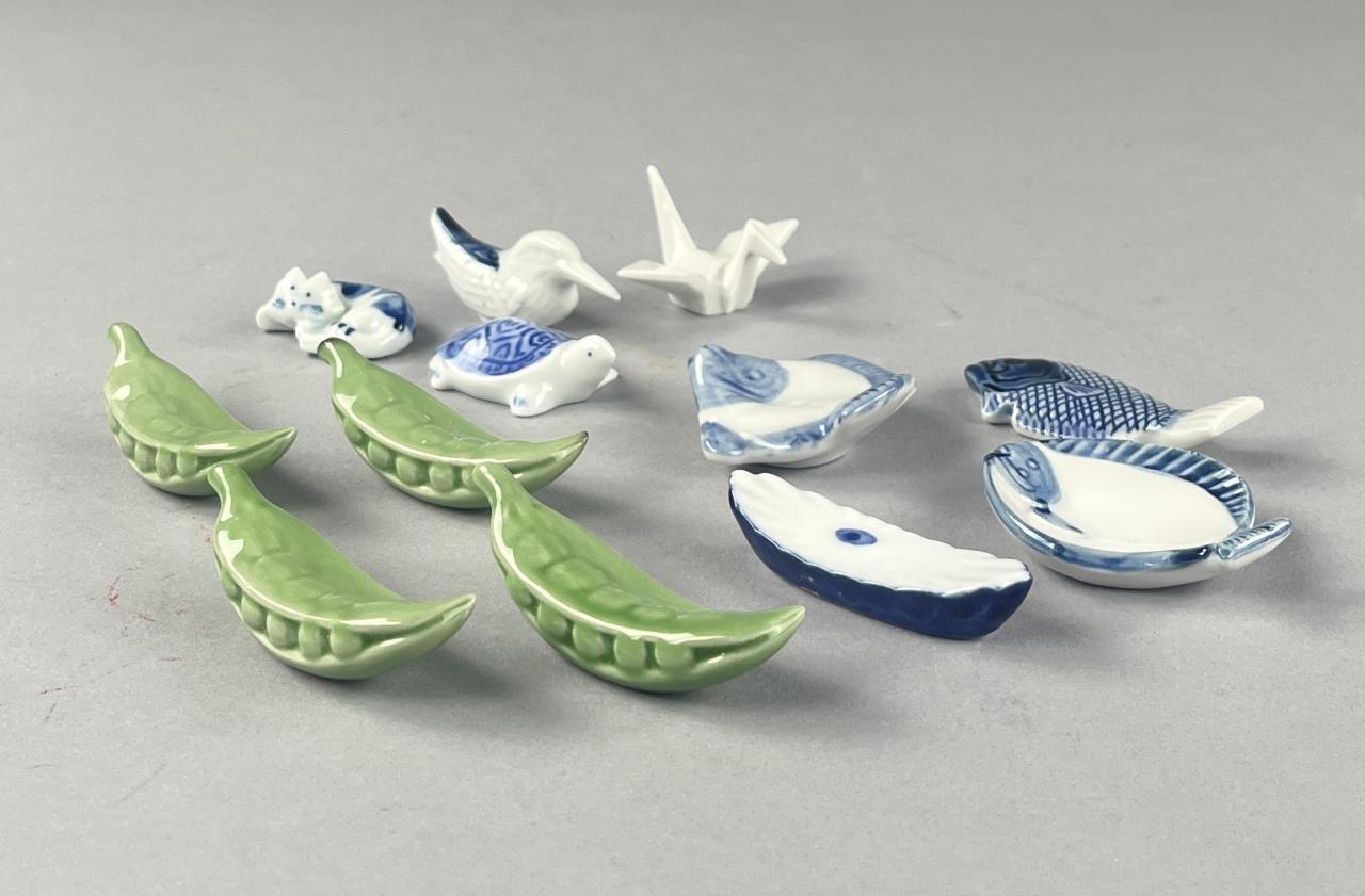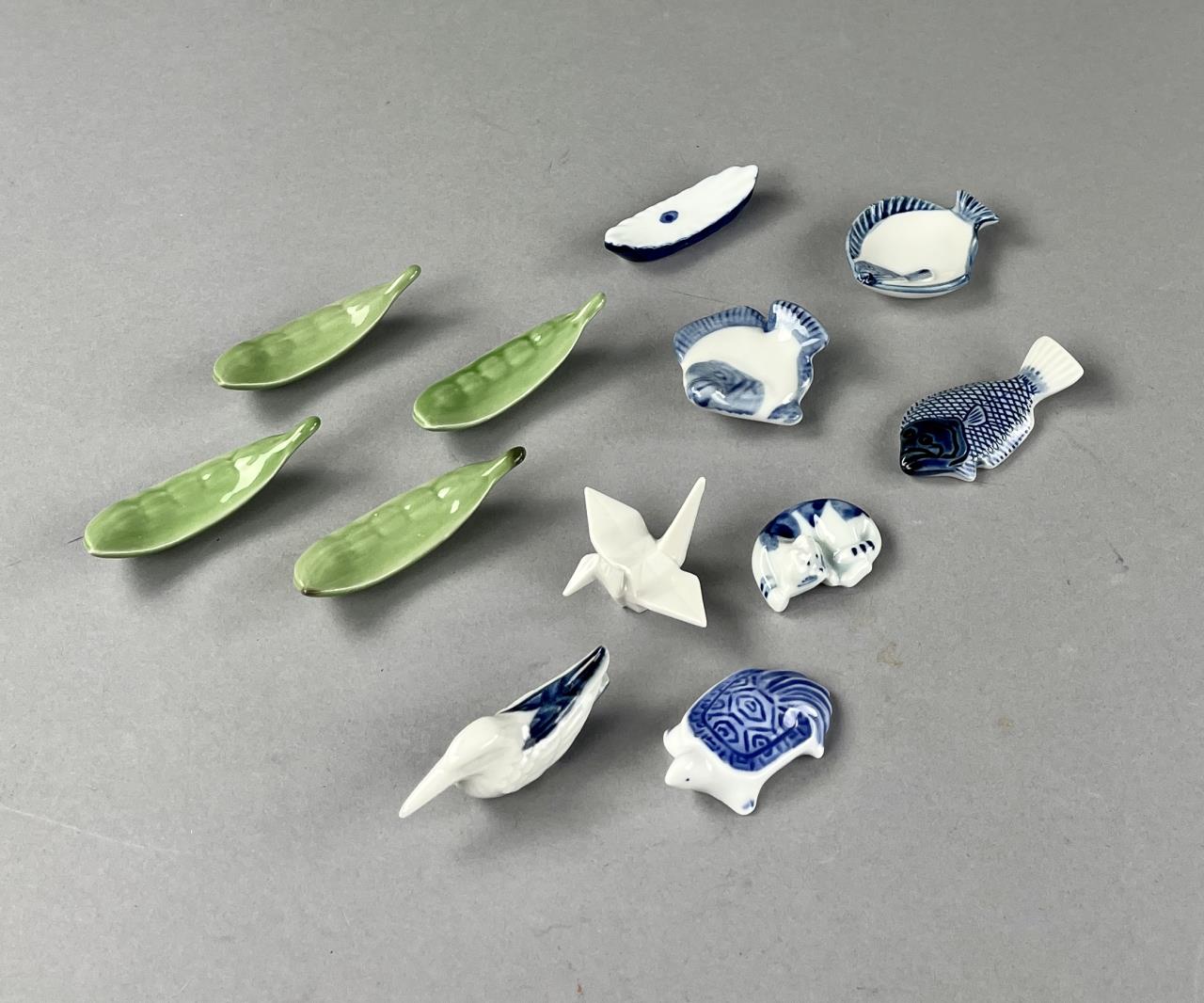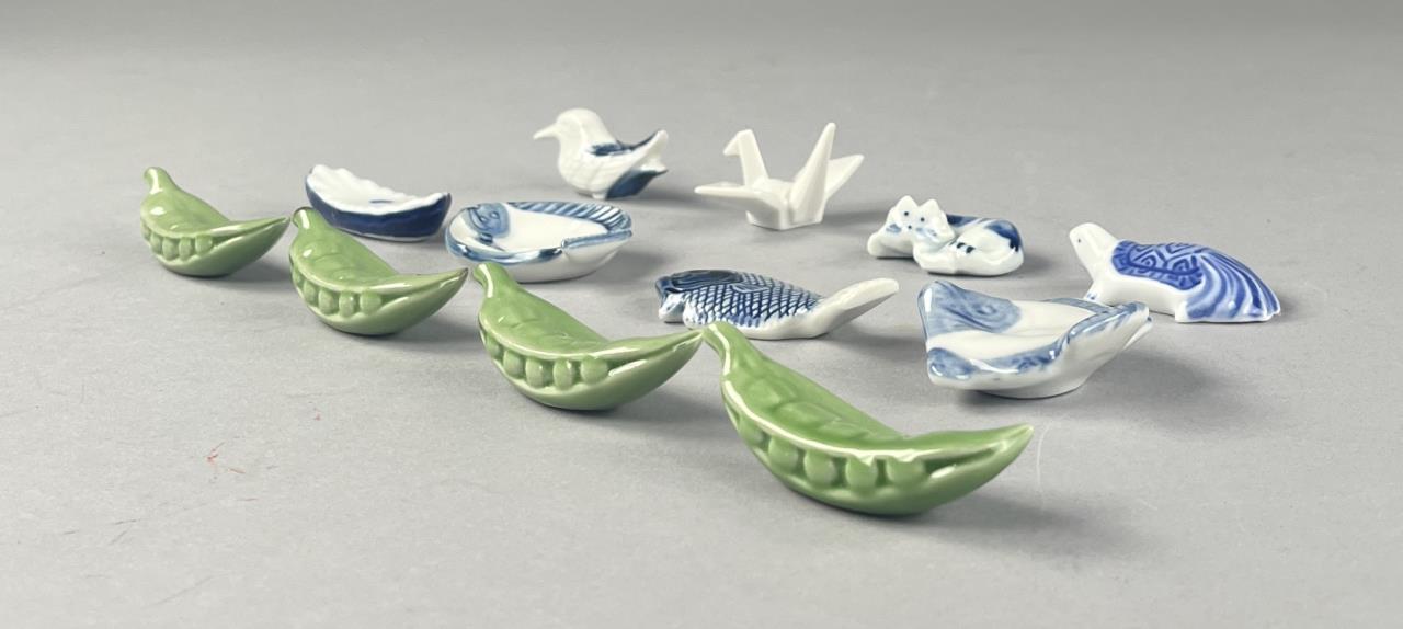 Twelve Japanese glazed ceramic Hashioki or chopstick rests, in various figural forms including a cat, turtle, crane, carp, flounder fish, pea pods, and more. CONDITION: SHIPPING: In-House Shipping Available. Please read our Shipping Policies and Terms and Conditions