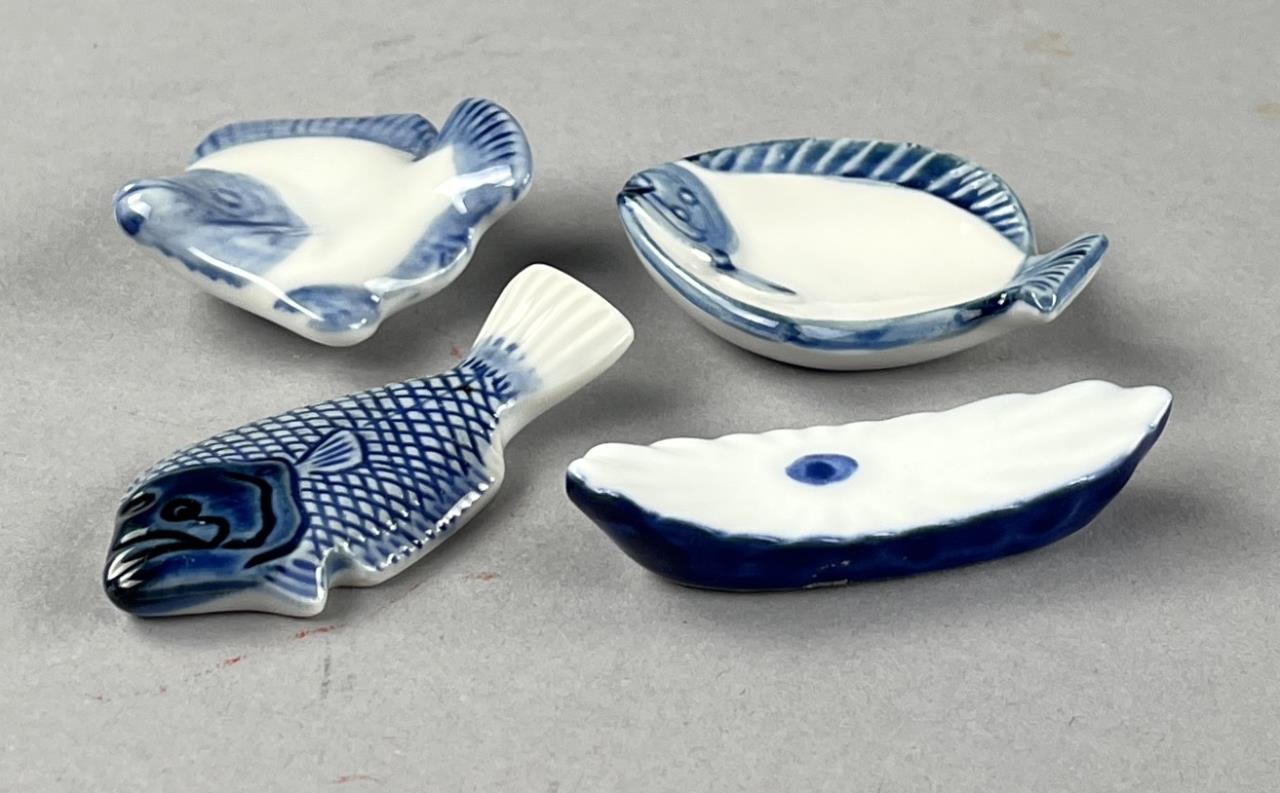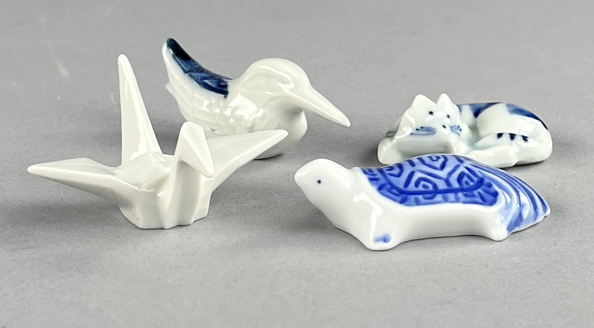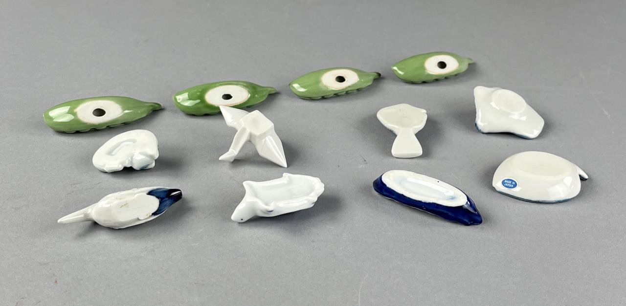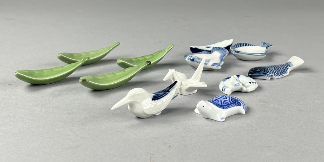 Twelve Japanese glazed ceramic Hashioki or chopstick rests, in various figural forms including a cat, turtle, crane, carp, flounder fish, pea pods, and more. CONDITION: SHIPPING: In-House Shipping Available. Please read our Shipping Policies and Terms and Conditions