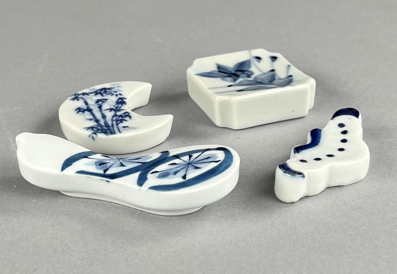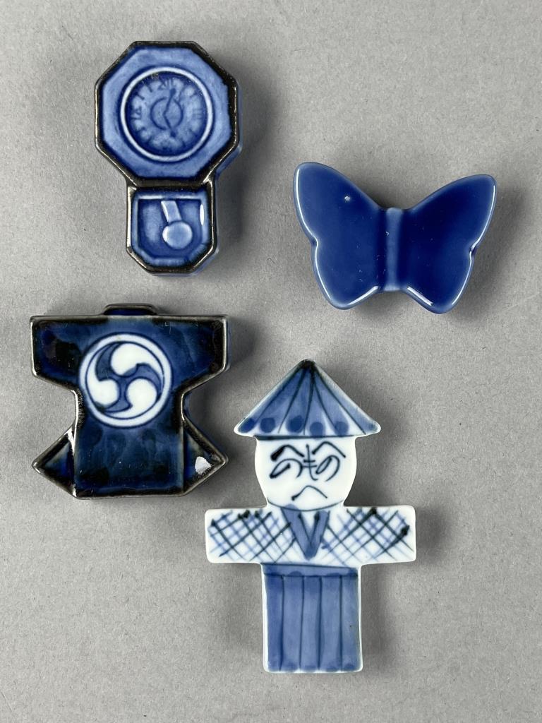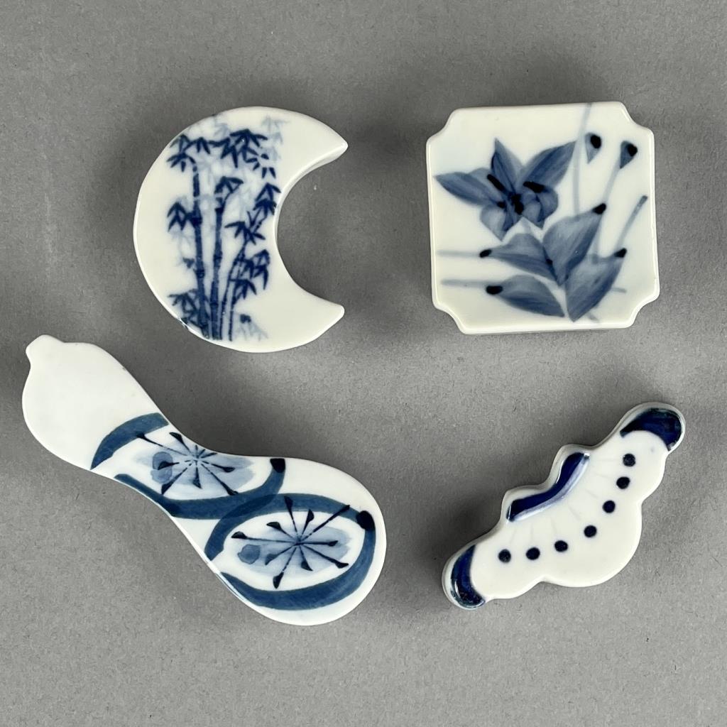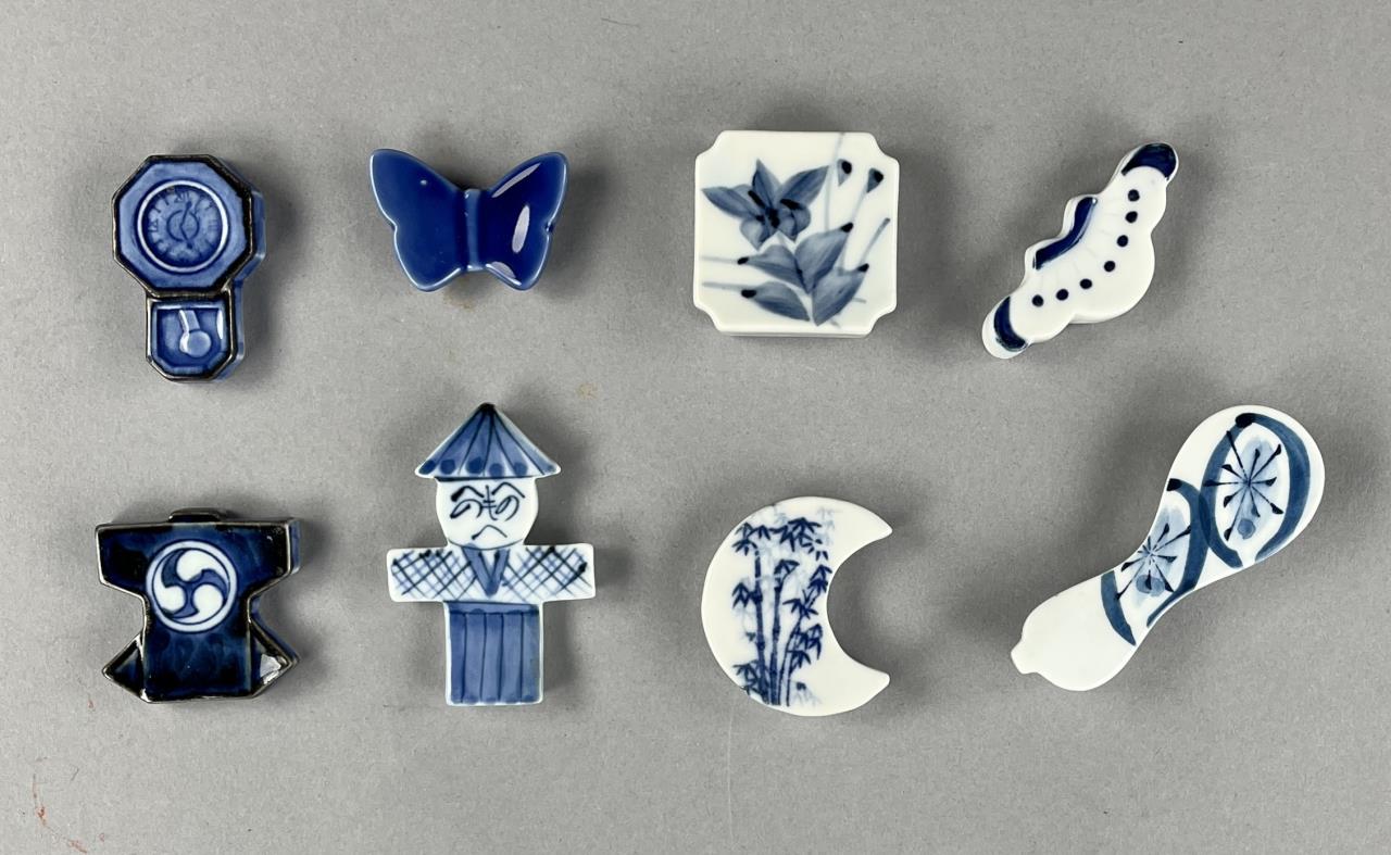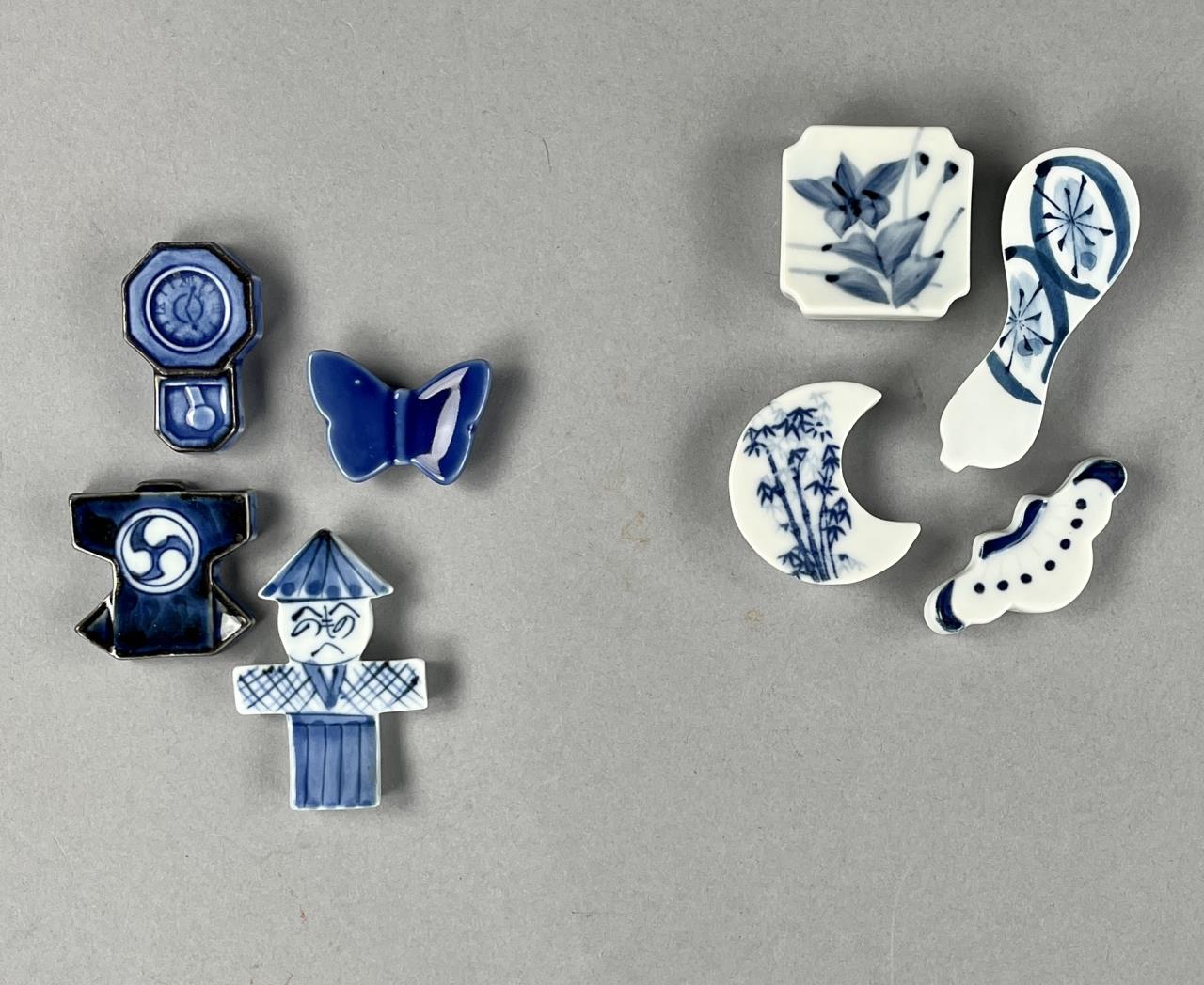 Eight Japanese figural blue and white glazed ceramic Hashioki or chopstick rests. CONDITION: SHIPPING: In-House Shipping Available. Please read our Shipping Policies and Terms and Conditions