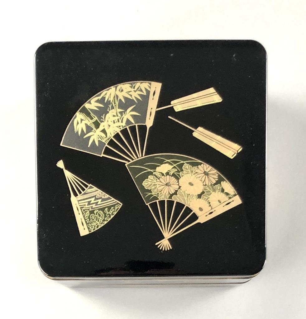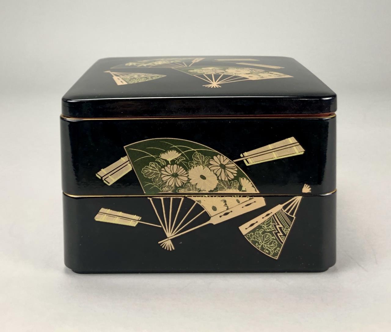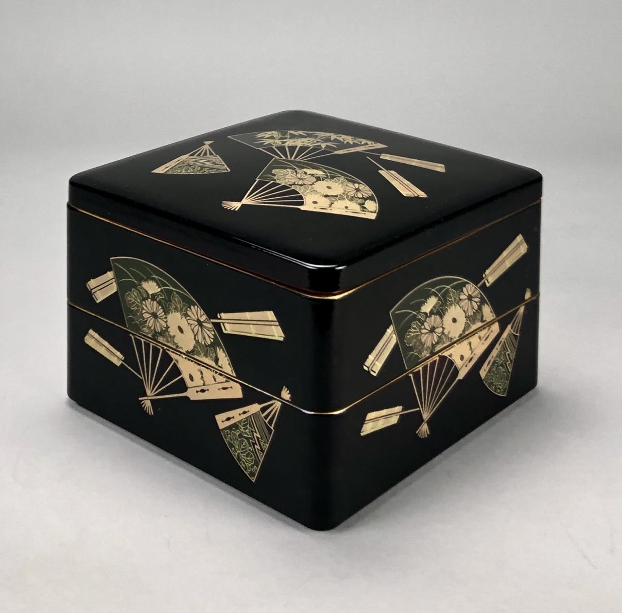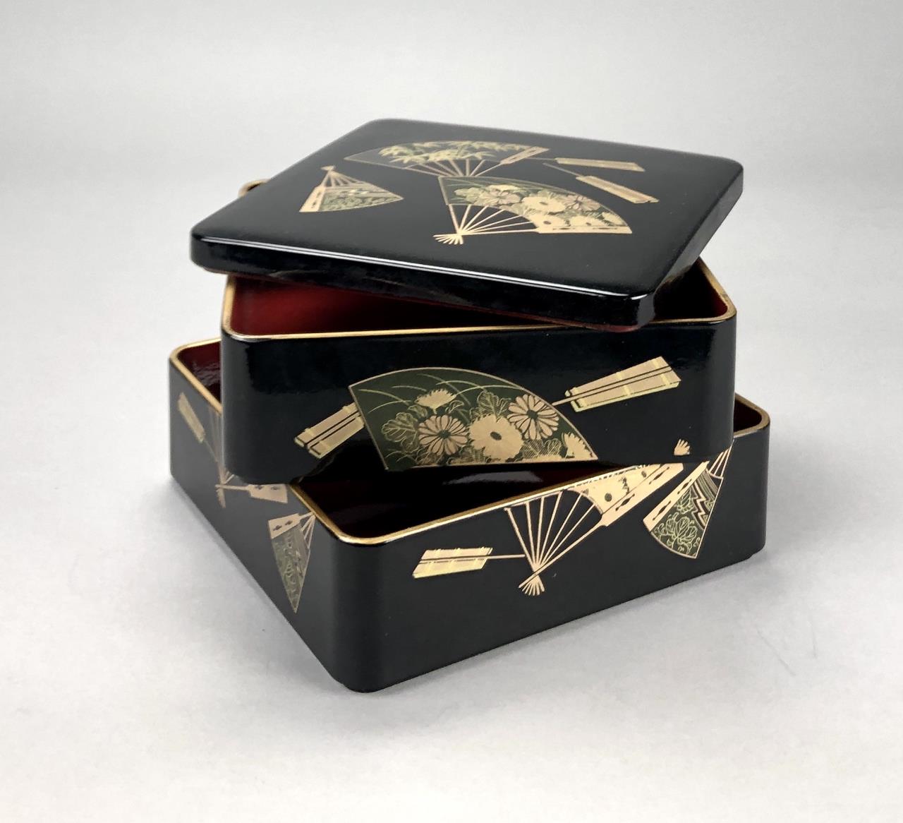 Japanese lacquered Jubako, two-tiered box, with folding fan decoration, mid to late 20th Century, 7-11/16″ x 7-11/16″ x 5-1/8″. CONDITION: SHIPPING: In-House Shipping Available. Please read our Shipping Policies and Terms and Conditions